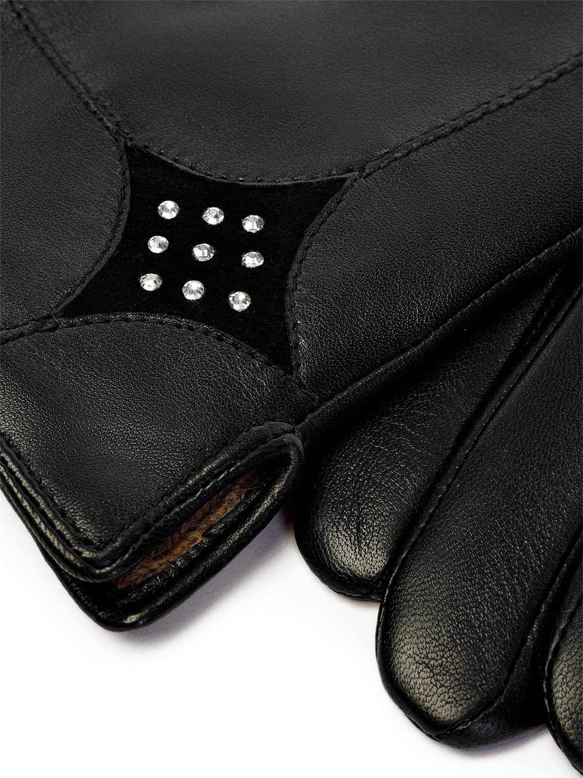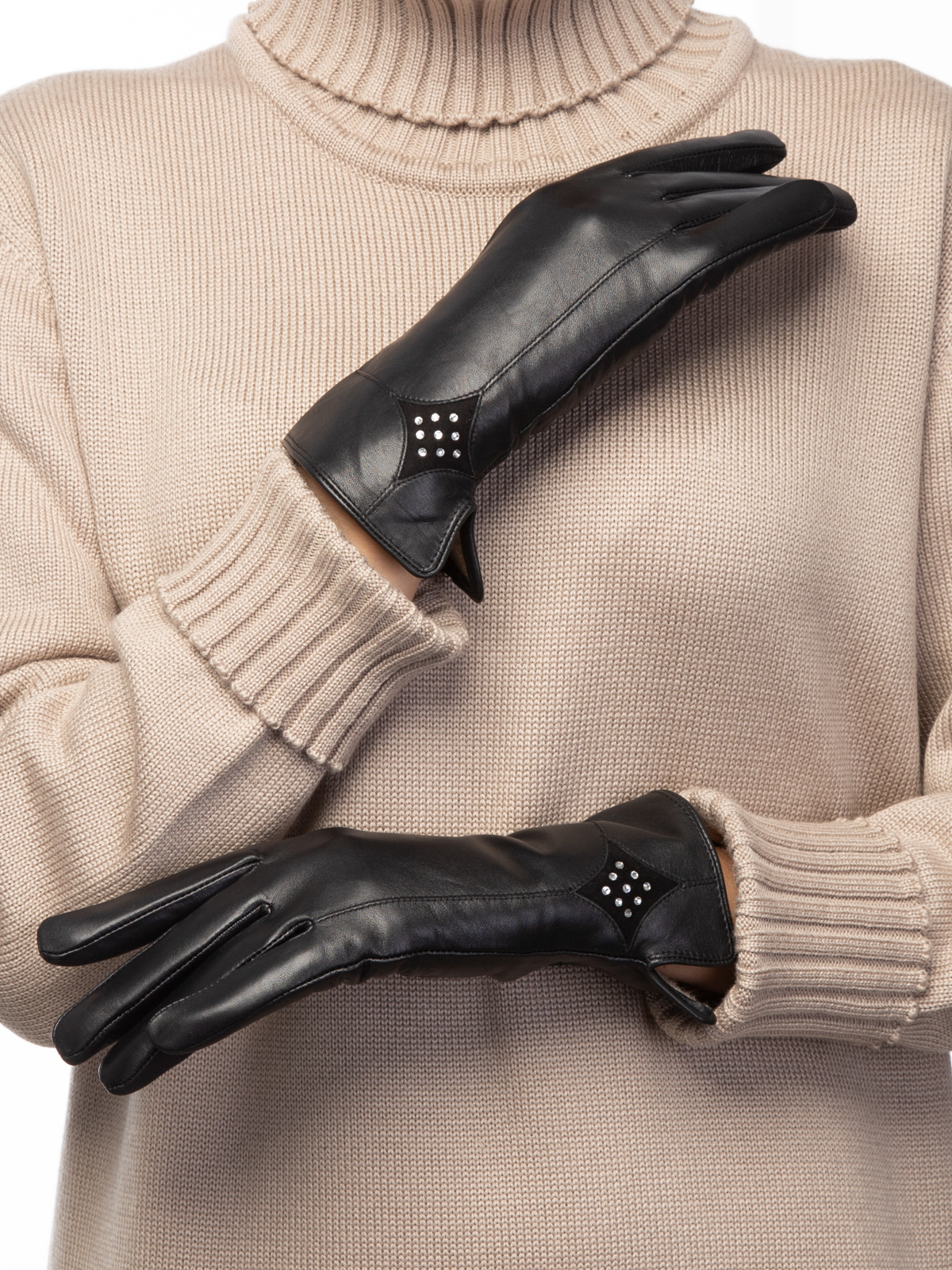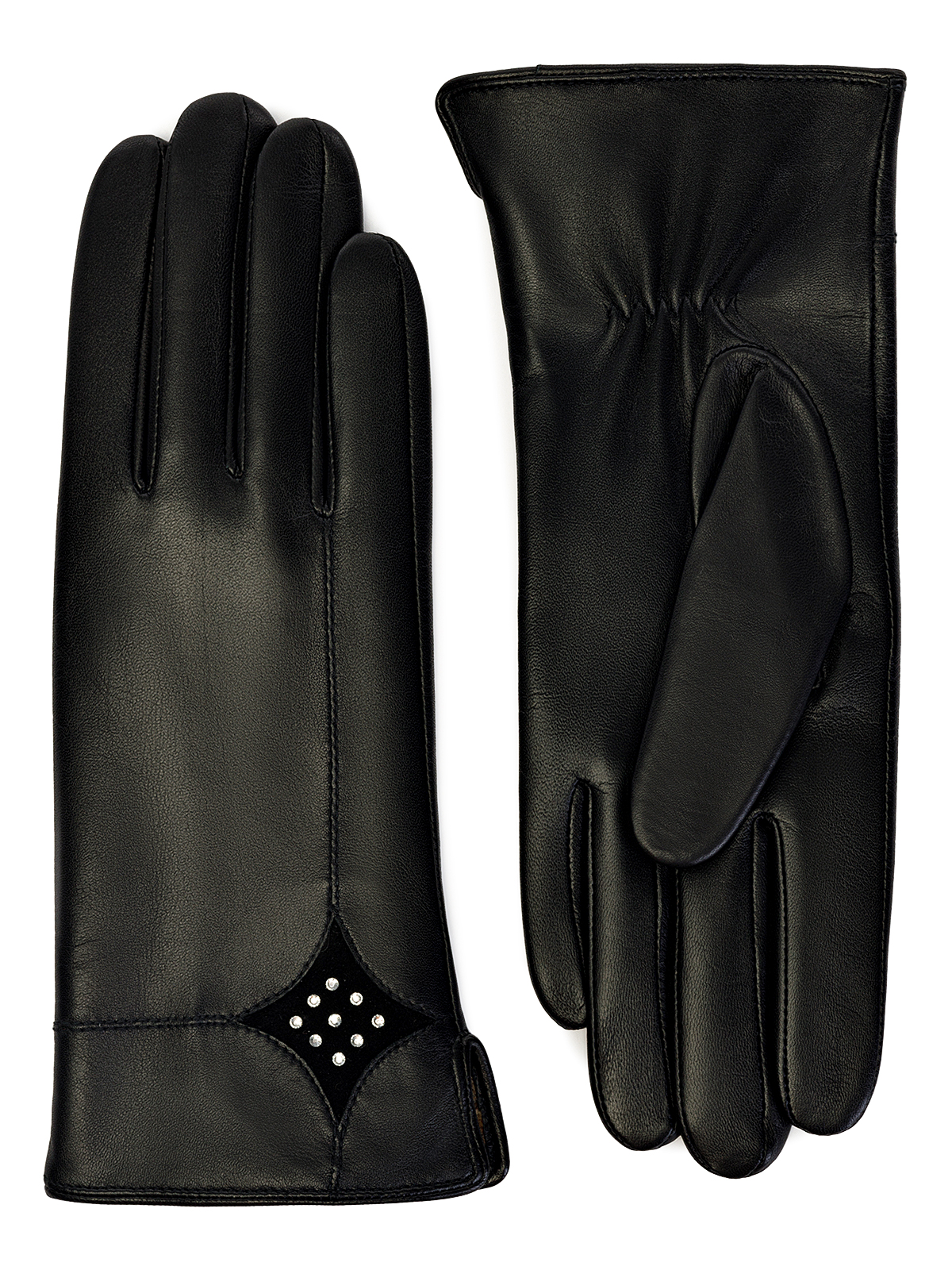 Перчатки женские торговой марки LABBRA производства Китай. Выполнены из натуральной кожи ягненка. Подкладка - 70% шерсть 30% акрил. Декоративая вставка в форме ромба из велюра украшена белыми стразами. Длина манжеты от нижней точки большого пальца до края перчаток - 65 см. Длина пальцев - средняя.