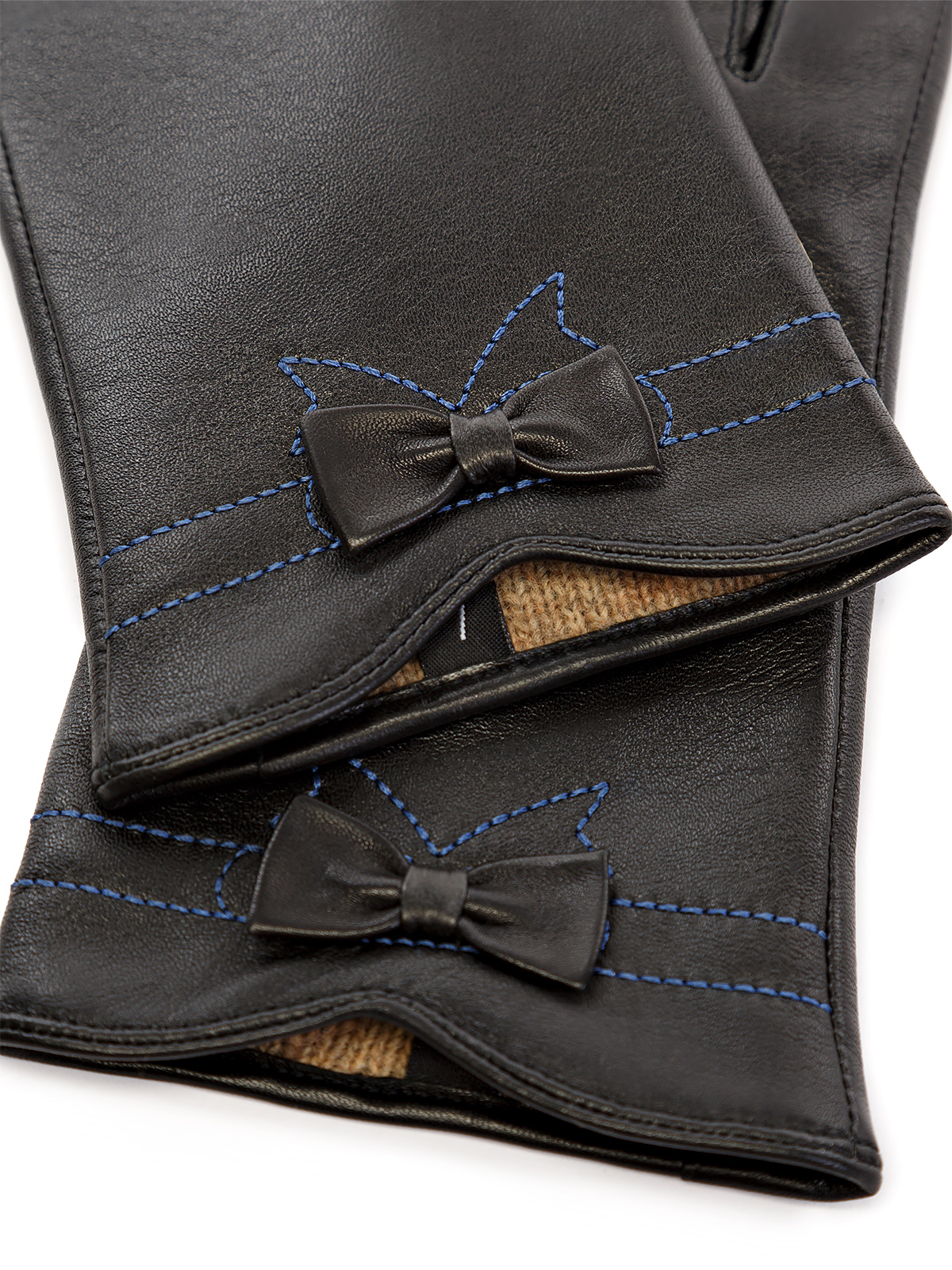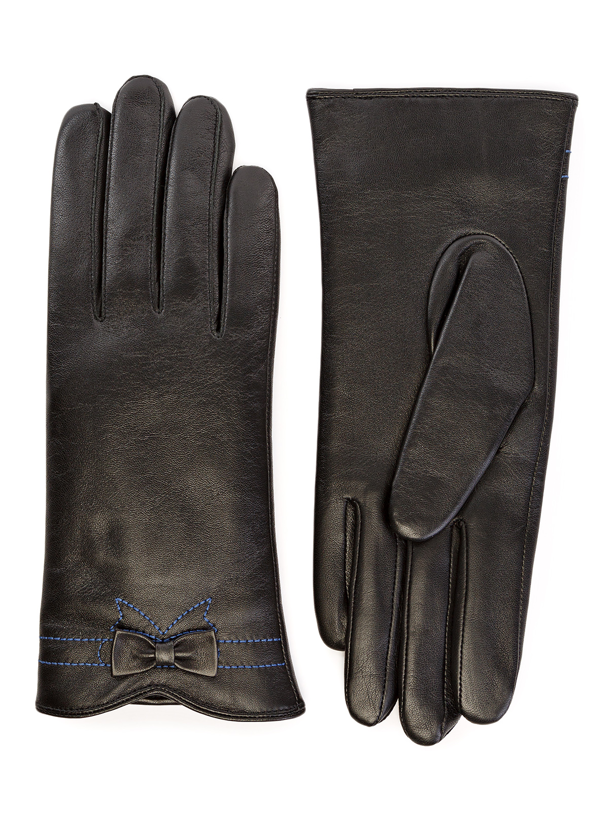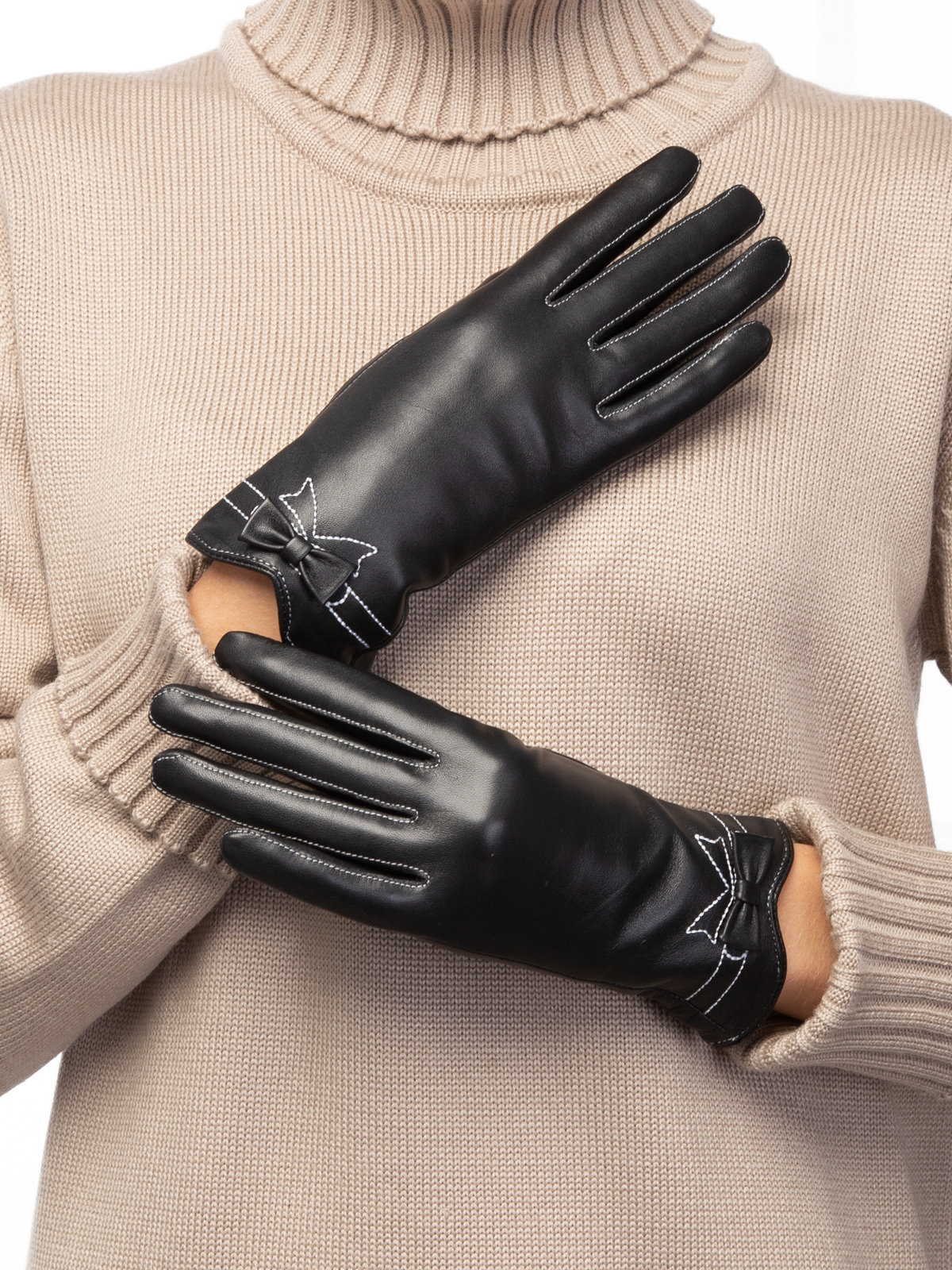Перчатки женские торговой марки LABBRA производства Китай. Выполнены из натуральной кожи ягненка. Подкладка - 70% шерсть 30% акрил. Отделка - отстрочка ниткой контрастного цвета в форме банта. Длина манжеты от нижней точки большого пальца до края перчаток - 5 см. Длина пальцев - средняя.