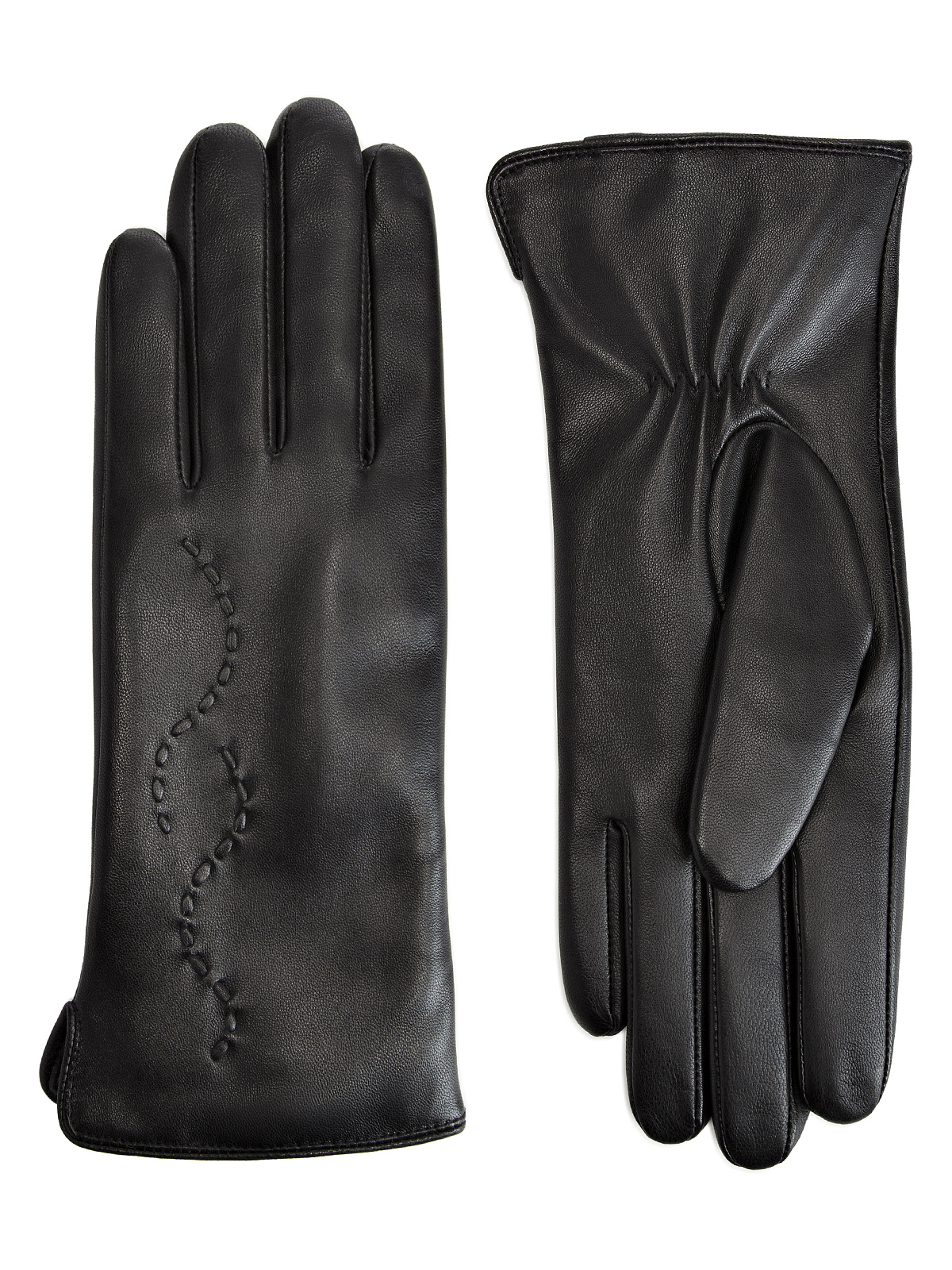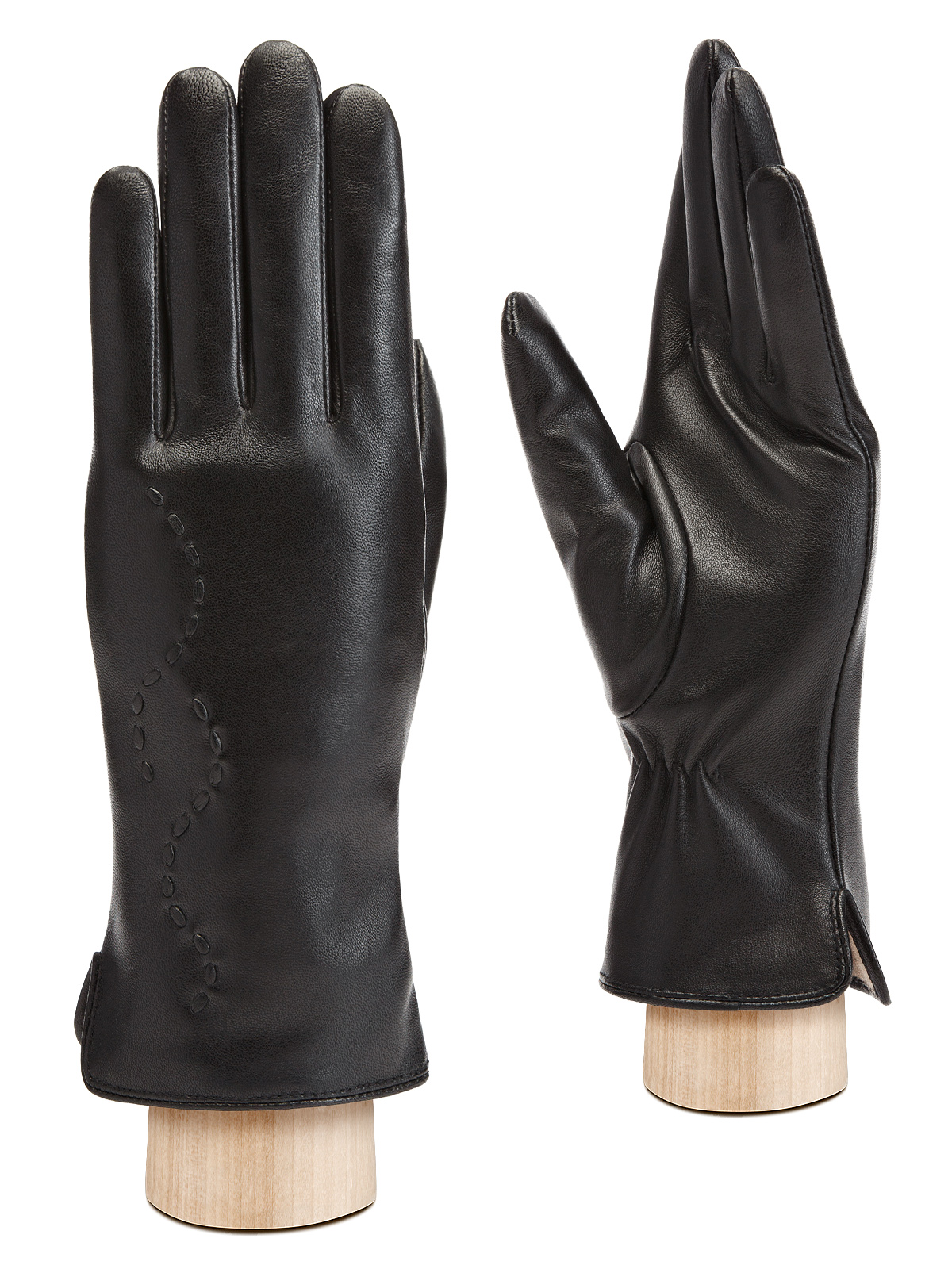 Перчатки торговой марки LABBRA из натуральной кожи ягненка. Производитель Китай. Подкладка: 70% шерсть + 30% акрил. Отделка - декоративные волнообразные элементы из тонкого кожаного шнурка на лицевой части и разрез на боковой части манжеты. Длина манжеты от нижней точки большого пальца до края перчаток - 6 см. Длина пальцев - средняя.
