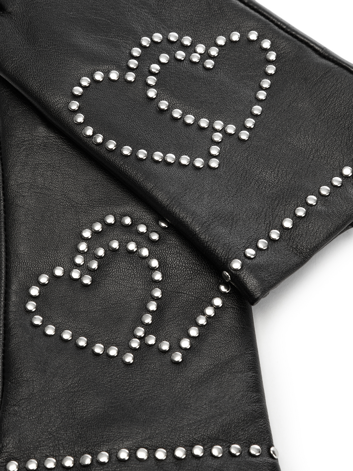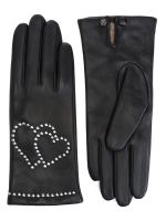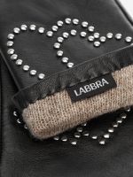 Перчатки торговой марки LABBRA из натуральной кожи ягненка. Производитель Китай. Подкладка: 70% шерсть + 30% акрил. Отделка - декор из хольнитенов в форме сердец на лицевой части. Манжета по горизонтальному краю так же украшена хольнитенами. Длина манжеты от нижней точки большого пальца до края перчаток - 65 см. Длина пальцев - средняя.
