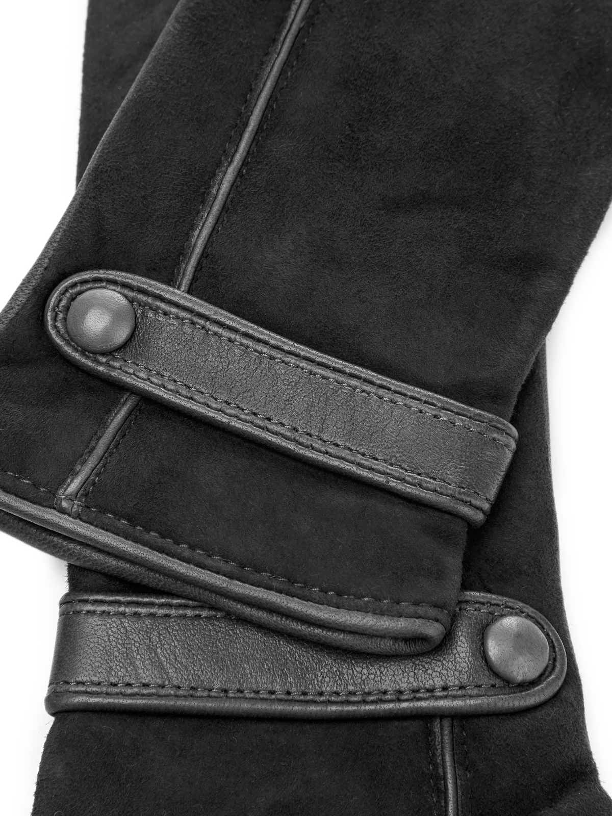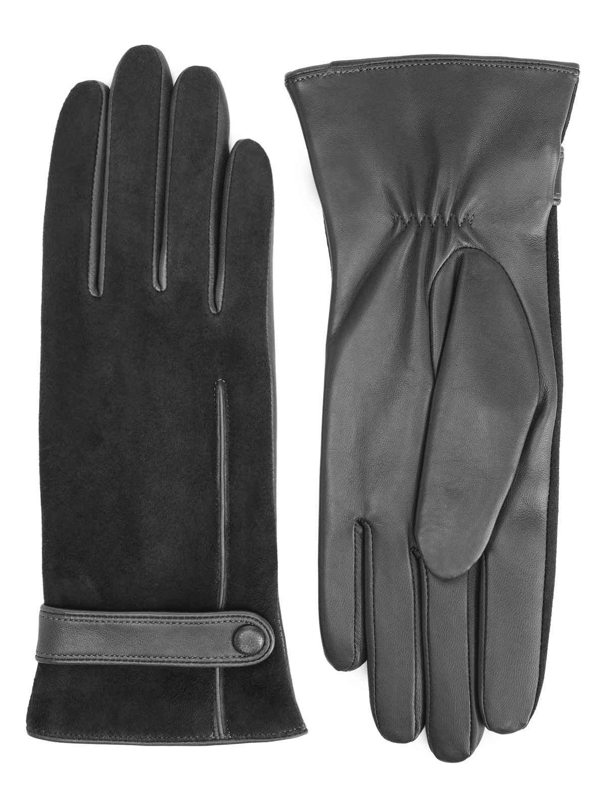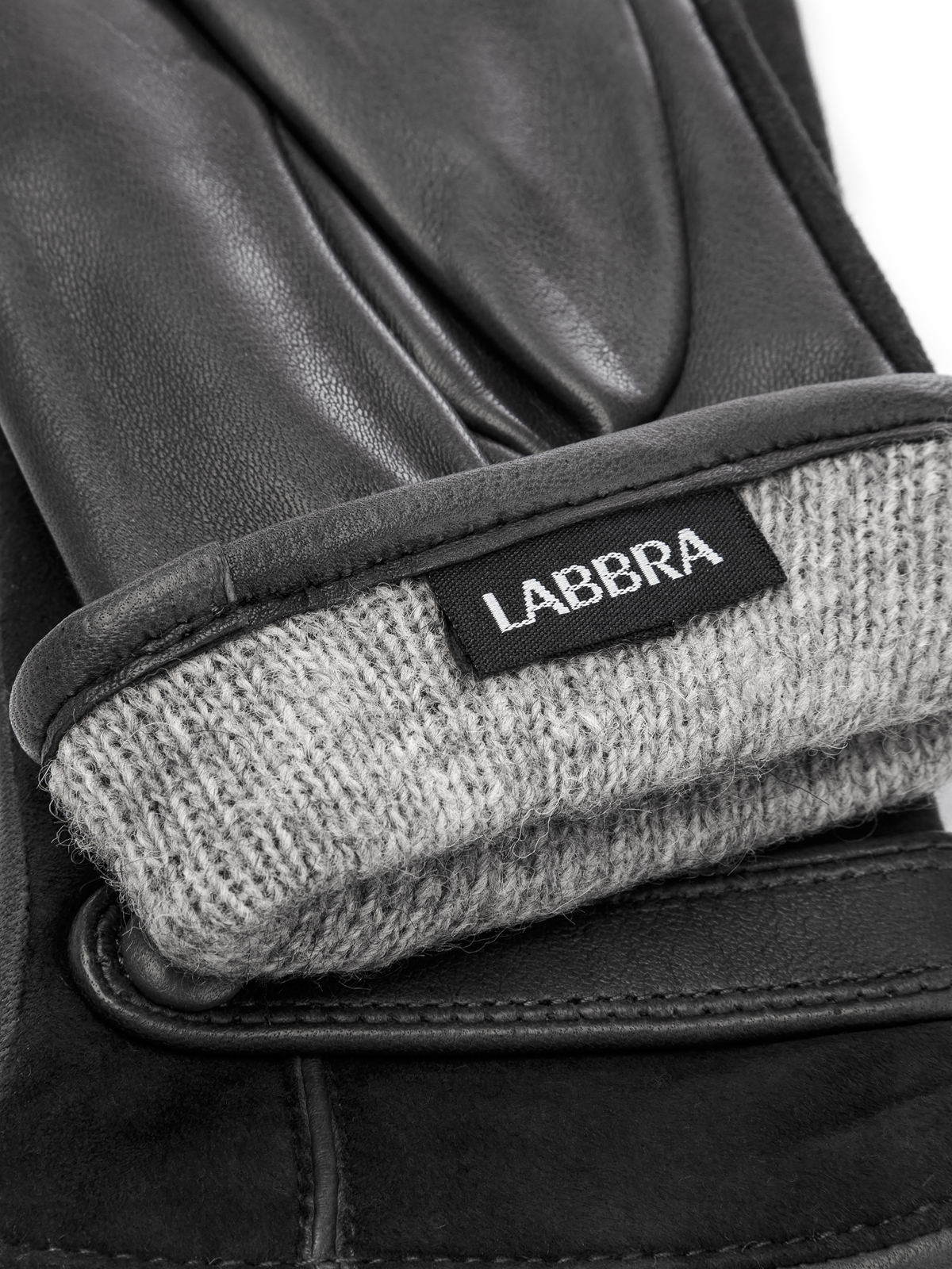 Перчатки торговой марки LABBRA из натуральной кожи ягненка. Производитель Китай. Подкладка: 70% шерсть 30% акрил. Отделка - комбинация из кожи и натурального велюра на лицевой части и декоративный элегантный кожаный ремешок на манжете. Длина манжеты от нижней точки большого пальца до края перчаток - 5 см. Длина пальцев - средняя.
