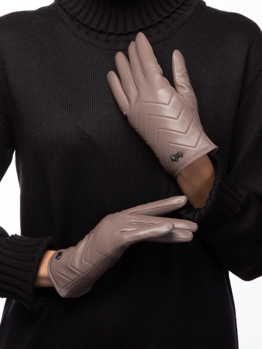 Перчатки женские торговой марки LABBRA из натуральной кожи ягненка. Производитель Китай. Подкладка: 70% шерсть 30% акрил. Отделка - отстрочки в форме зигзага на лицевой части и фирменная фурнитура LABBRA по краю манжета. Длина манжеты от нижней точки большого пальца до края перчаток - 45 см. Длина пальцев - средняя.