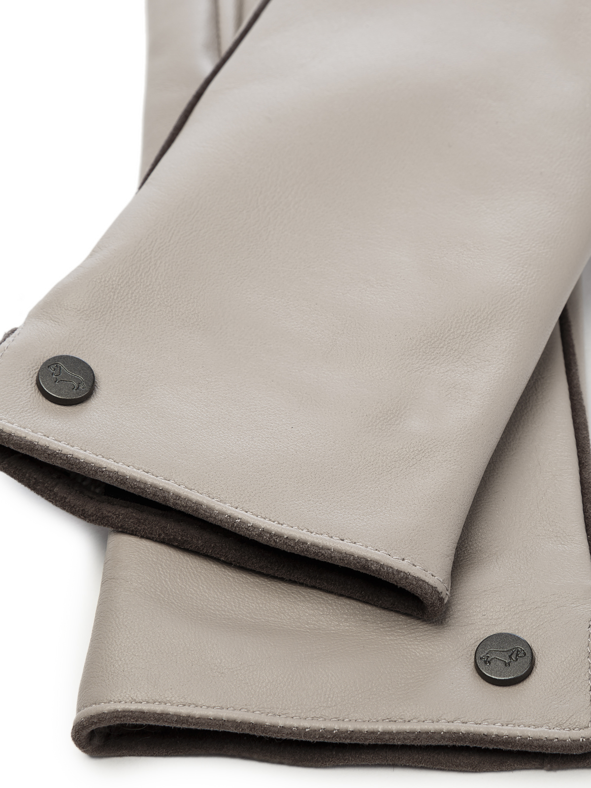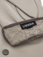 Перчатки женские торговой марки LABBRA из натуральной кожи ягненка. Производитель Китай. Подкладка: 70% шерсть 30% акрил. Отделка - кант контрастного цвета на боковой части по линии мизинца и линии манжета выполненный из велюра; фирменная фурнитура LABBRA. Длина манжеты от нижней точки большого пальца до края перчаток - 55 см. Длина пальцев - средняя.