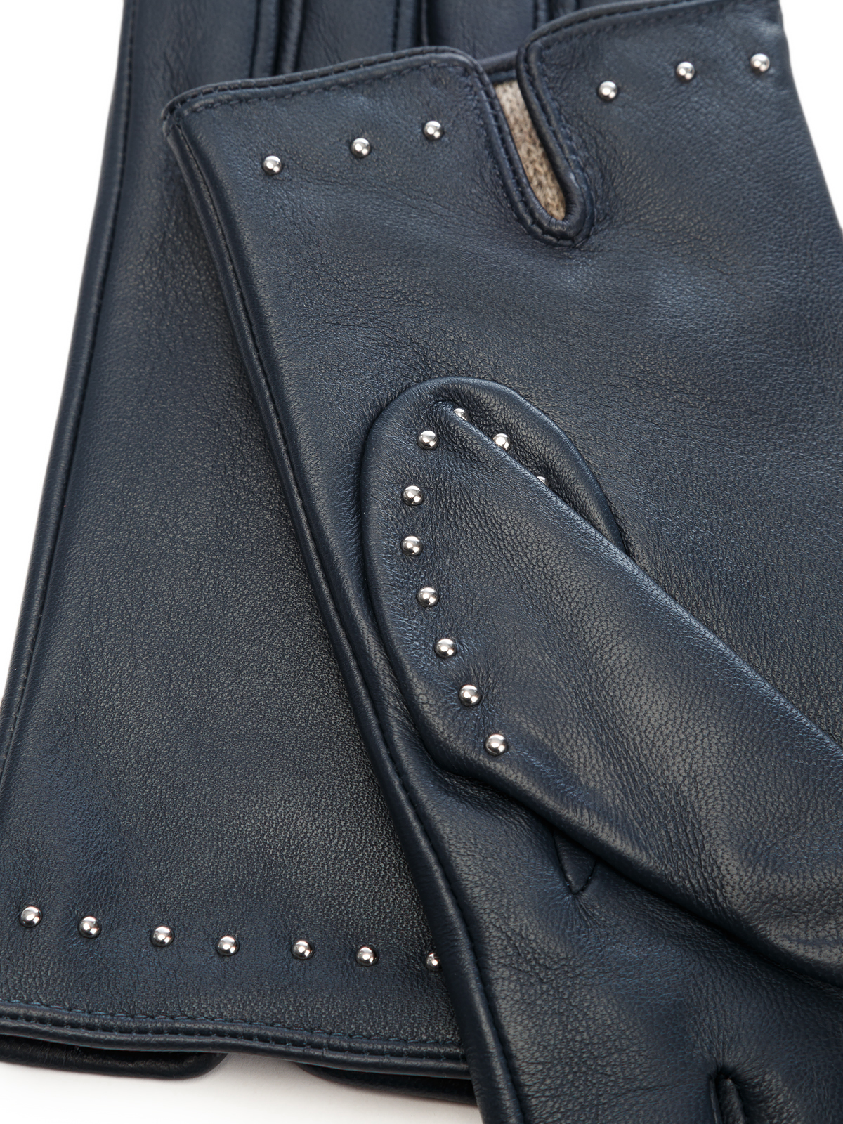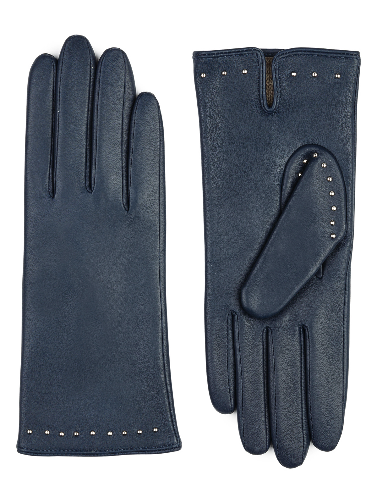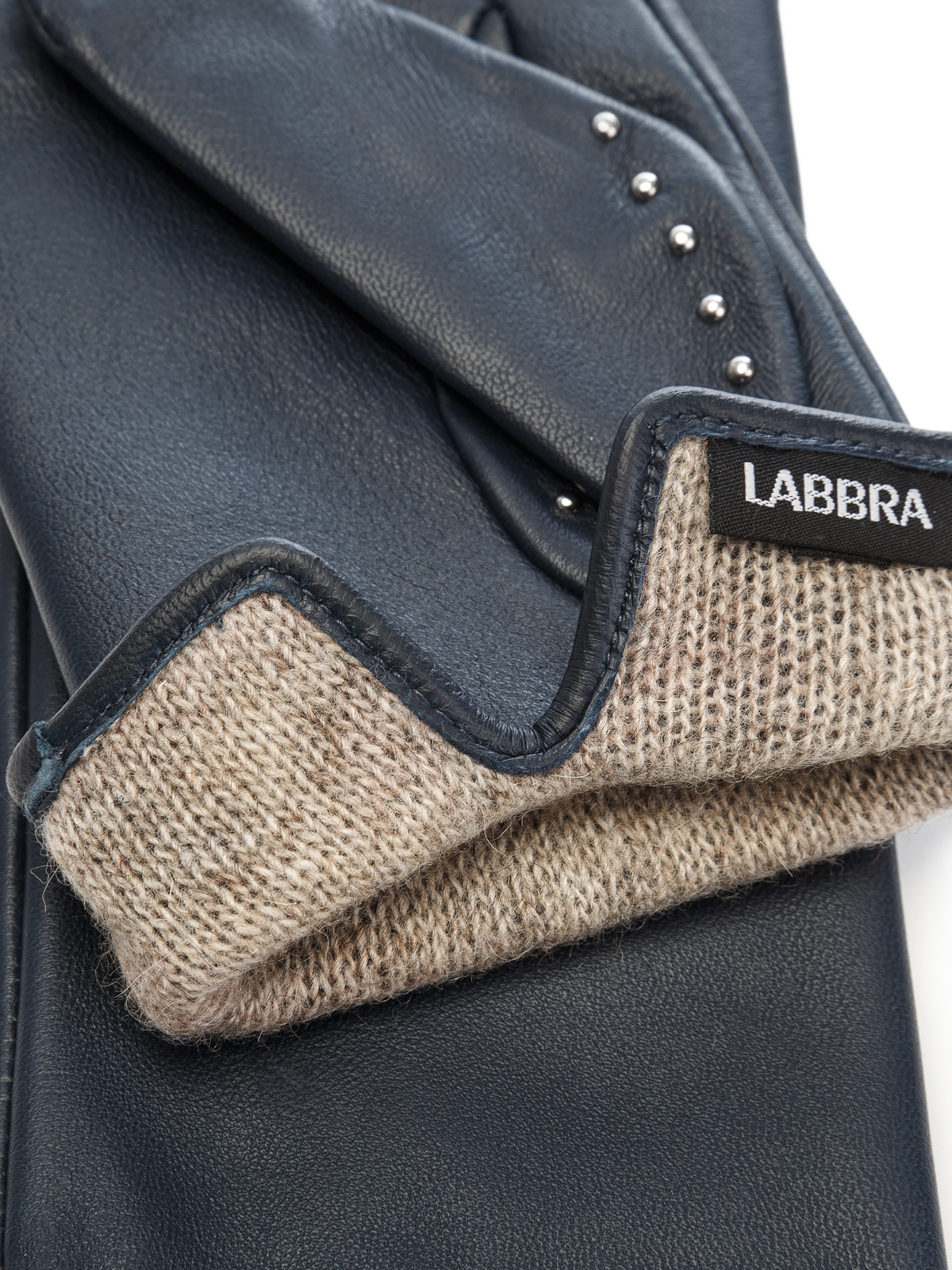 Перчатки женские торговой марки LABBRA из натуральной кожи ягненка. Производитель Китай. Подкладка: 70% шерсть 30% акрил. Отделка - декоративные металлические хольнитены украшающие край манжеты и основание большого пальца. Длина манжеты от нижней точки большого пальца до края перчаток - 5 см. Длина пальцев - средняя.