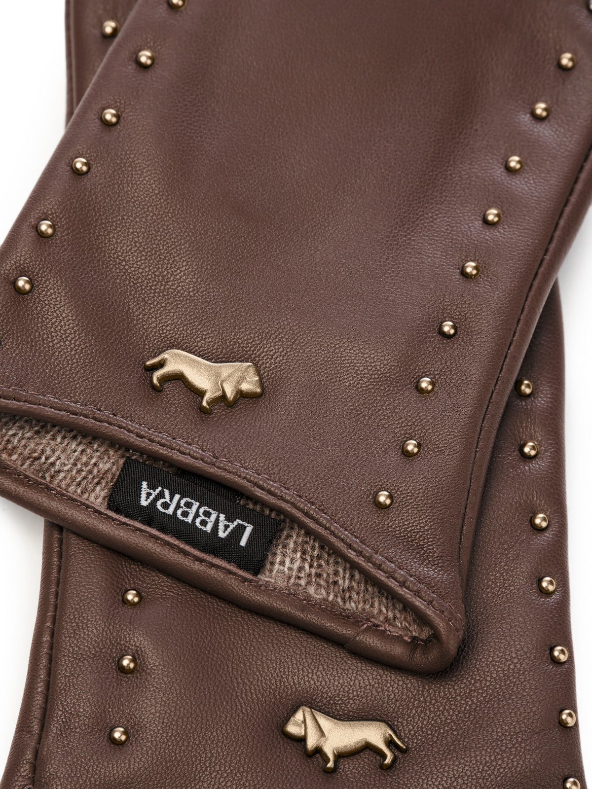 Перчатки женские торговой марки LABBRA из натуральной кожи ягненка. Производитель Китай. Подкладка: 70% шерсть 30% акрил. Отделка - металлические хольнитены на бокой части печатки. Лицевая сторона украшена фурнитурой в виде фирменной символики бренда. Длина манжеты от нижней точки большого пальца до края перчаток - 6 см. Длина пальцев - средняя.