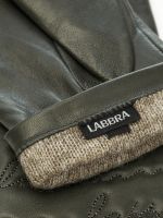 Перчатки женские торговой марки LABBRA производства Китай. Выполнены из натуральной кожи ягненка. Подкладка - 70% шерсть 30% акрил. Отделка - горизонтальная декоративная отстрочка логотипом LABBRA на манжете. Длина манжеты от нижней точки большого пальца до края перчаток - 65 см. Длина пальцев - средняя.