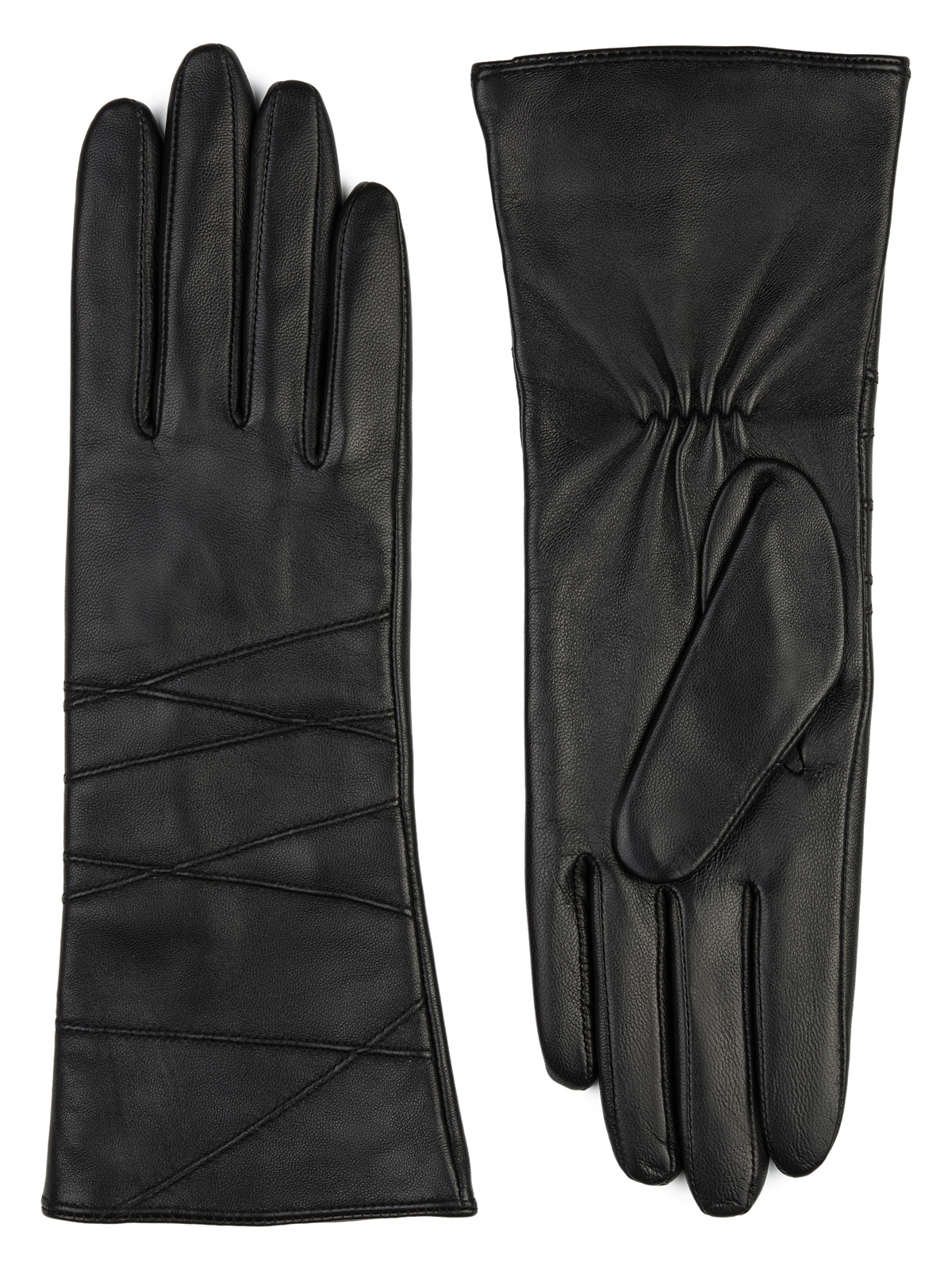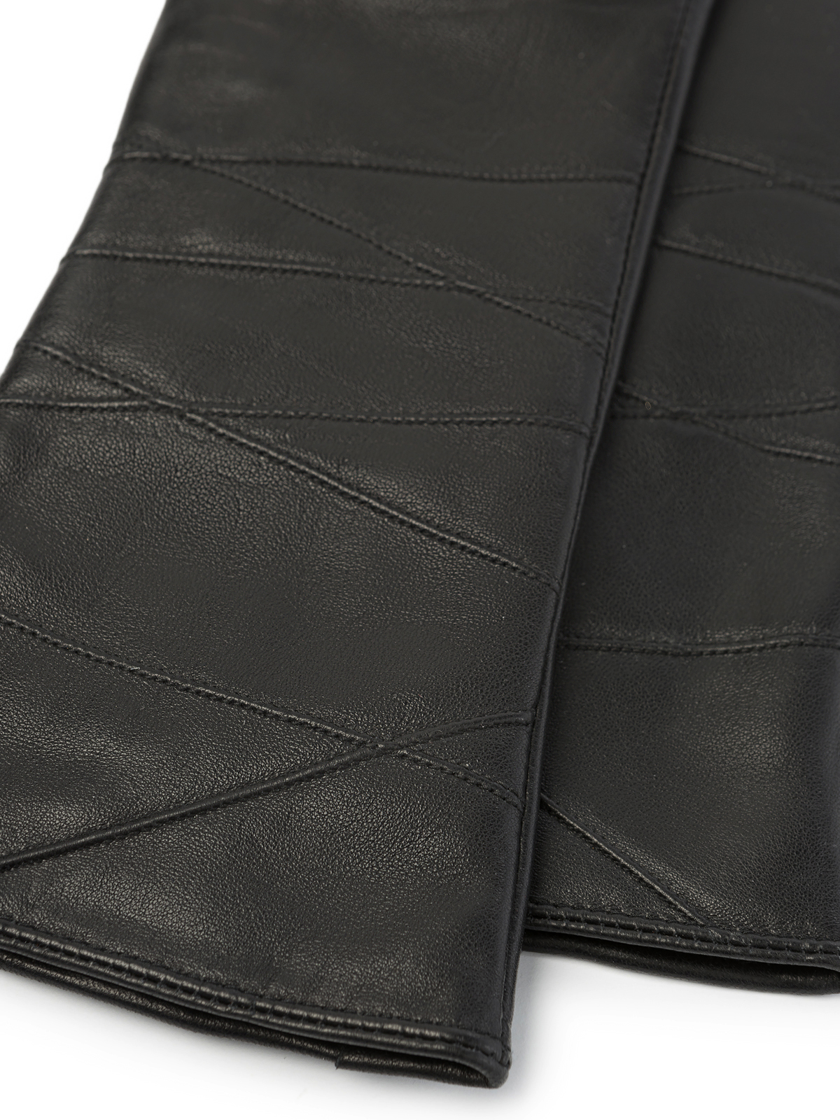 Трендовые удлиненные женские перчатки торговой марки LABBRA. Выполнены из высококачественной натуральной кожи ягненка на подкладе из смесовой шерстяной пряжи. Украшены декоративными геометрическими строчками на лицевой стороне. Модель со средней длиной пальцев и длиной манжеты от нижней точки большого пальца до края перчаток - 10 см.