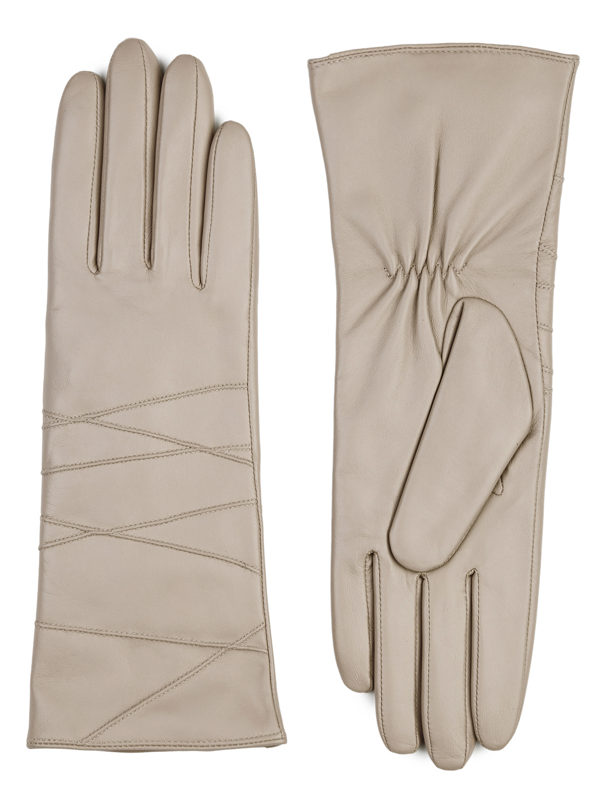 Трендовые удлиненные женские перчатки торговой марки LABBRA. Выполнены из высококачественной натуральной кожи ягненка на подкладе из смесовой шерстяной пряжи. Украшены декоративными геометрическими строчками на лицевой стороне. Модель со средней длиной пальцев и длиной манжеты от нижней точки большого пальца до края перчаток - 10 см.