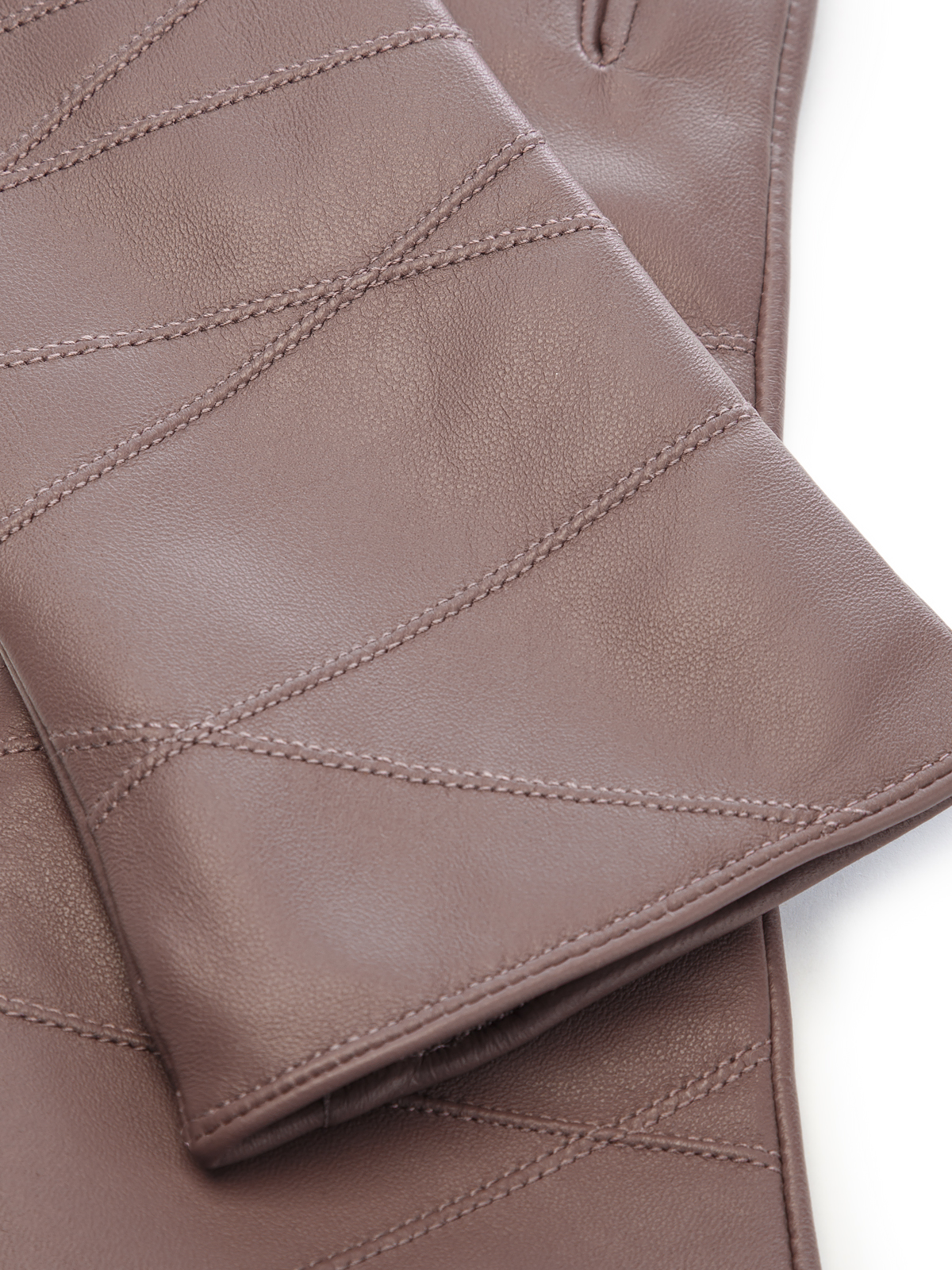 Перчатки женские торговой марки LABBRA производства Китай. Выполнены из натуральной кожи ягненка. Подкладка - 70% шерсть 30% акрил. Отделка - декоративные геометричные строчки машинными швами на лицевой стороне. Длина манжеты от нижней точки большого пальца до края перчаток - 10 см. Длина пальцев - средняя.