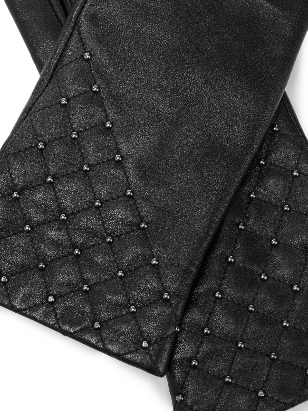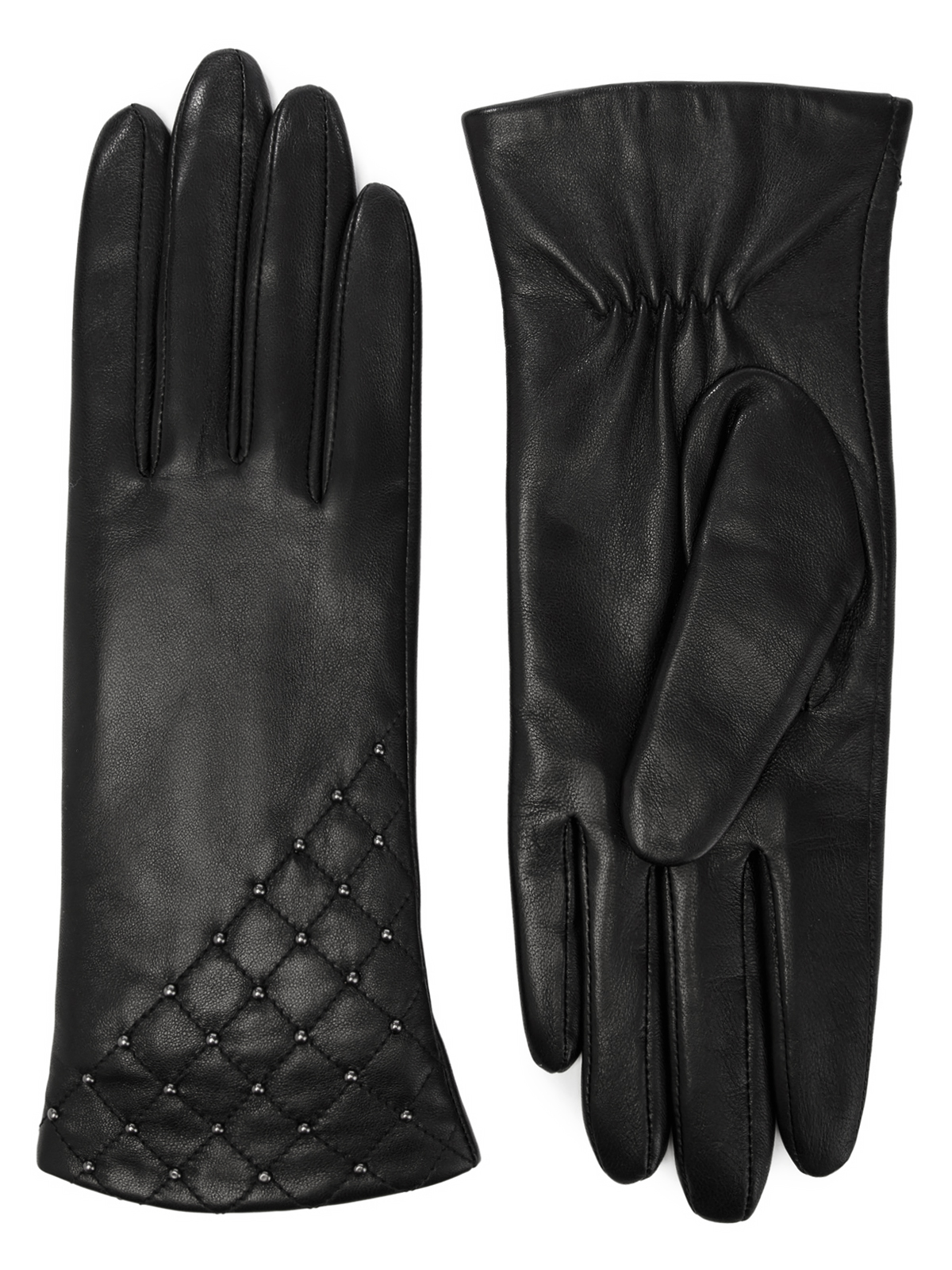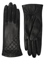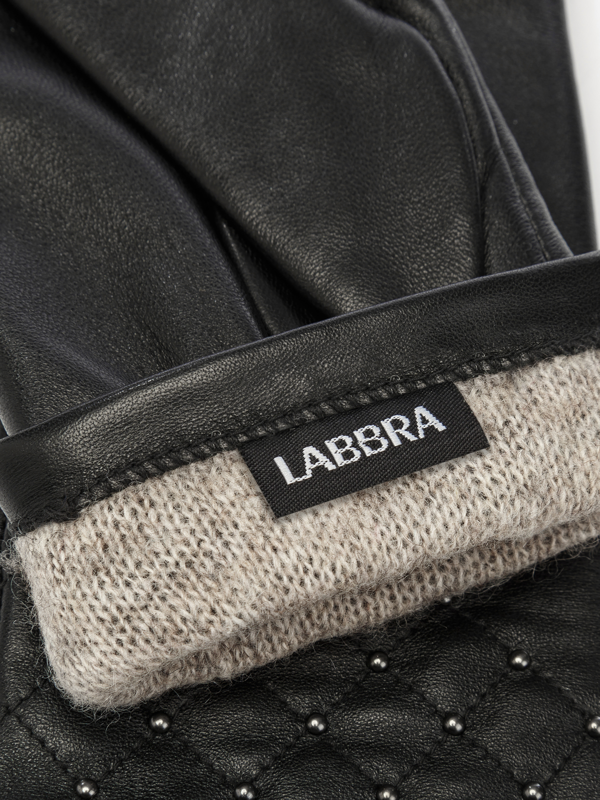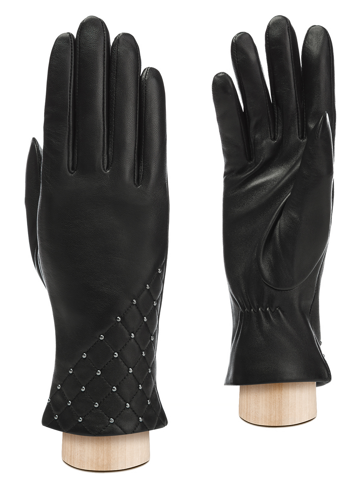 Перчатки женские торговой марки LABBRA производства Китай. Выполнены из натуральной кожи ягненка. Подкладка: 70% шерсть + 30% акрил. Отделка - декоративные машинные швы геметрической формы украшенные хольнитенами. Длина манжеты от нижней точки большого пальца до края перчаток - 6 см. Длина пальцев - средняя.