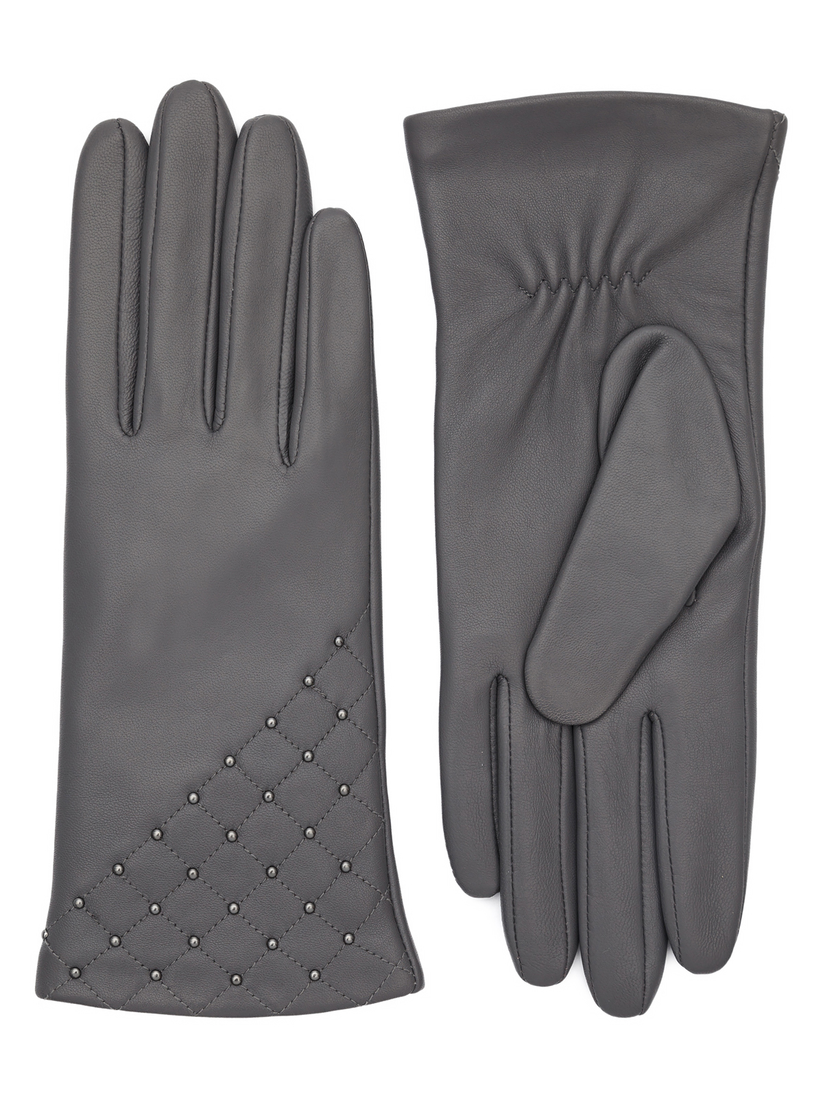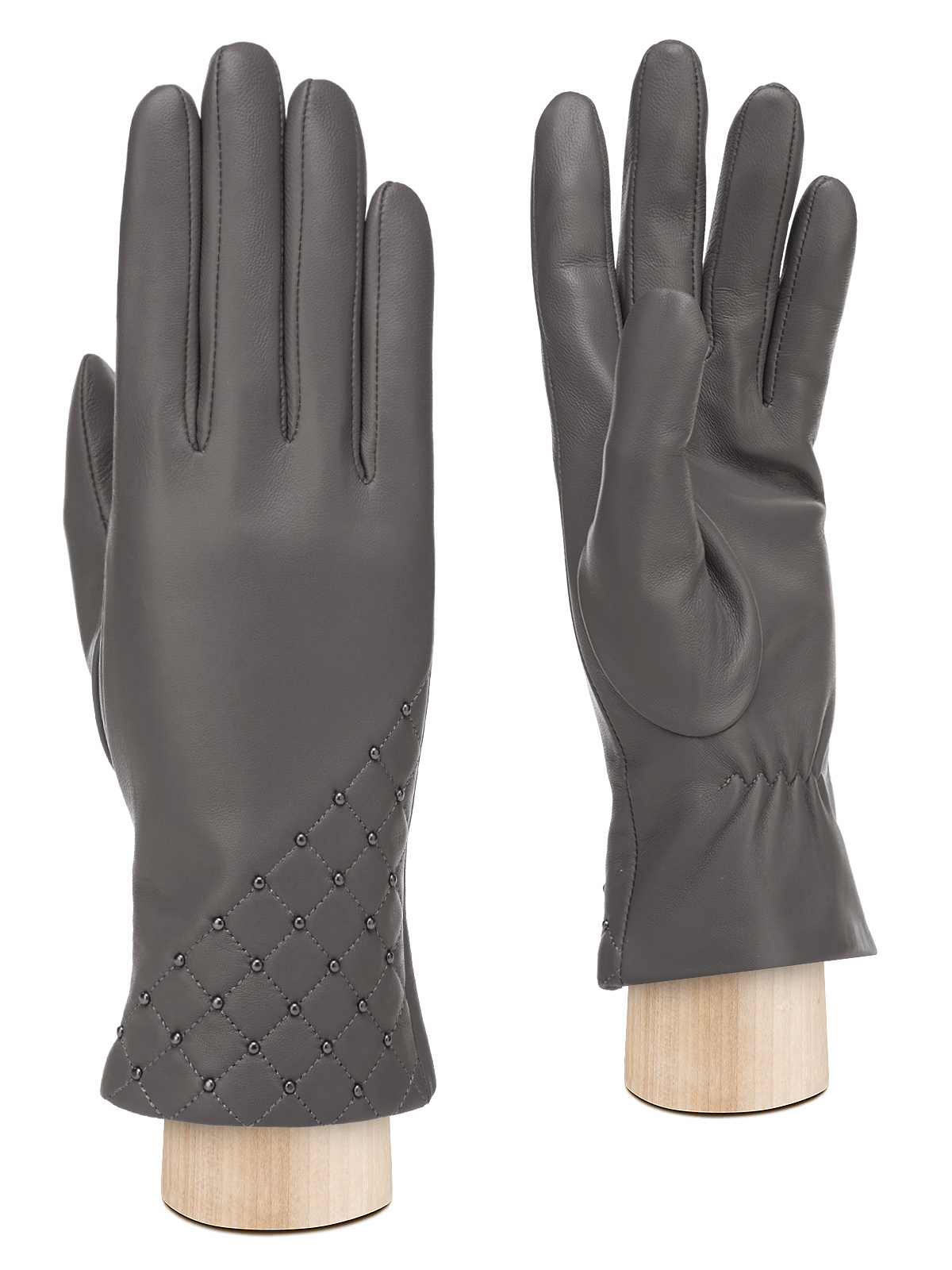 Перчатки женские торговой марки LABBRA производства Китай. Выполнены из натуральной кожи ягненка. Подкладка: 70% шерсть + 30% акрил. Отделка - декоративные машинные швы геметрической формы украшенные хольнитенами. Длина манжеты от нижней точки большого пальца до края перчаток - 6 см. Длина пальцев - средняя.