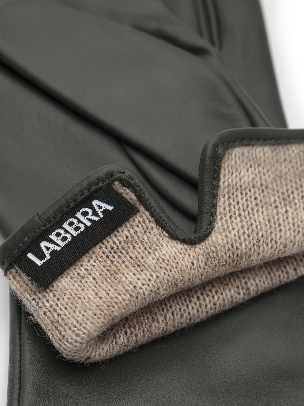 Перчатки торговой марки LABBRA из натуральной кожи ягненка. Производитель Китай. Подкладка: 70% шерсть 30% акрил. Отделка - машинная строчка три луча" фирменная фурнитура в виде собачки. Длина манжеты от нижней точки большого пальца до края перчаток - 6 см. Длина пальцев - средняя."