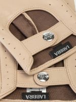 Автомобильные перчатки торговой марки LABBRA производства Китай. Изготовлены из натуральной кожи ягненка. Отделка - декоративная перфорация. Вырез с кнопкой (рабочая) с фирменной символикой LABBRA. Перчатки с шелковой подкладкой. Длина манжеты от нижней точки большого пальца до края перчаток - 25 см.