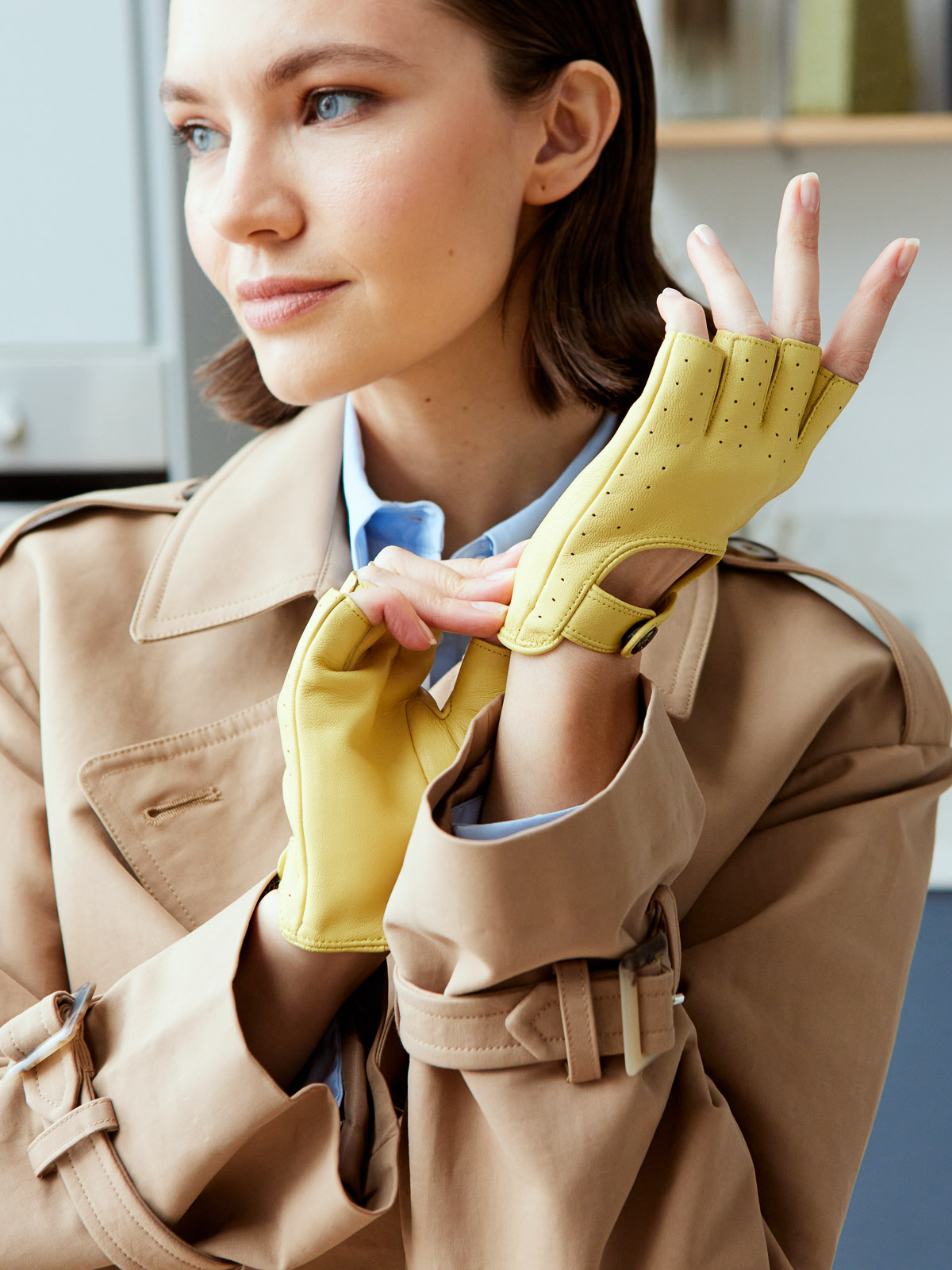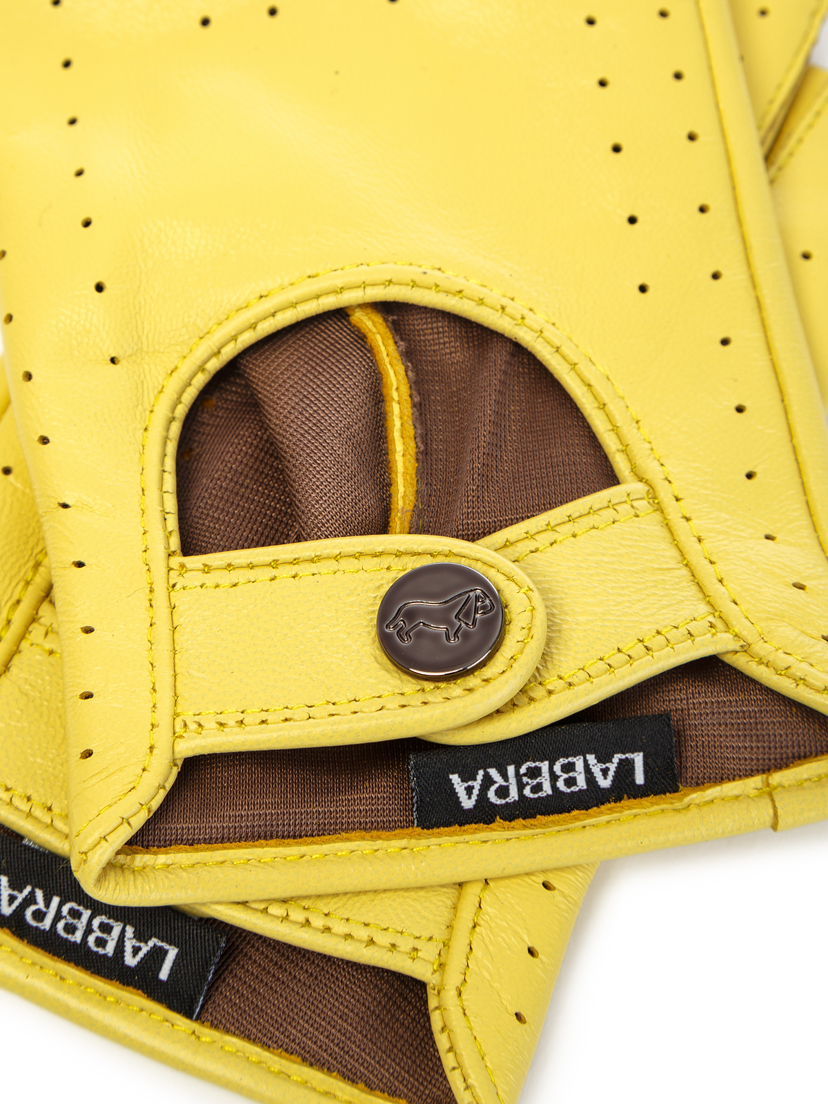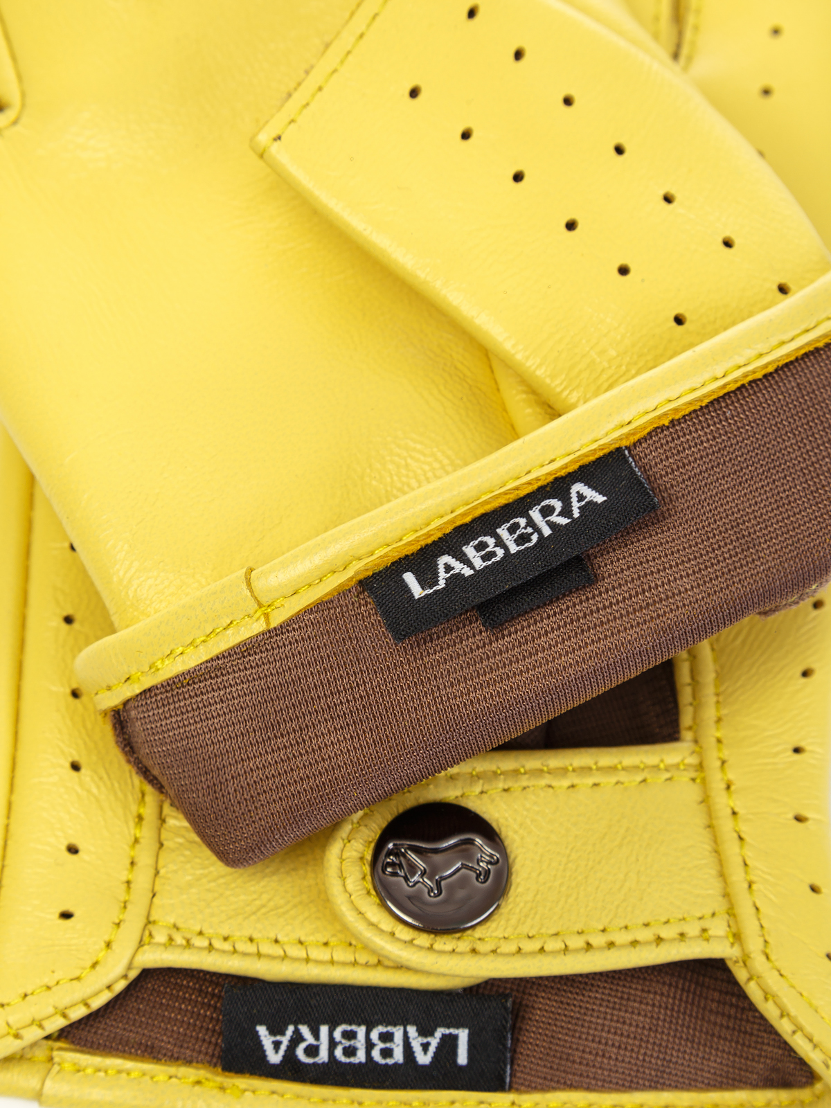 Автомобильные перчатки торговой марки LABBRA производства Китай. Изготовлены из натуральной кожи ягненка. Отделка - декоративная перфорация. Вырез с кнопкой (рабочая) с фирменной символикой LABBRA. Перчатки с шелковой подкладкой. Длина манжеты от нижней точки большого пальца до края перчаток - 25 см.