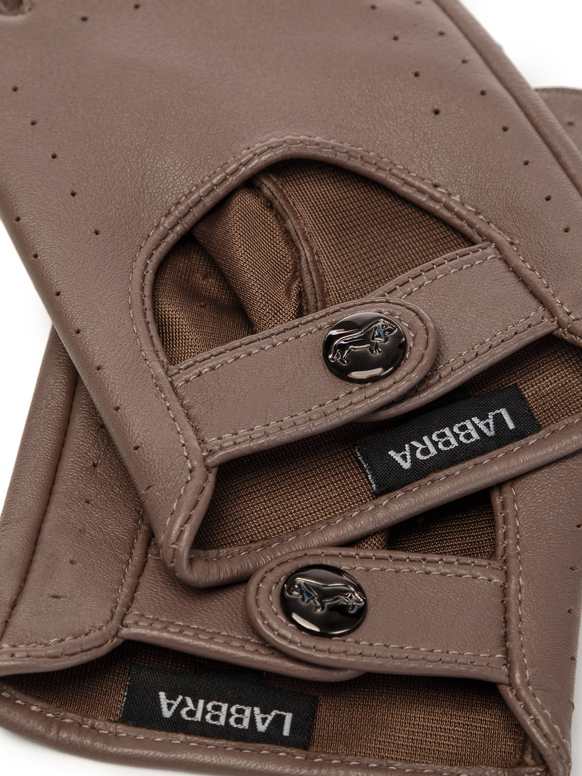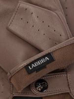 Автомобильные перчатки торговой марки LABBRA производства Китай. Изготовлены из натуральной кожи ягненка. Отделка - декоративная перфорация. Вырез с кнопкой (рабочая) с фирменной символикой LABBRA. Перчатки с шелковой подкладкой. Длина манжеты от нижней точки большого пальца до края перчаток - 25 см.