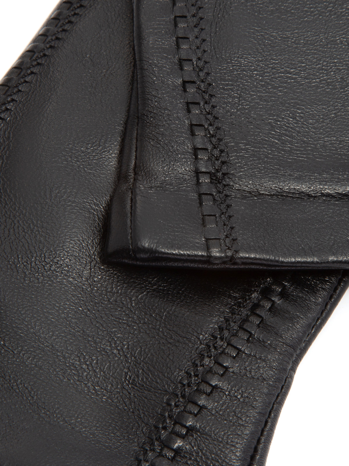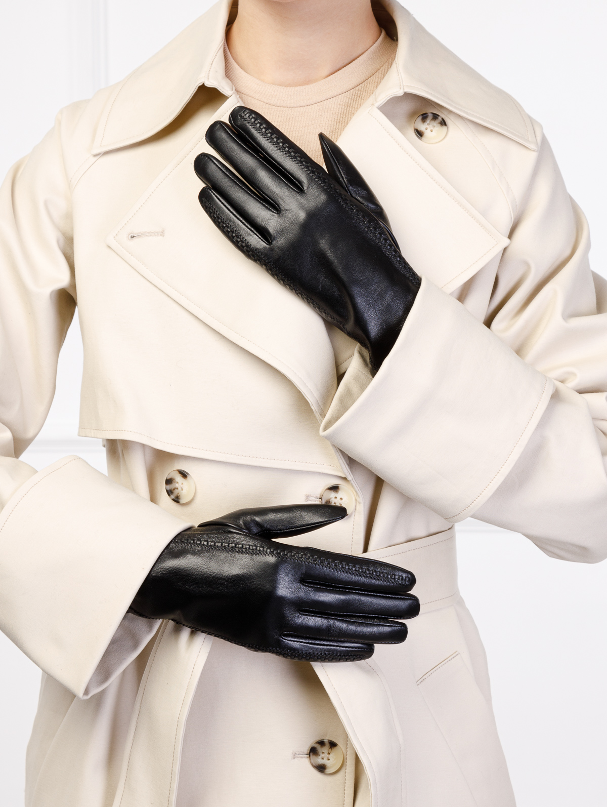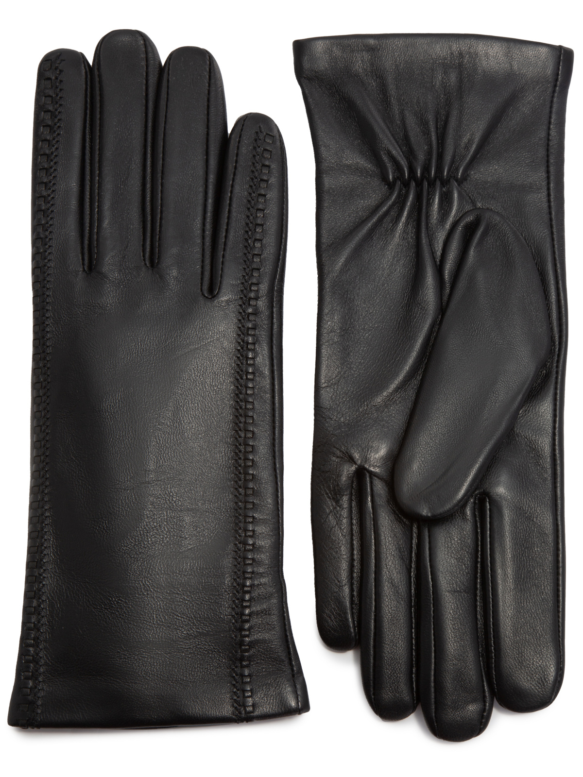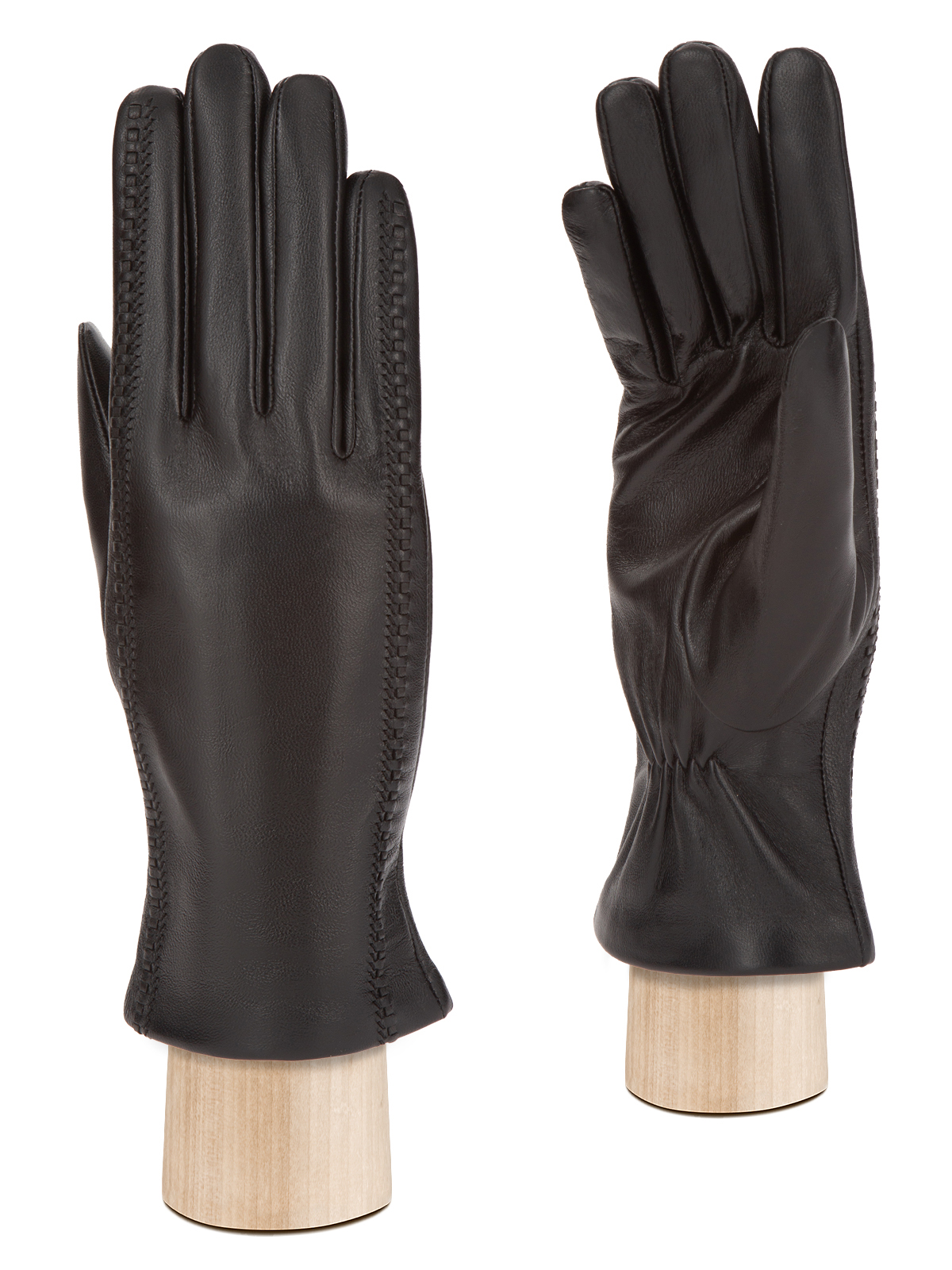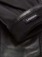 Перчатки женские торговой марки LABBRA производства Китай. Выполнены из натуральной кожи ягненка. Подкладка - искусственный шелк. Декоративная продежка тонким кожаным шнурком дублирована машинной строчкой. Резинка на ладонной стороне манжеты. Длина манжеты от нижней точки большого пальца до края перчаток - 6 см. Длина пальцев - средняя.