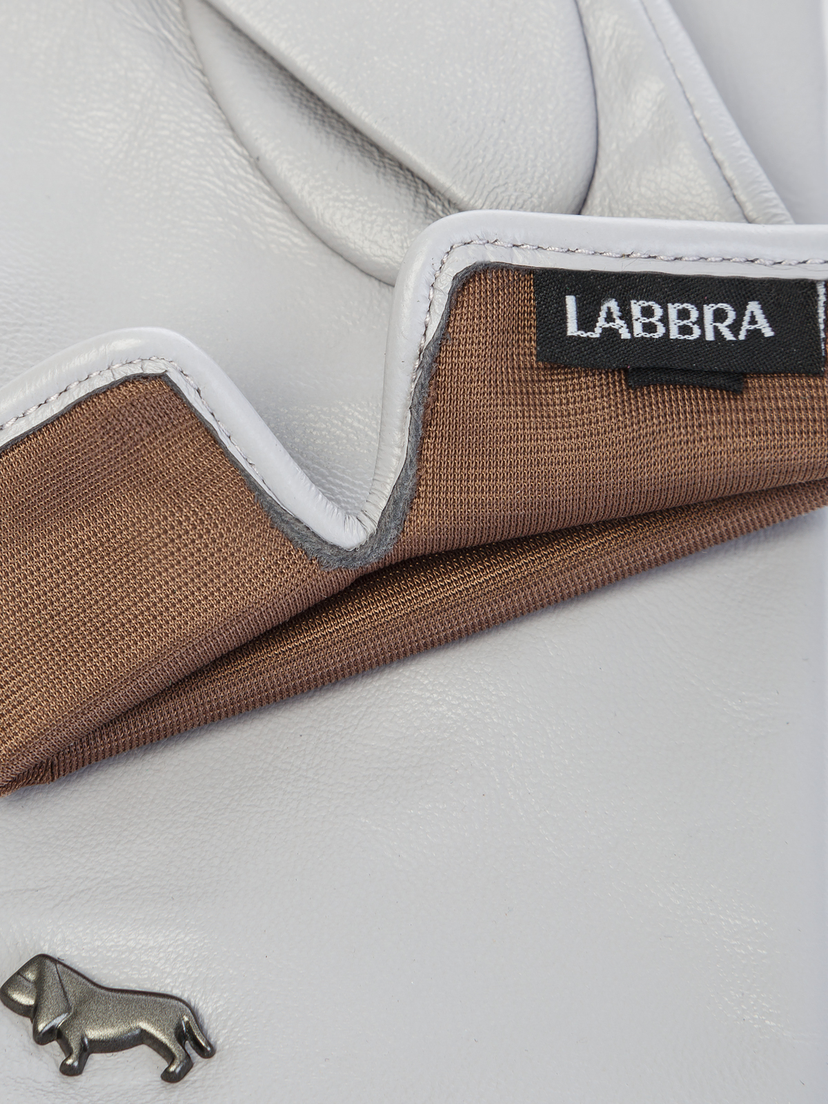 Перчатки торговой марки LABBRA из натуральной кожи ягненка. Производитель Китай. Подкладка: шелк. Отделка - машинная строчка три луча" фирменная фурнитура в виде собачки. Длина манжеты от нижней точки большого пальца до края перчаток - 6 см. Длина пальцев - средняя."