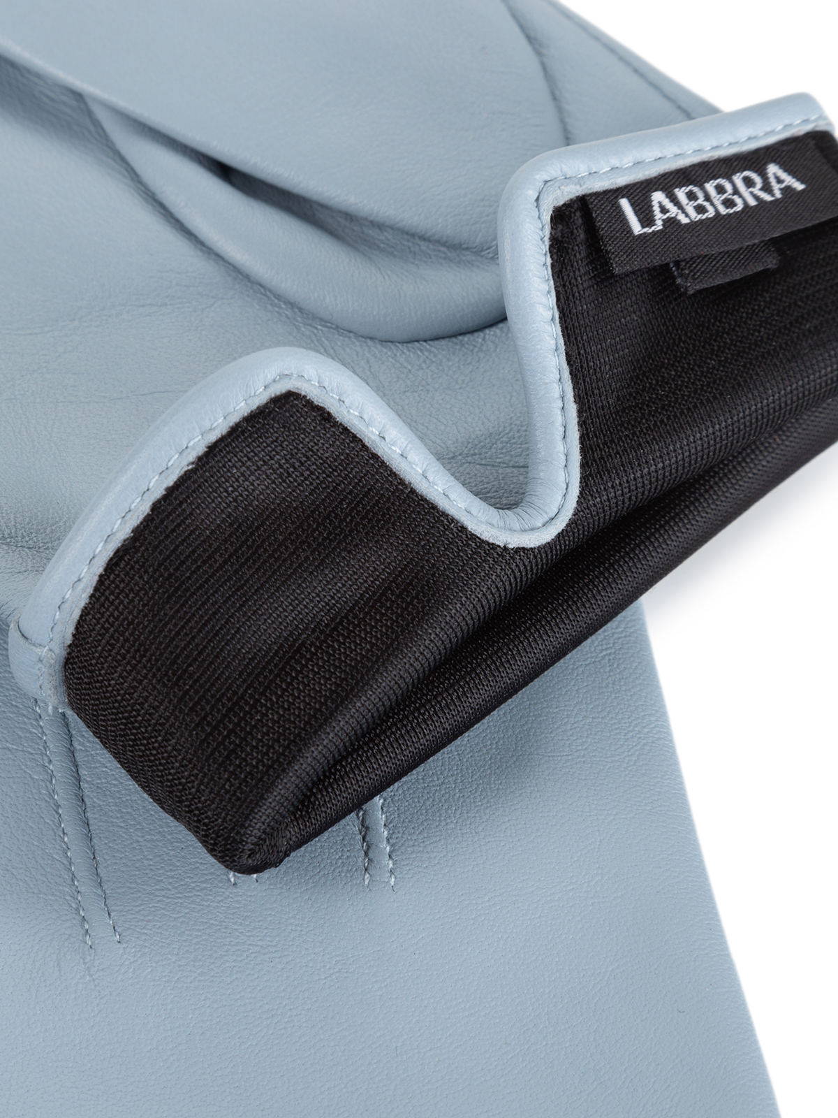 Перчатки торговой марки LABBRA из натуральной кожи ягненка. Производитель Китай. Подкладка: шелк. Отделка - машинная строчка три луча" фирменная фурнитура в виде собачки. Длина манжеты от нижней точки большого пальца до края перчаток - 6 см. Длина пальцев - средняя."