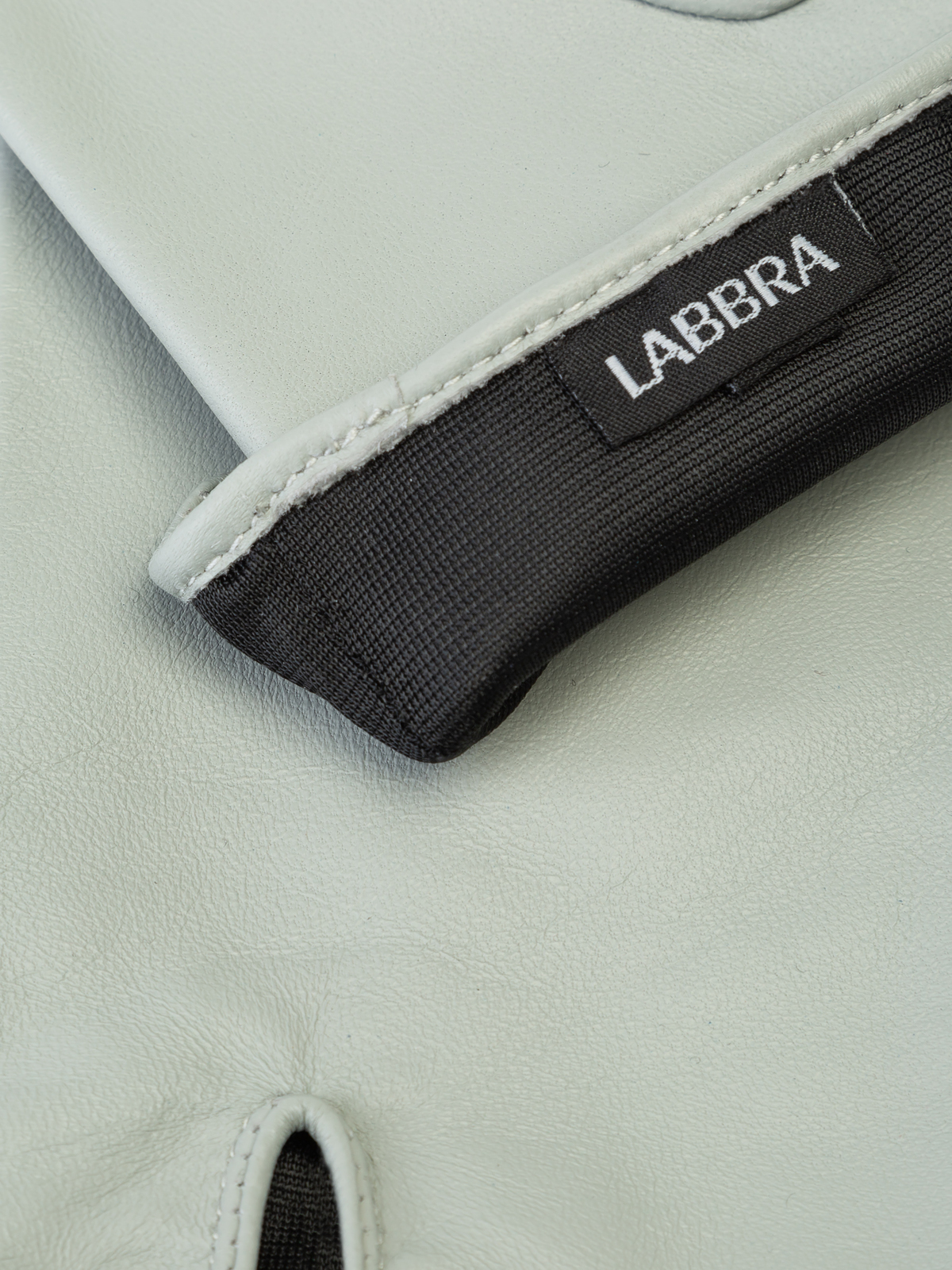 Перчатки женские торговой марки LABBRA из натуральной кожи ягненка. Производство Китай. Подкладка: шелк. Отделка - на лицевой части перчатки разрез с фирменной кнопкой. Длина манжеты от нижней точки большого пальца до края перчаток - 6.5 см. Длина пальцев - средняя.
