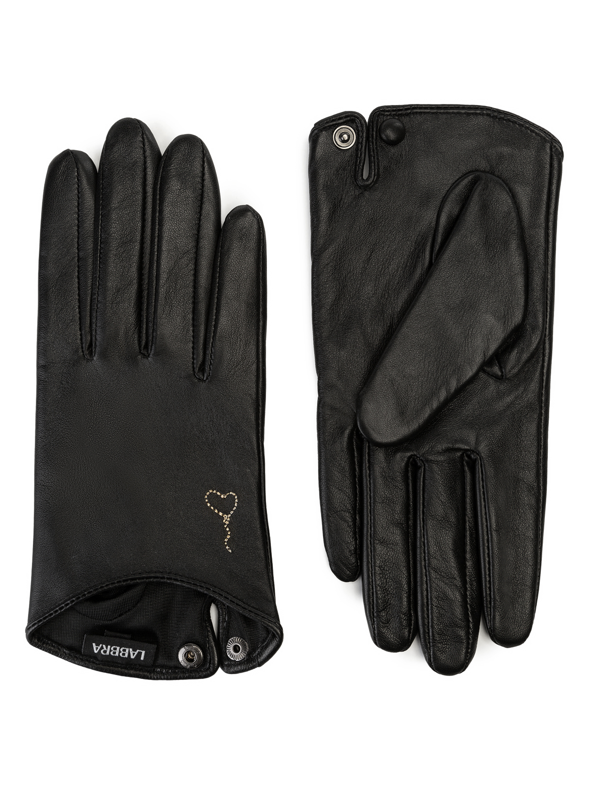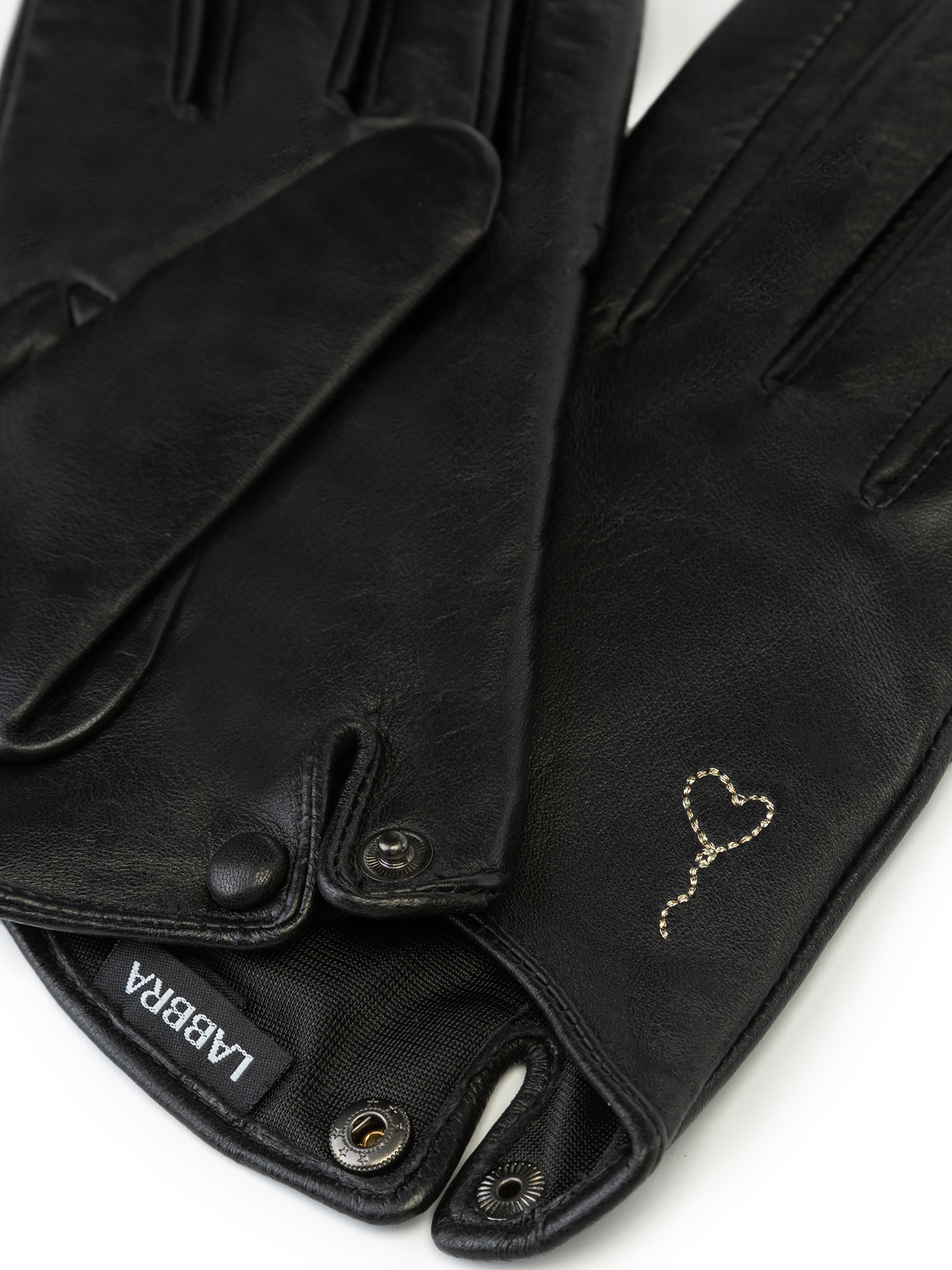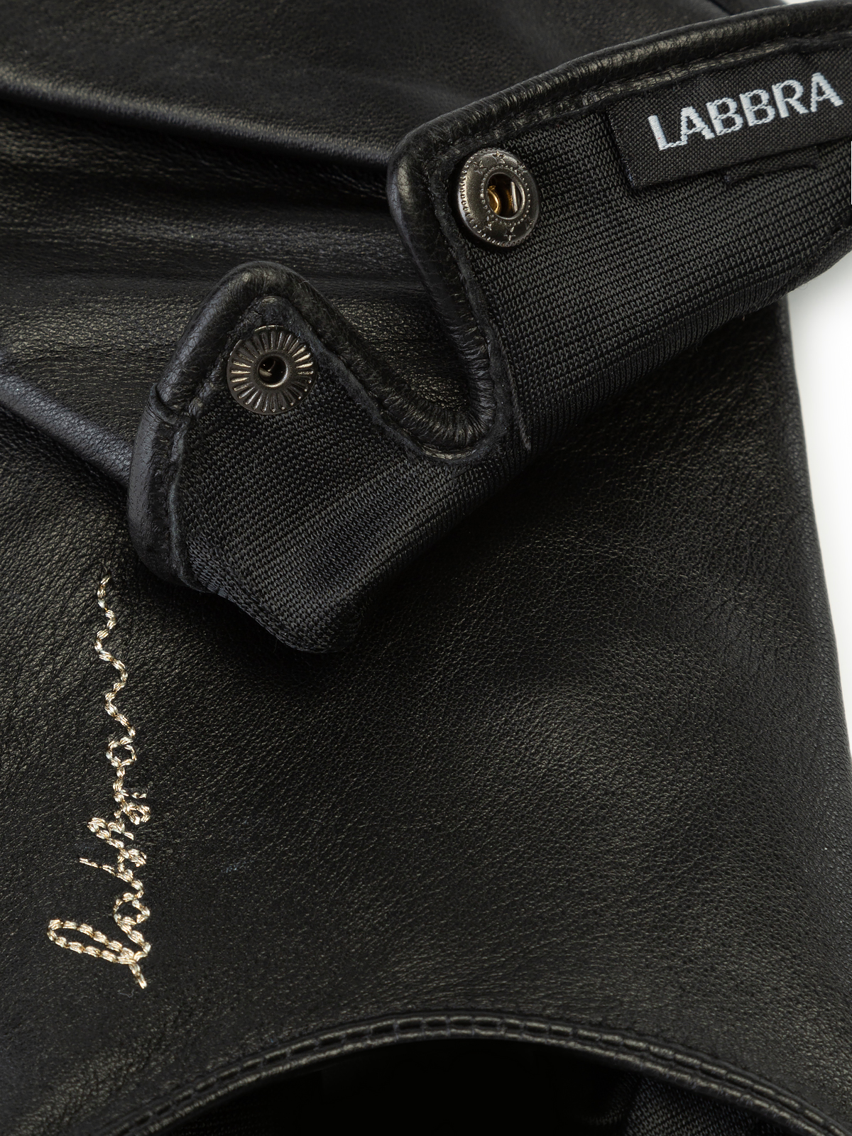 Перчатки женские торговой марки LABBRA производства Китай. Выполнены из натуральной кожи ягненка. Подкладка: шелк. Отделка - несимметричная декоративная вышивка на лицевой стороне контрастного цвета. Разрез на ладонной части с рабочей кнопкой обтянутой кожей. Длина манжеты от нижней точки большого пальца до края перчаток - 25 см. Длина пальцев - средняя.