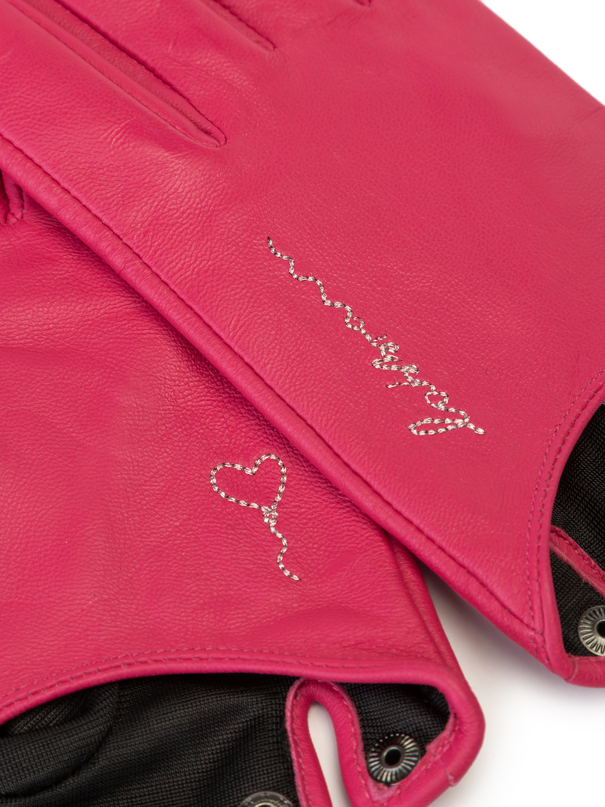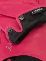 Перчатки женские торговой марки LABBRA производства Китай. Выполнены из натуральной кожи ягненка. Подкладка: шелк. Отделка - несимметричная декоративная вышивка на лицевой стороне контрастного цвета. Разрез на ладонной части с рабочей кнопкой обтянутой кожей. Длина манжеты от нижней точки большого пальца до края перчаток - 25 см. Длина пальцев - средняя.