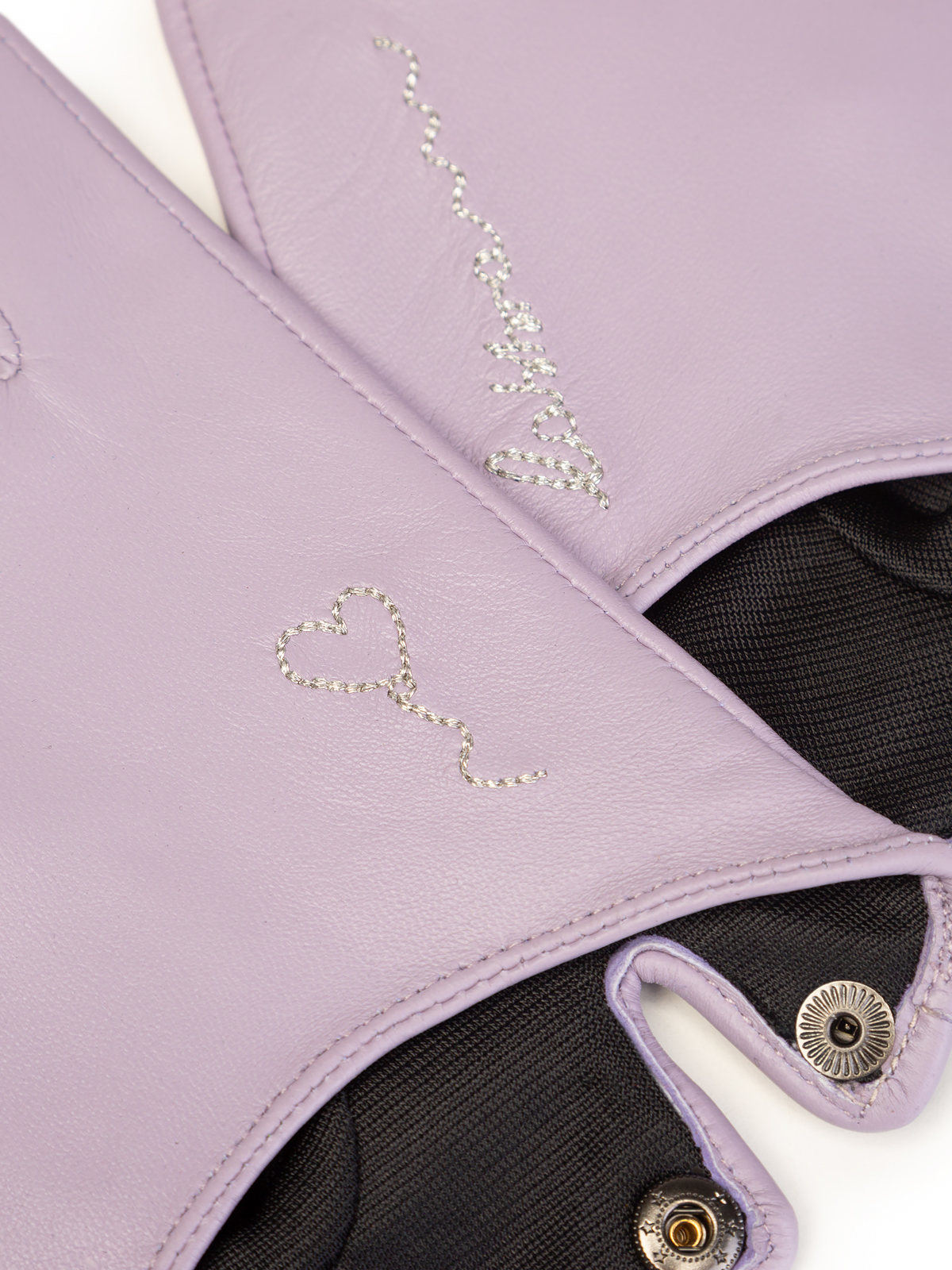 Перчатки женские торговой марки LABBRA производства Китай. Выполнены из натуральной кожи ягненка. Подкладка: шелк. Отделка - несимметричная декоративная вышивка на лицевой стороне контрастного цвета. Разрез на ладонной части с рабочей кнопкой обтянутой кожей. Длина манжеты от нижней точки большого пальца до края перчаток - 25 см. Длина пальцев - средняя.