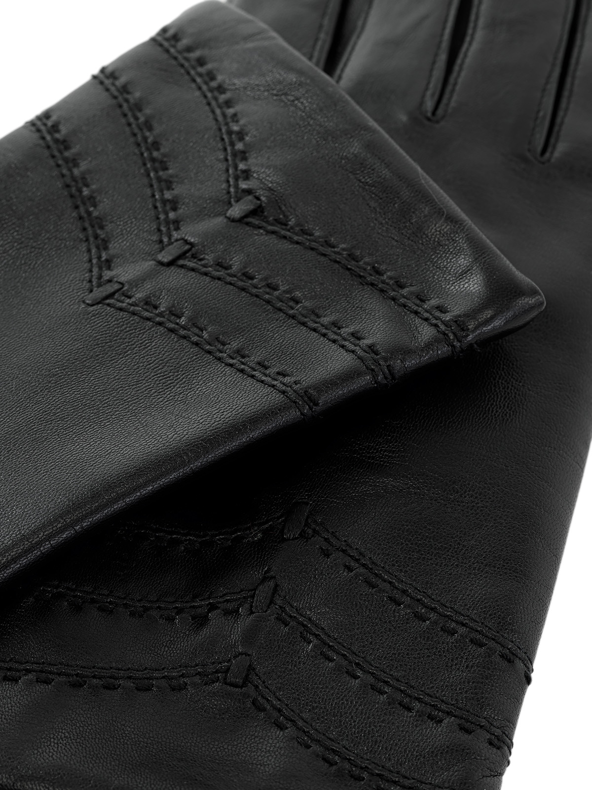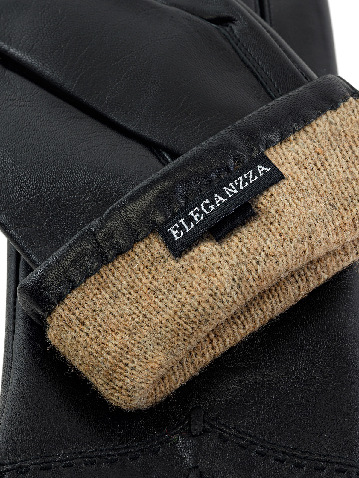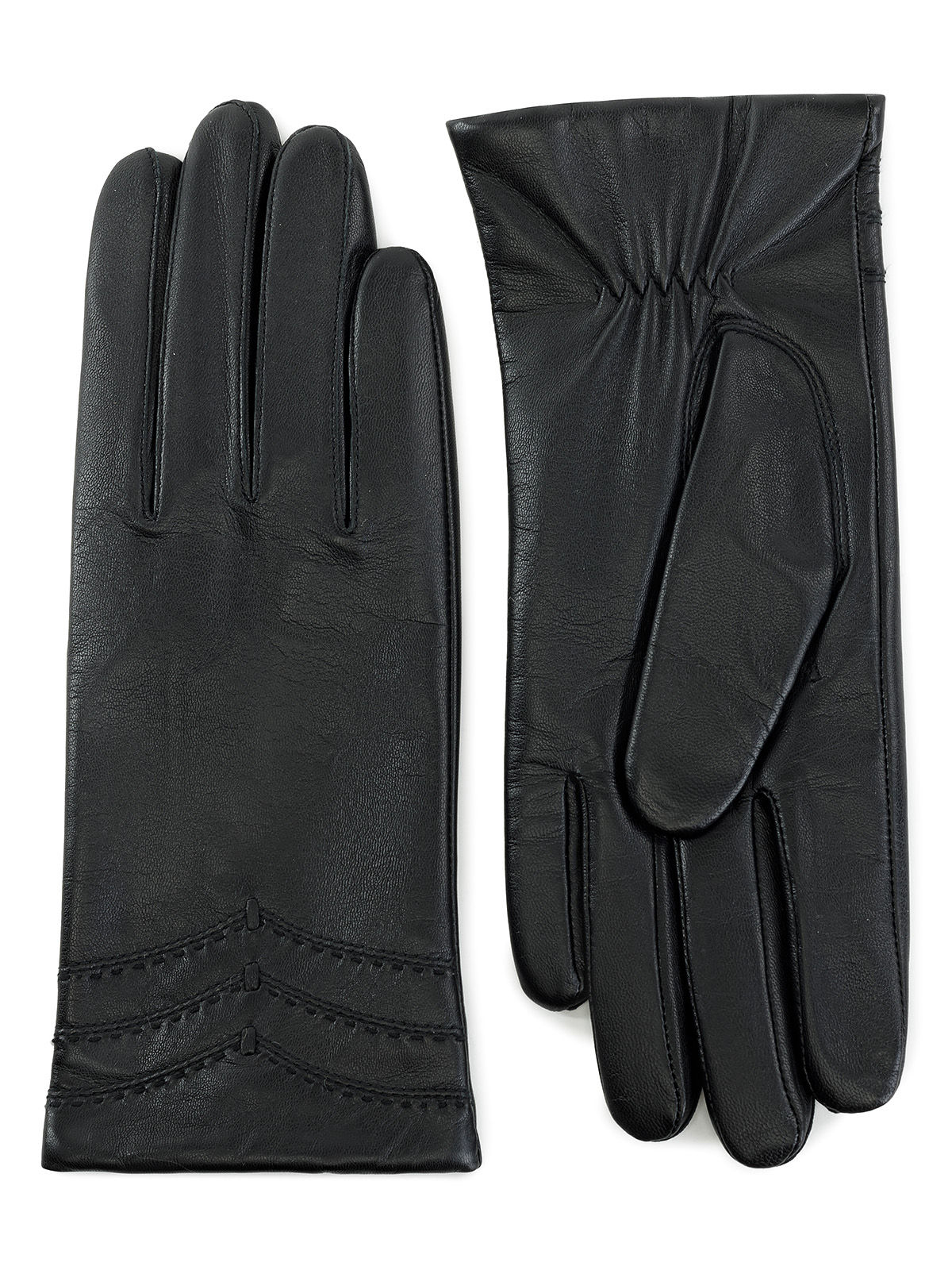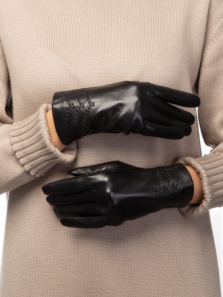 Перчатки торговой марки ELEGANZZA производства Китай выполнены из натуральной кожи ягнёнка. Подкладка: 100% шерсть. Отделка - декоративная отстрочка V-образной формы по линии манжета украшена продежками из тонкго кожаного шнурка. Длина манжеты от нижней точки большого пальца до края перчаток - 55 см. Длина пальцев - средняя.