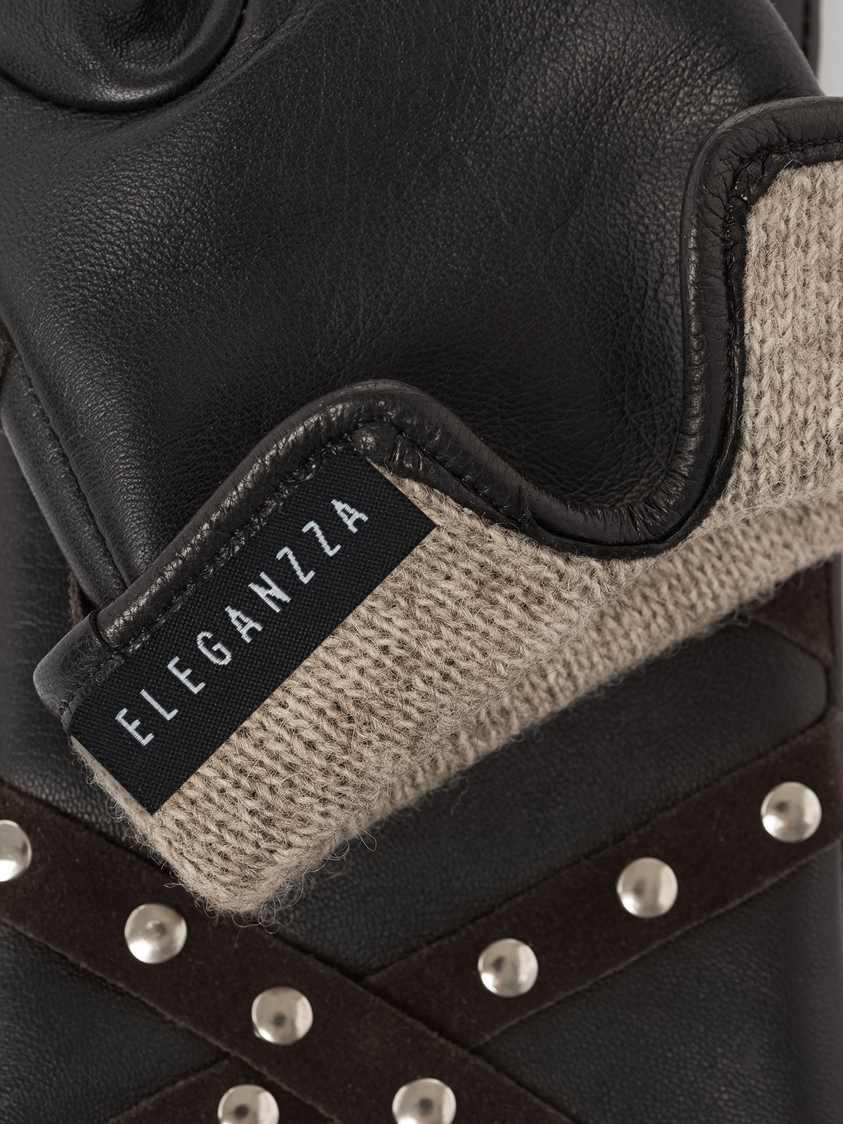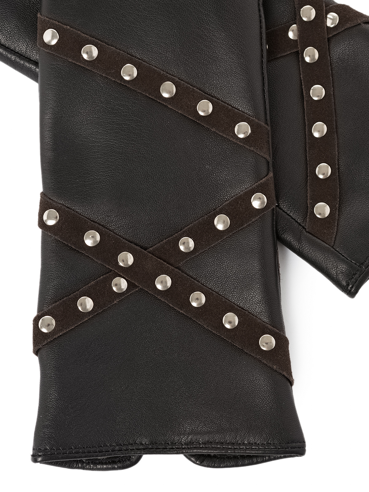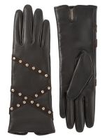 Трендовые удлиненные женские перчатки торговой марки ELEGANZZA. Выполнены из высококачественной натуральной кожи ягненка на мягкой шерстяной подкладке. Лицевая сторона декорирована ремешками украшенными металлическими хольнитенами. Модель со средней длиной пальцев и длиной манжеты от нижней точки большого пальца до края перчаток - 10 см.