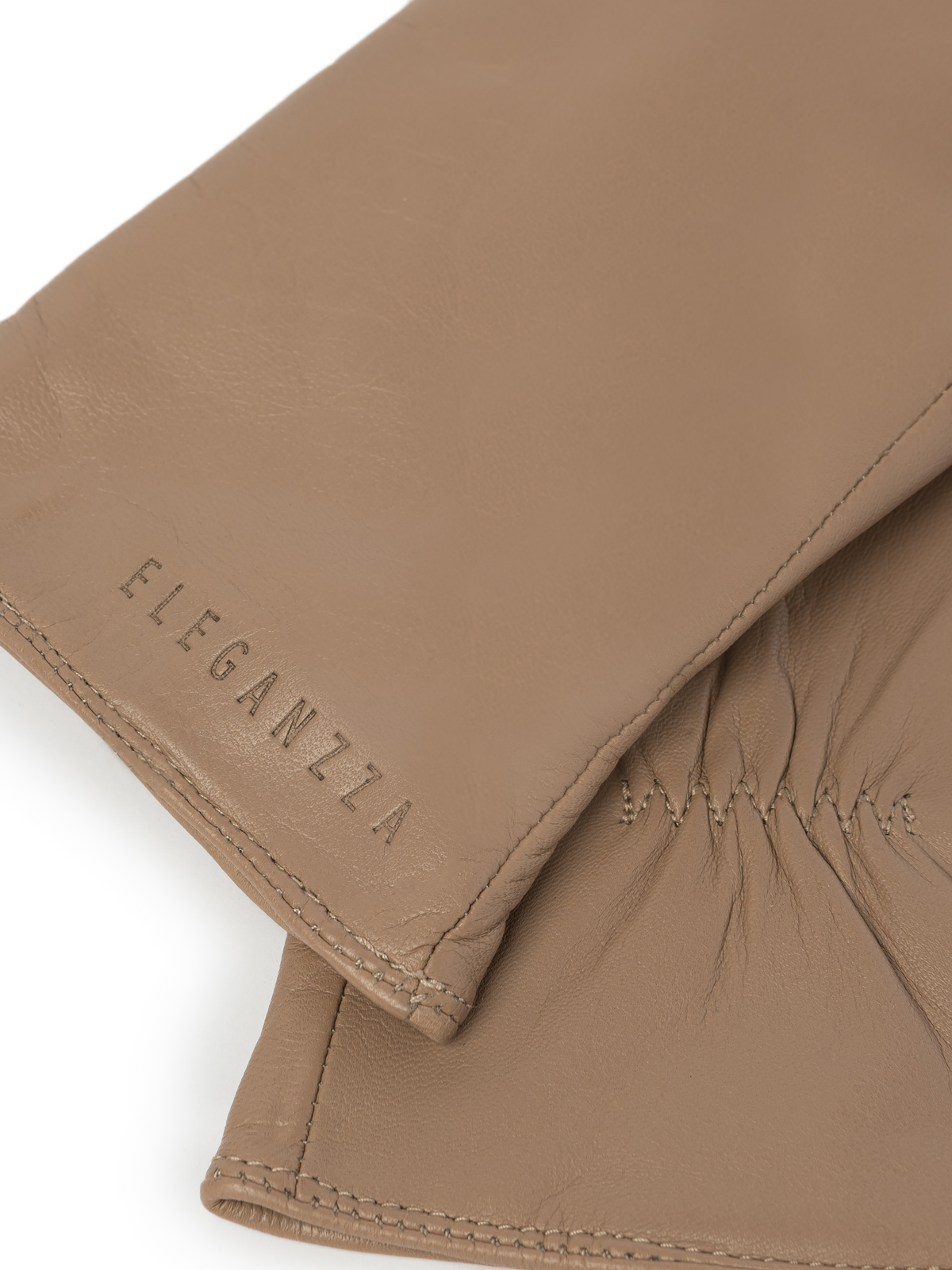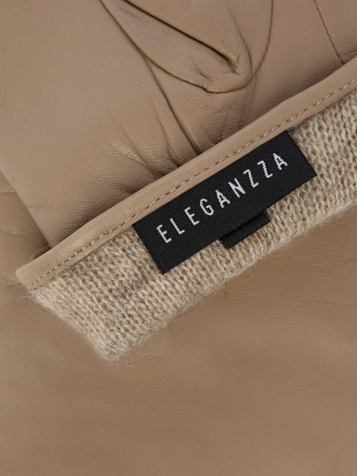 Перчатки женские торговой марки ELEGANZZA из натуральной кожи ягненка производства Италии. Подкладка: 100% шерсть. В углу перчатки со стороны мизинца фирменный штамп" ELEGANZZA. Длина манжеты от нижней точки большого пальца до края перчаток составляет - 55 см. Длина пальцев - средняя."
