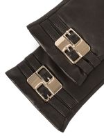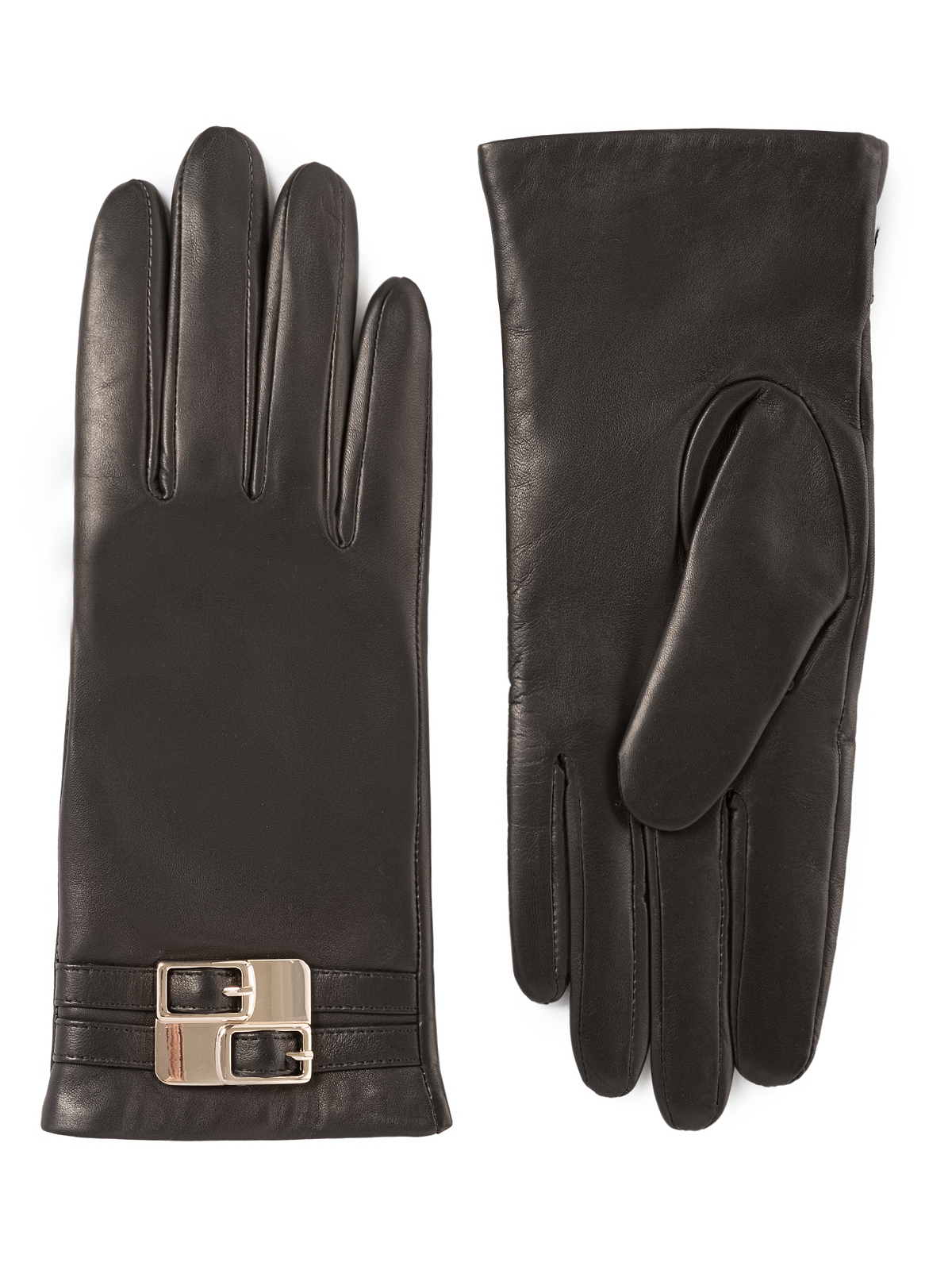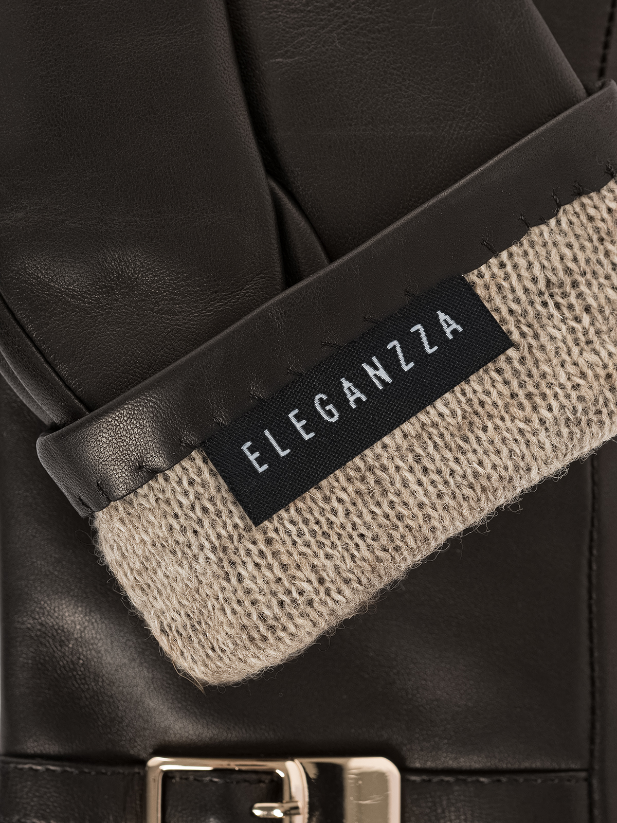 Женские перчатки торговой марки ELEGANZZA. Выполнены из высококачественной натуральной кожи ягненка на мягкой шерстяной подкладке. На манжете украшены декоративными ремешками и дополнены пряжкой геометрической формы. Модель со средней длиной пальцев и длиной манжеты от нижней точки большого пальца до края перчаток - 6 см.