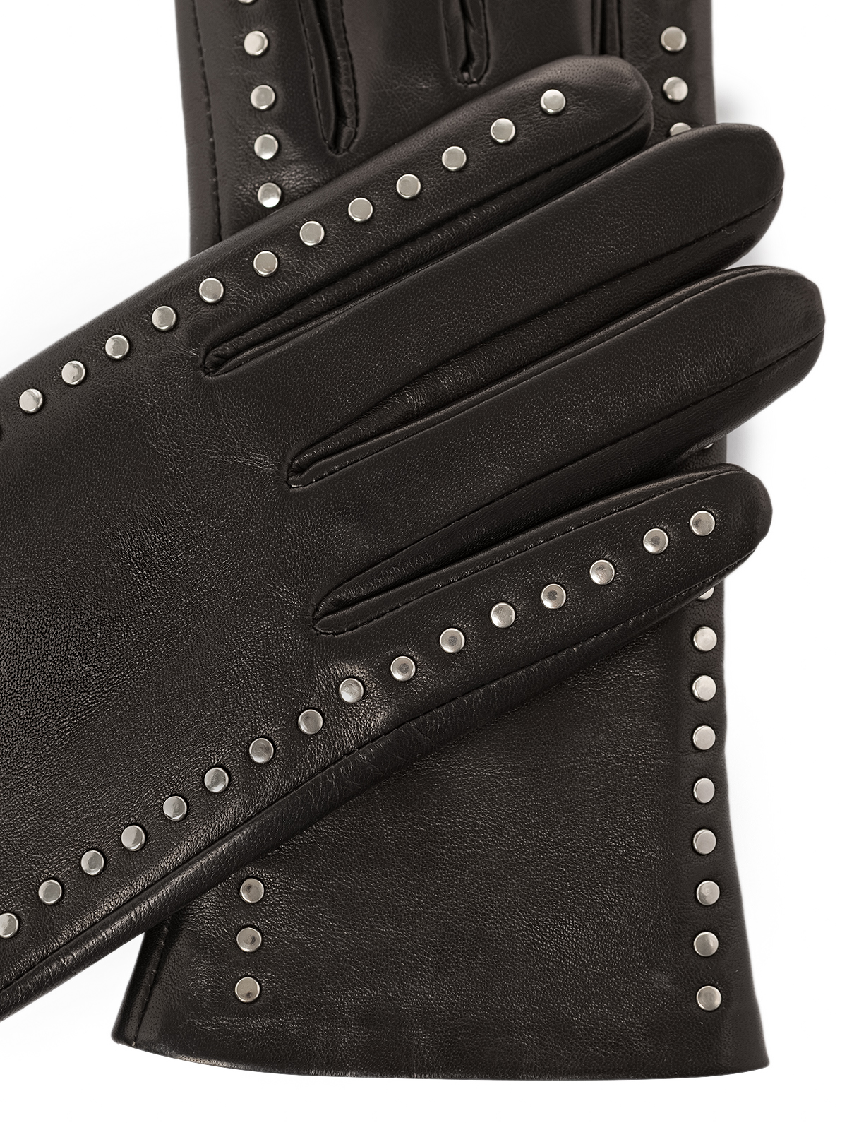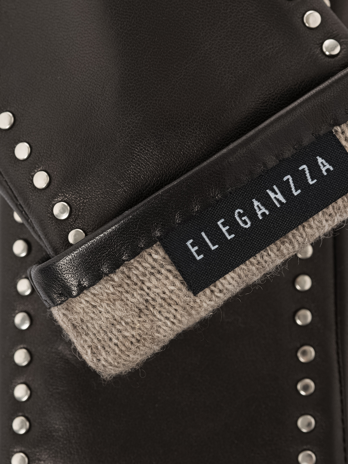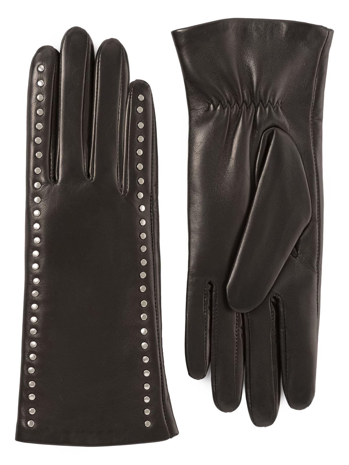 Женские перчатки торговой марки ELEGANZZA. Выполнены из высококачественной натуральной кожи ягненка на мягкой шерстяной подкладке. На лицевой стороне декорированы металлическими хольнитенами. Модель со средней длиной пальцев и длиной манжеты от нижней точки большого пальца до края перчаток - 6.5 см.