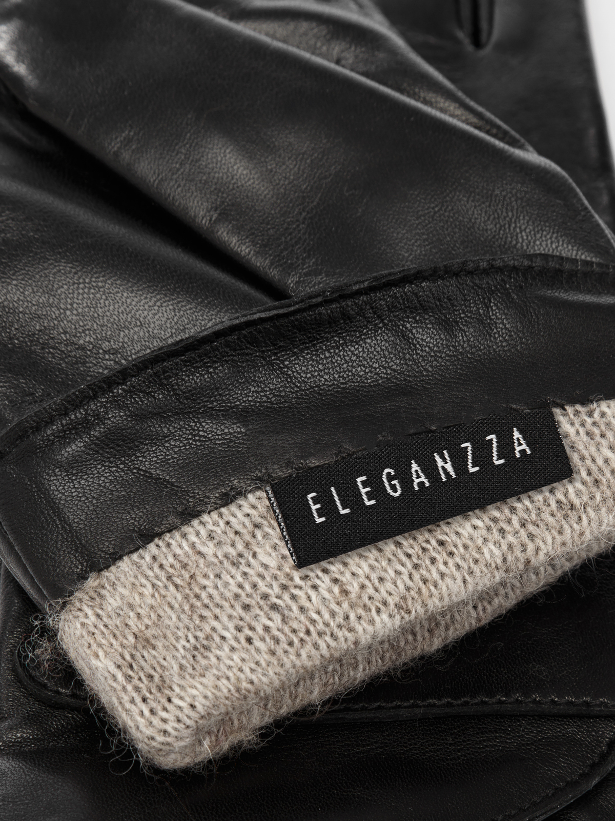 Перчатки женские торговой марки ELEGANZZA в черном цвете из натуральной кожи ягненка. Производство Китай. Подкладка: 100% шерсть. Декоративные элементы: фирменная фурнитура на фигурном ремешке; ассиметричная линия манжеты Длина манжета от нижней точки большого пальца до края перчаток - 4 см. Длина пальцев - средняя.