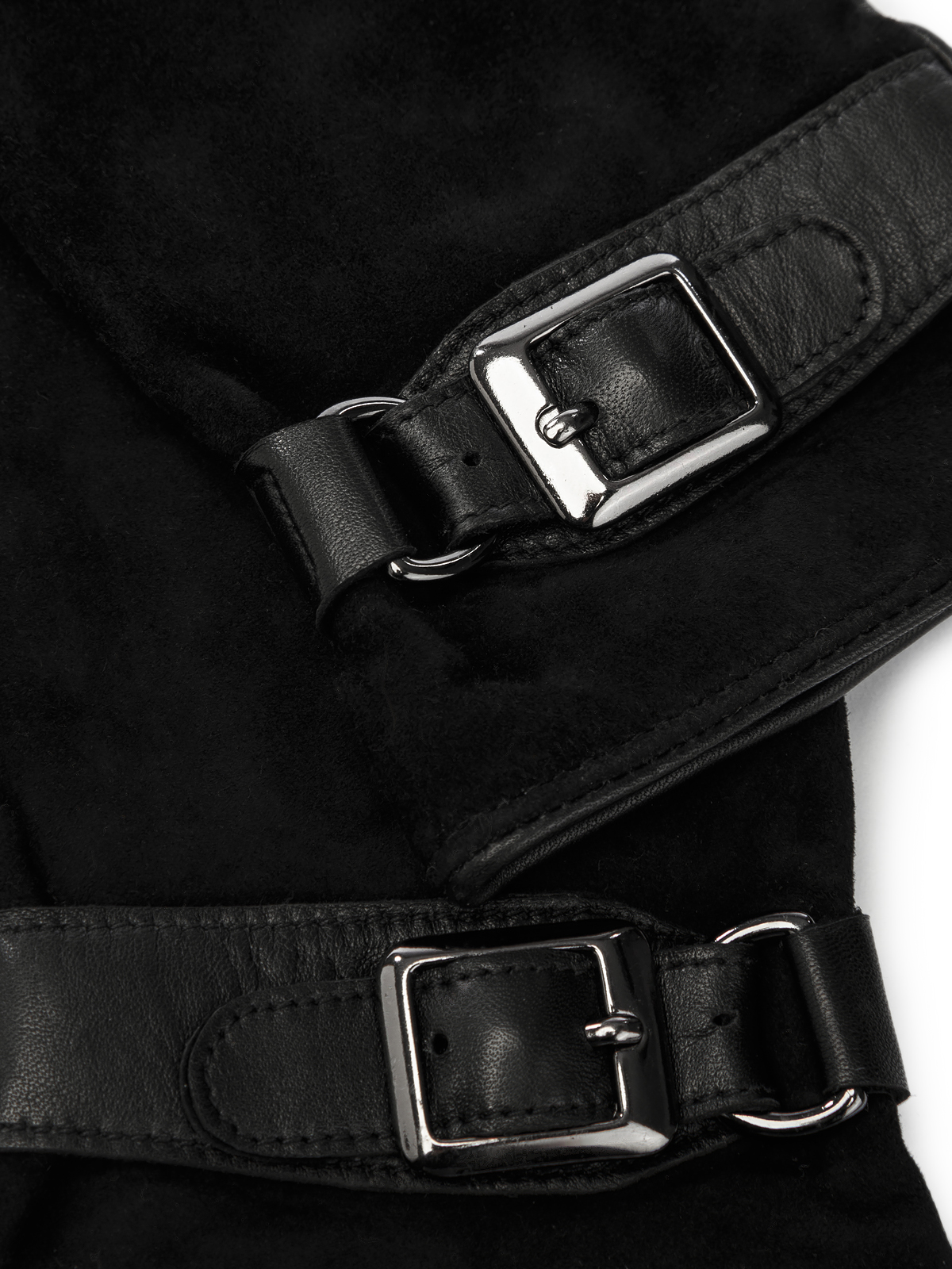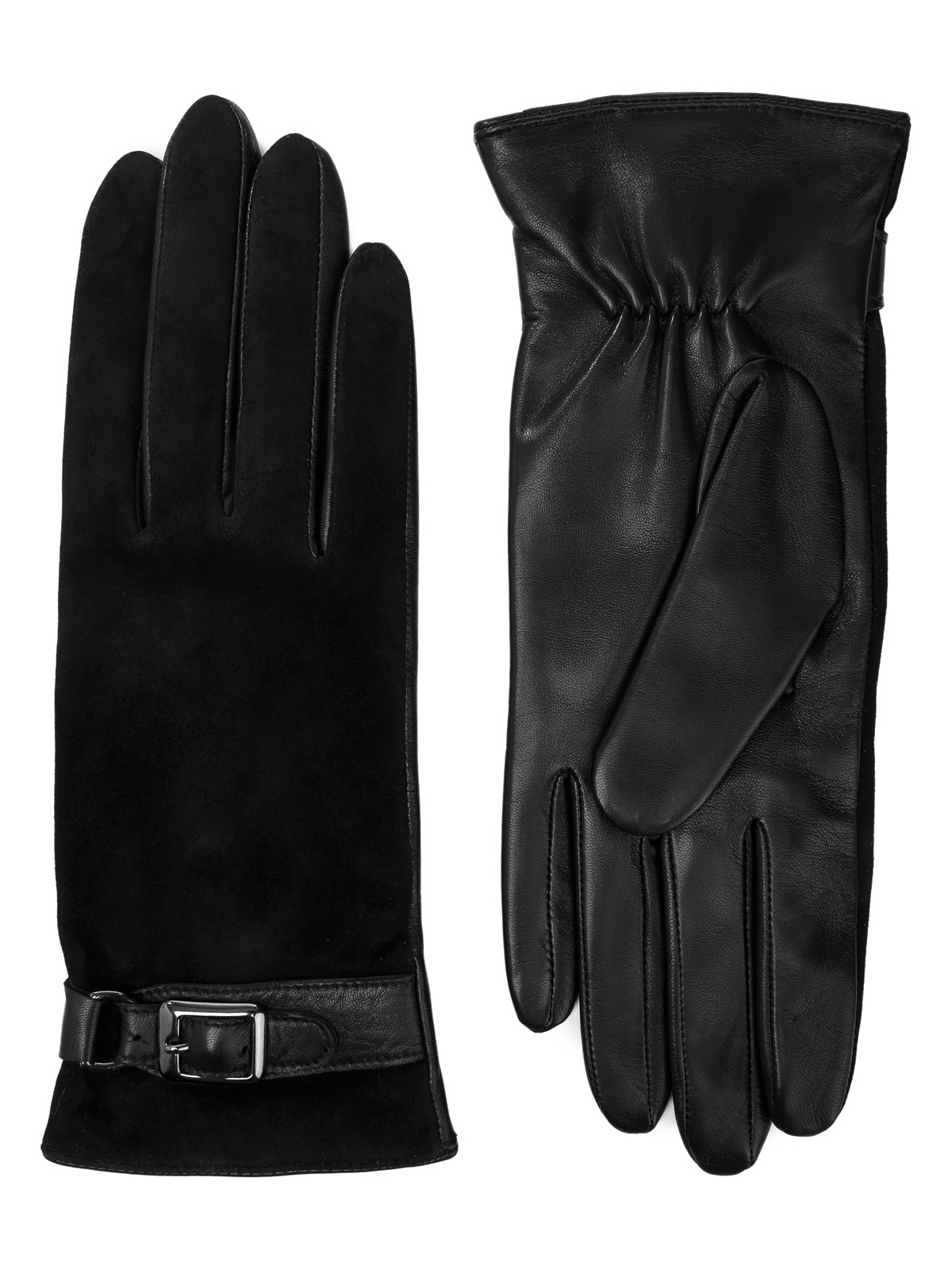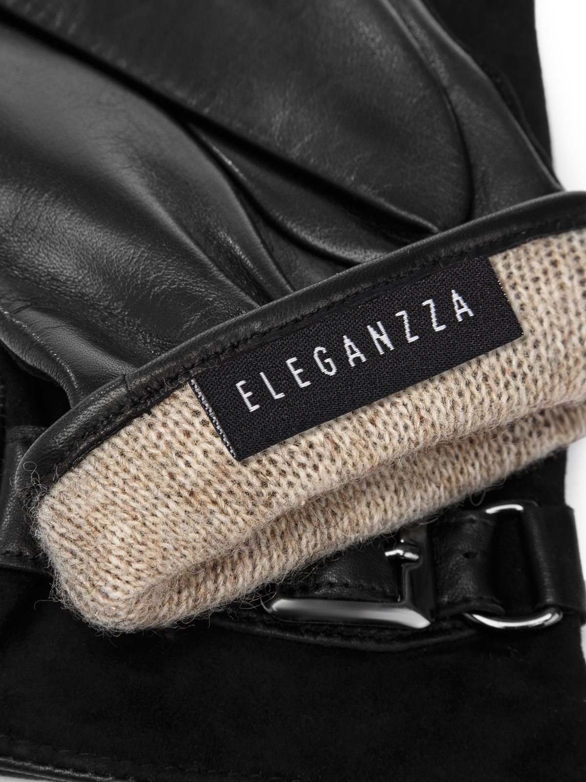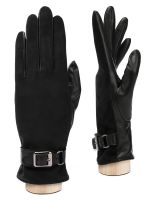 Перчатки женские торговой марки ELEGANZZA в черном цвете производства Китай изготовлены из натуральной кожи: верхняя часть - натуральный велюр ладонная часть - натуральная кожа ягненка. Подкладка: 100% шерсть. Декоративный кожаный ремень основного цвета с металлической пряжкой цвета никель. Длина манжета от нижней точки большого пальца до края перчаток составляет 55 см. Длина пальцев - средняя.