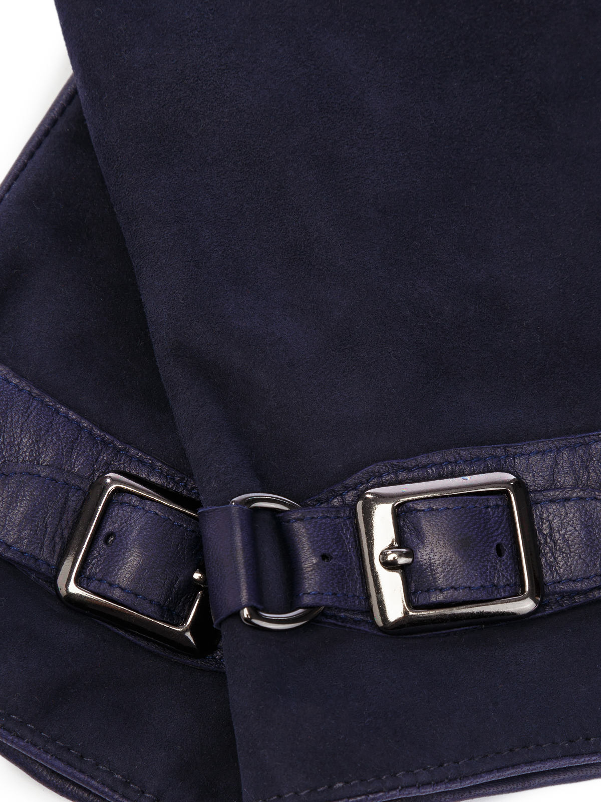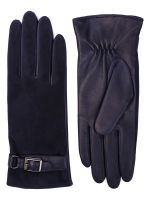 Перчатки женские торговой марки ELEGANZZA в черничном цвете производства Китай изготовлены из натуральной кожи: верхняя часть - натуральный велюр ладонная часть - натуральная кожа ягненка. Подкладка: 100% шерсть. Декоративный кожаный ремень основного цвета с металлической пряжкой цвета никель. Длина манжета от нижней точки большого пальца до края перчаток составляет 55 см. Длина пальцев - средняя.