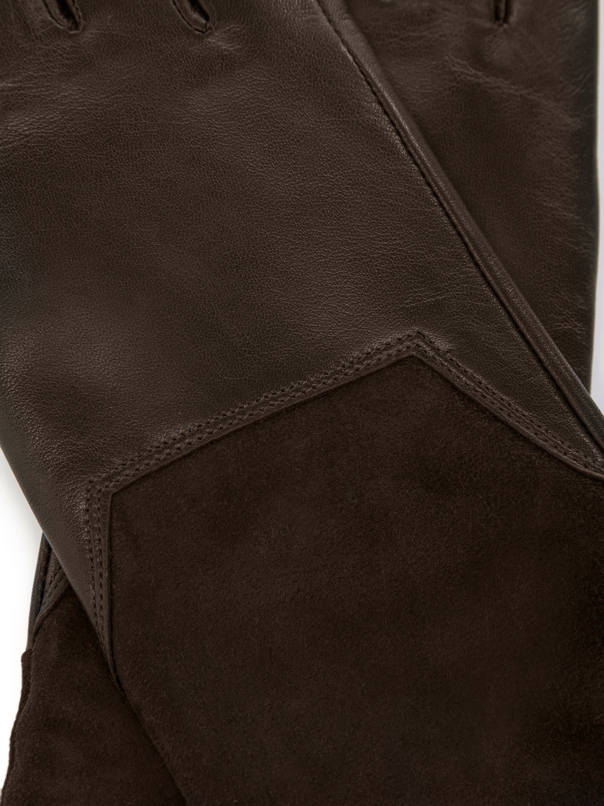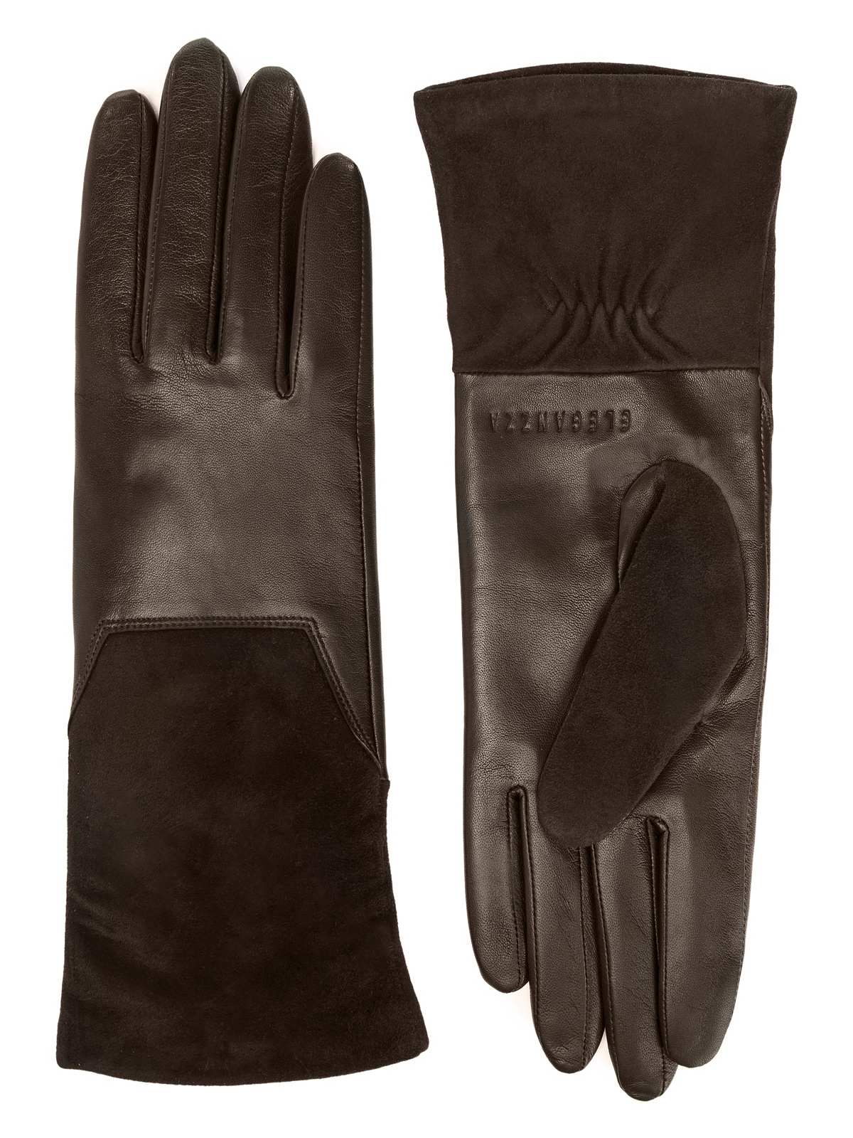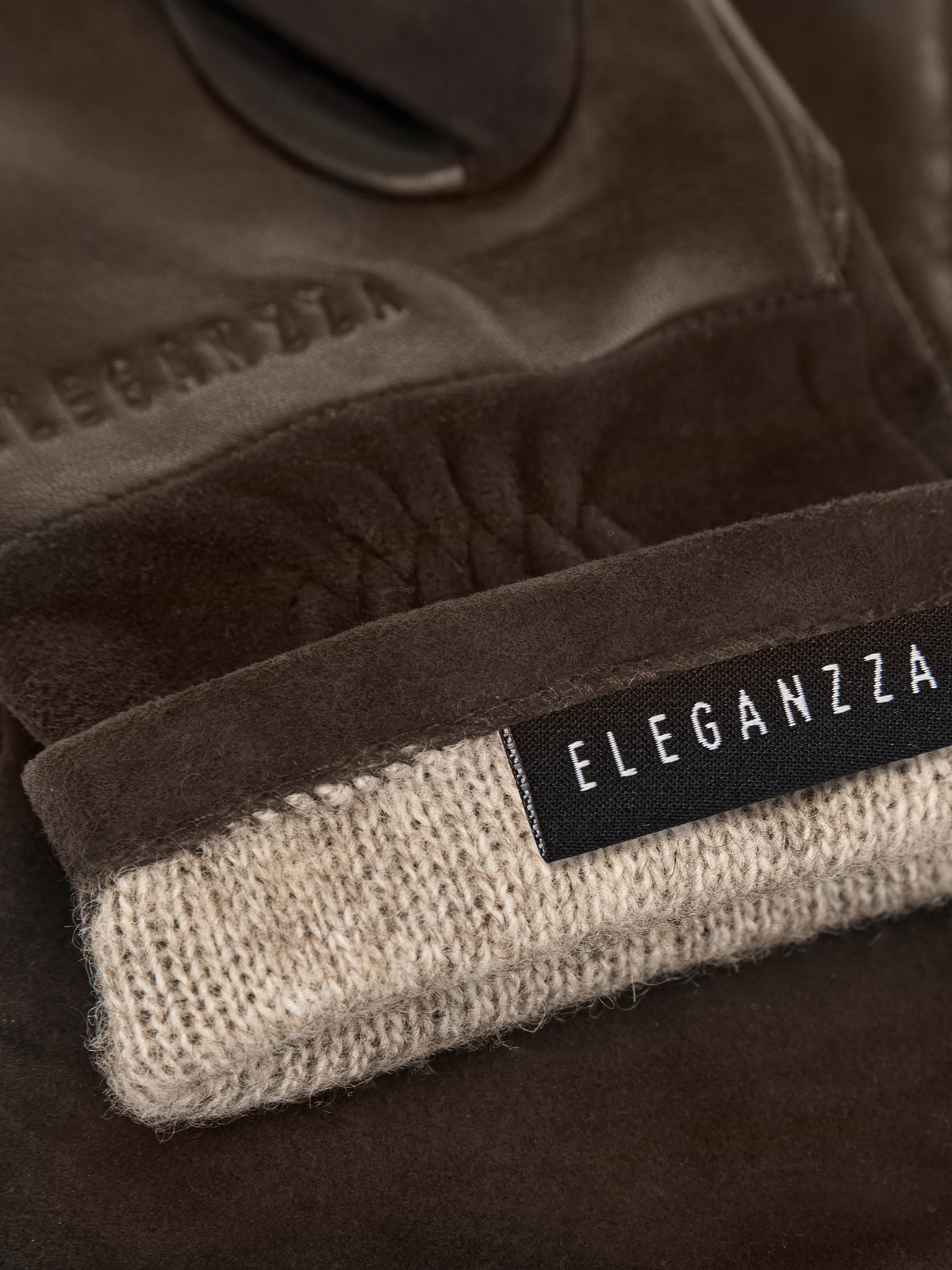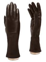 Перчатки женские торговой марки ELEGANZZA в коричневом цвете производства Китай изготовлены из натуральной кожи: основная часть перчатки - натуральная кожа ягненка манжеты и половина большого пальца выполнены из натурального велюра. На ладонной части перчатки штамп с логотипом ELEGANZZA". Подкладка: 100% шерсть. Длина манжета от нижней точки большого пальца до края перчаток составляет 11 см. Длина пальцев - средняя."