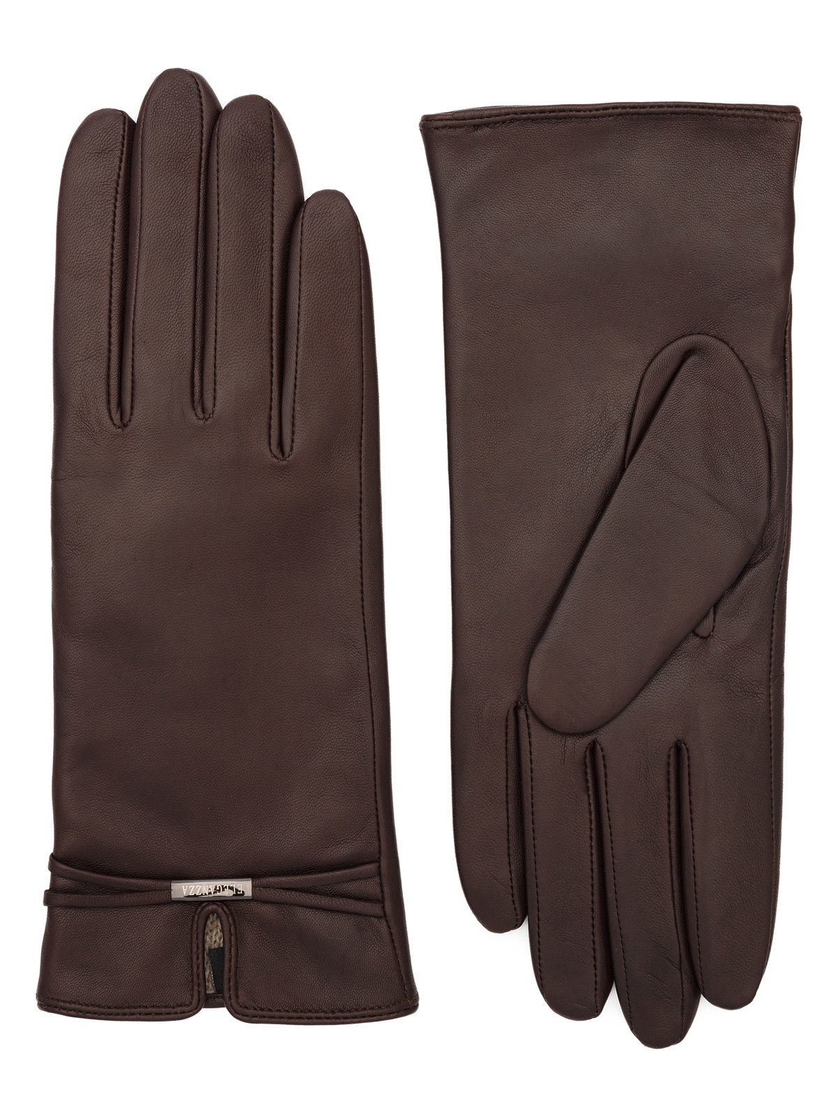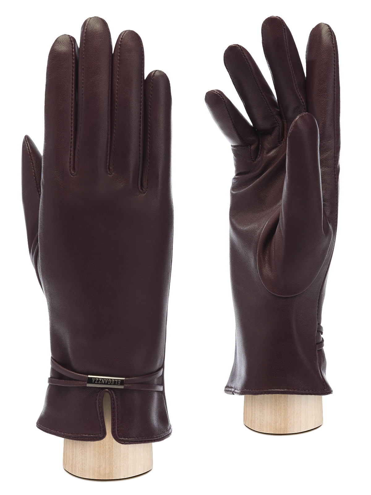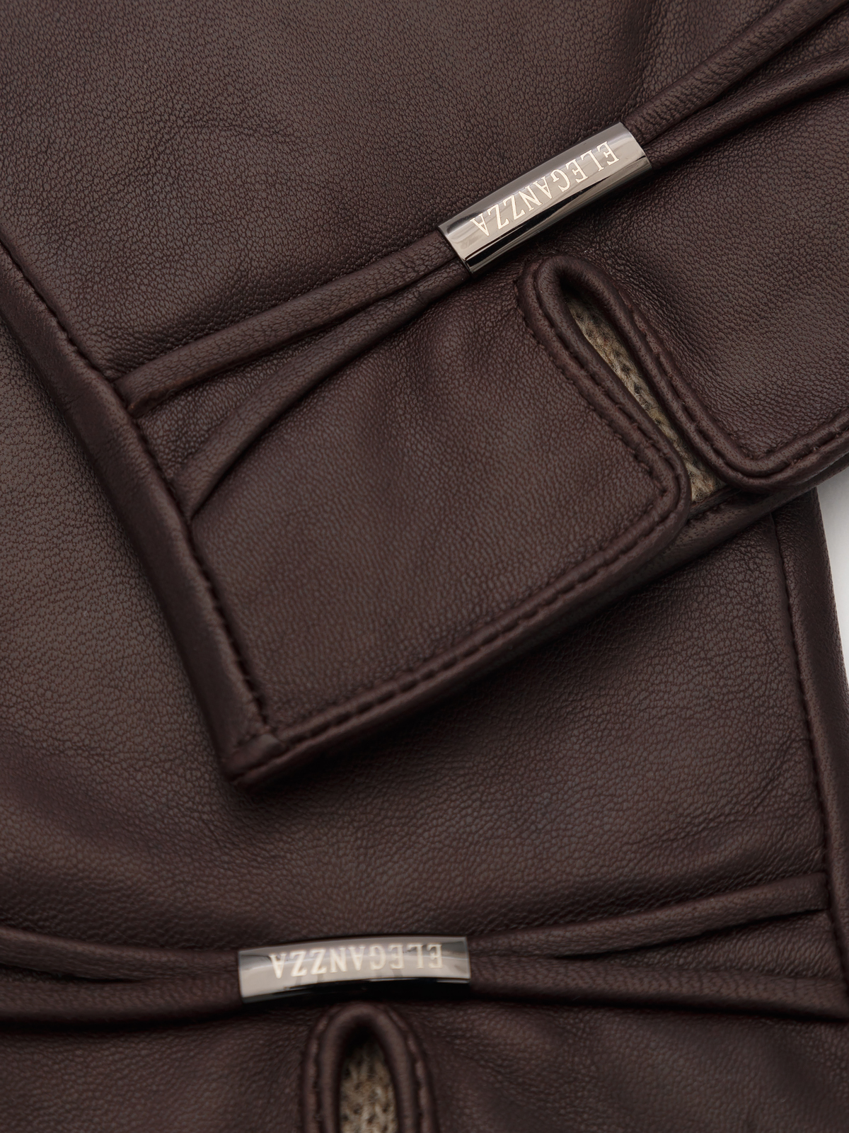Перчатки торговой марки ELEGANZZA производства Китай выполнены из кожи ягнёнка темно-коричневого цвета. Подкладка: 100% шерсть. Декоративные элементы - фирменная фурнитура на узких кожаных ремнях. Нижний край перчатки и разрез на лицевой стороне окантованы. Длина манжеты от нижней точки большого пальца до края перчаток - 6 см.