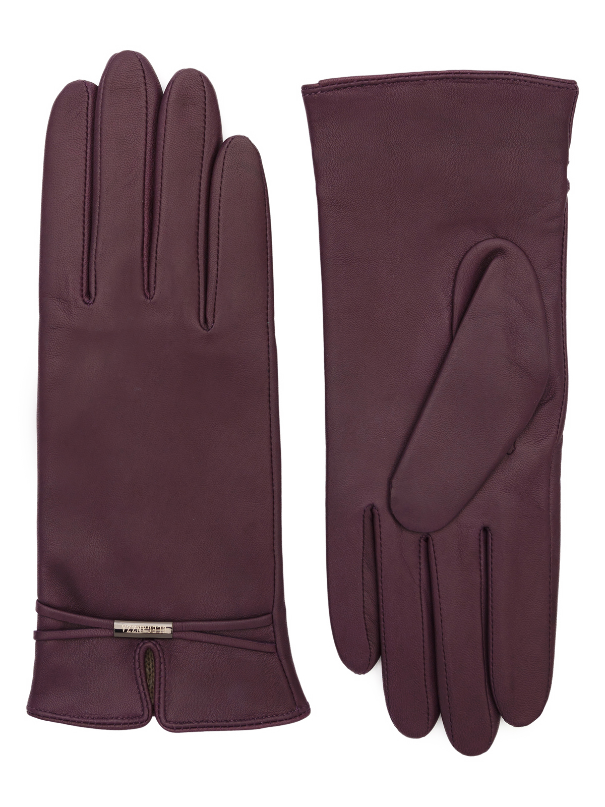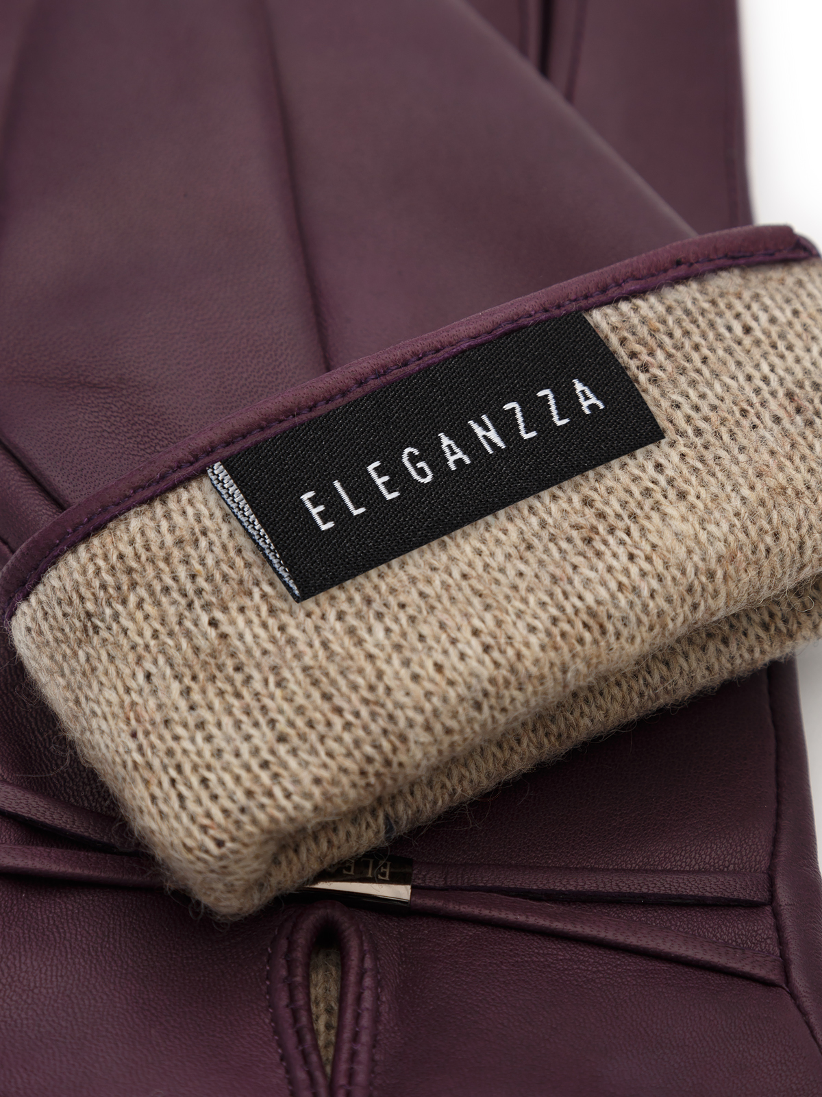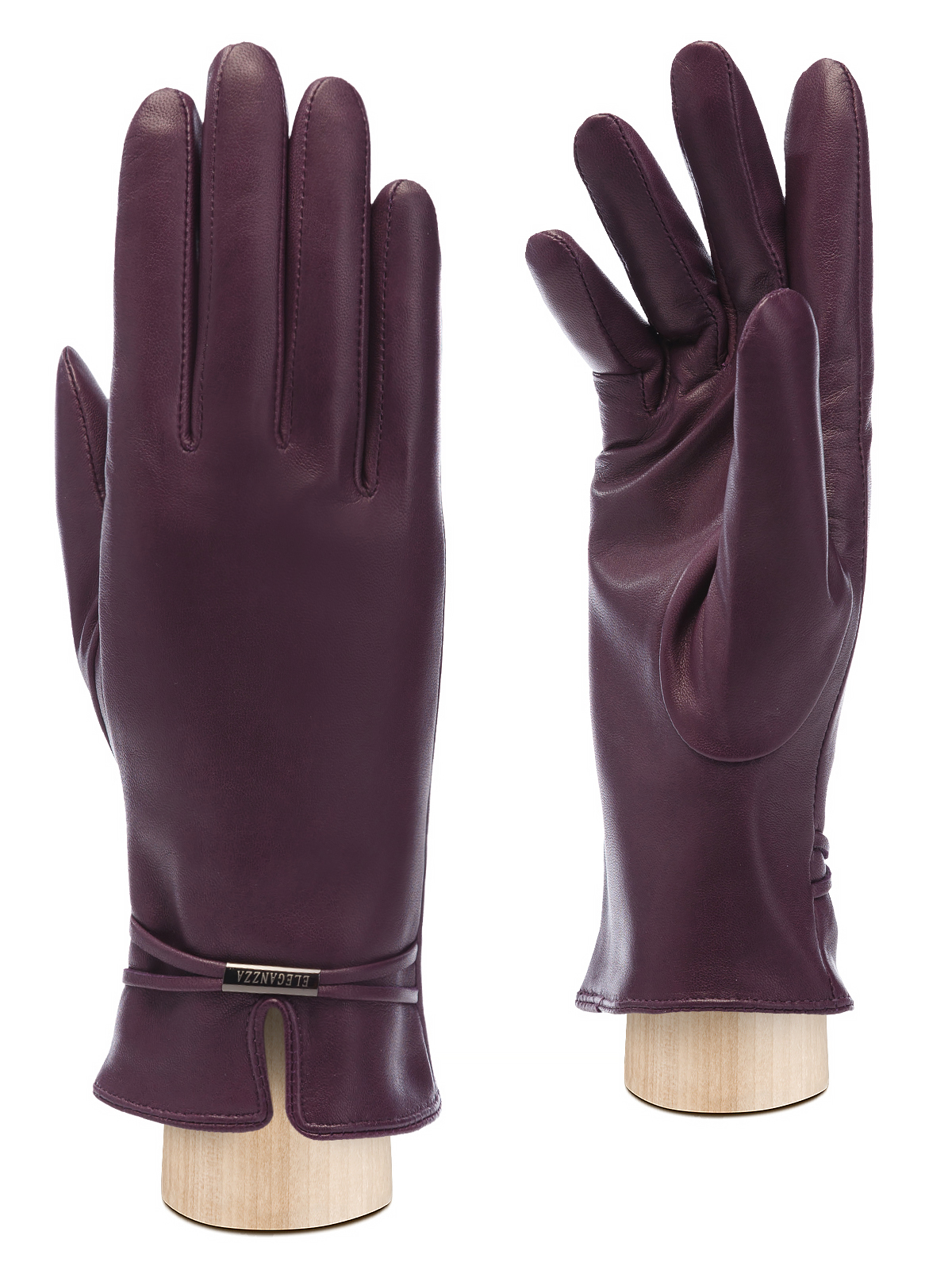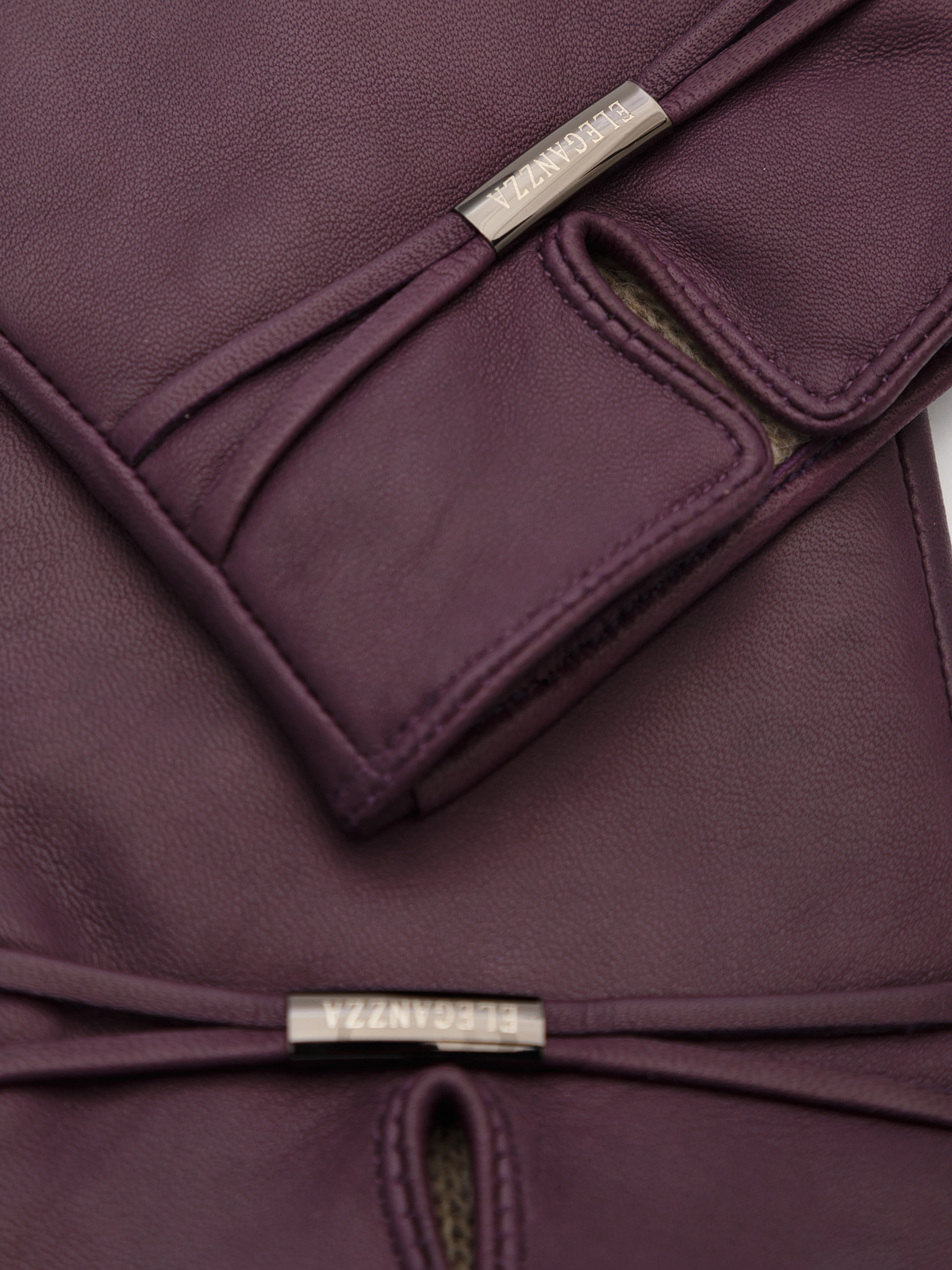 Перчатки торговой марки ELEGANZZA производства Китай выполнены из кожи ягнёнка темно-фиолетового цвета. Подкладка: 100% шерсть. Декоративные элементы - фирменная фурнитура на узких кожаных ремнях. Нижний край перчатки и разрез на лицевой стороне окантованы. Длина манжеты от нижней точки большого пальца до края перчаток - 6 см.