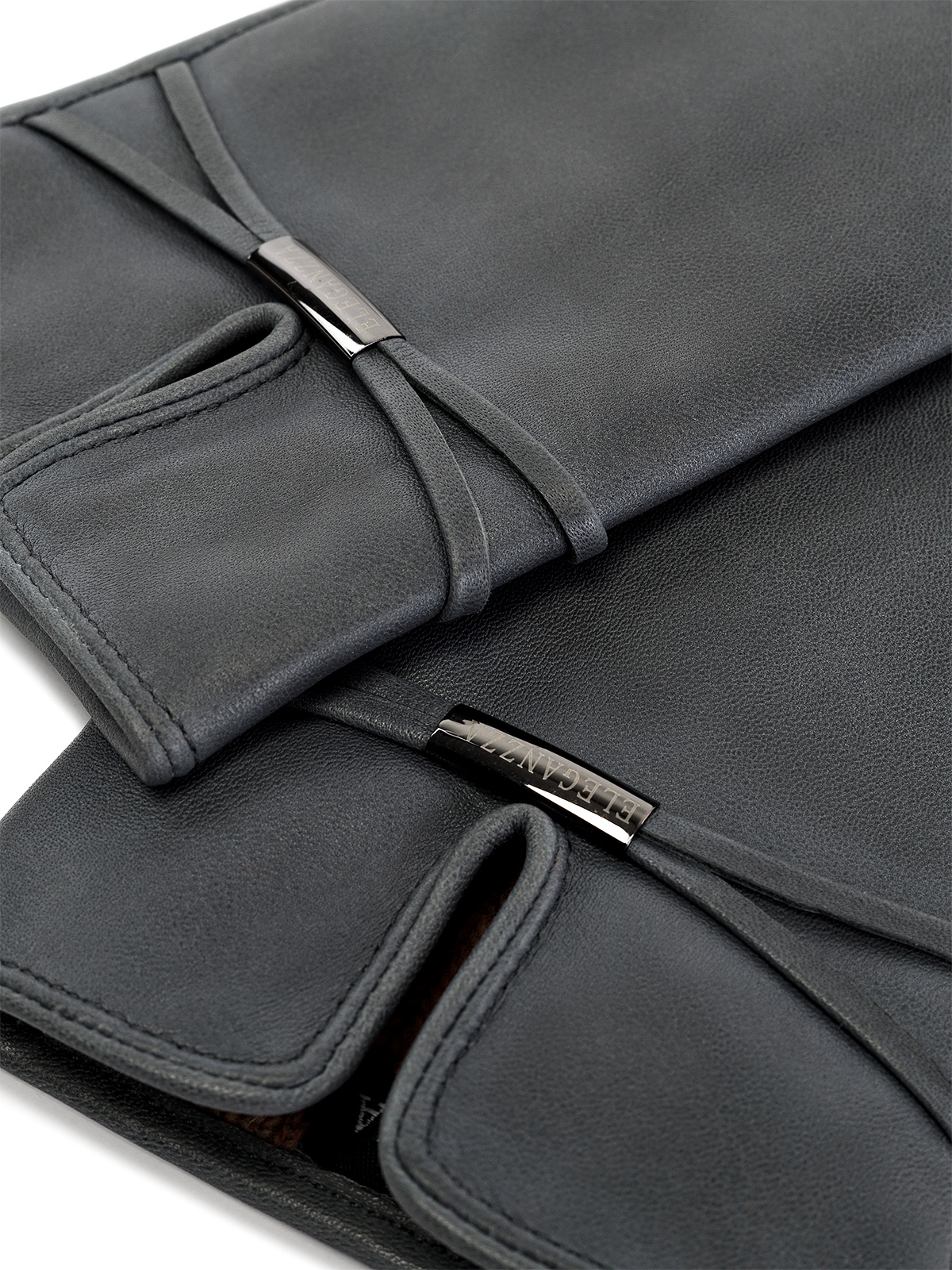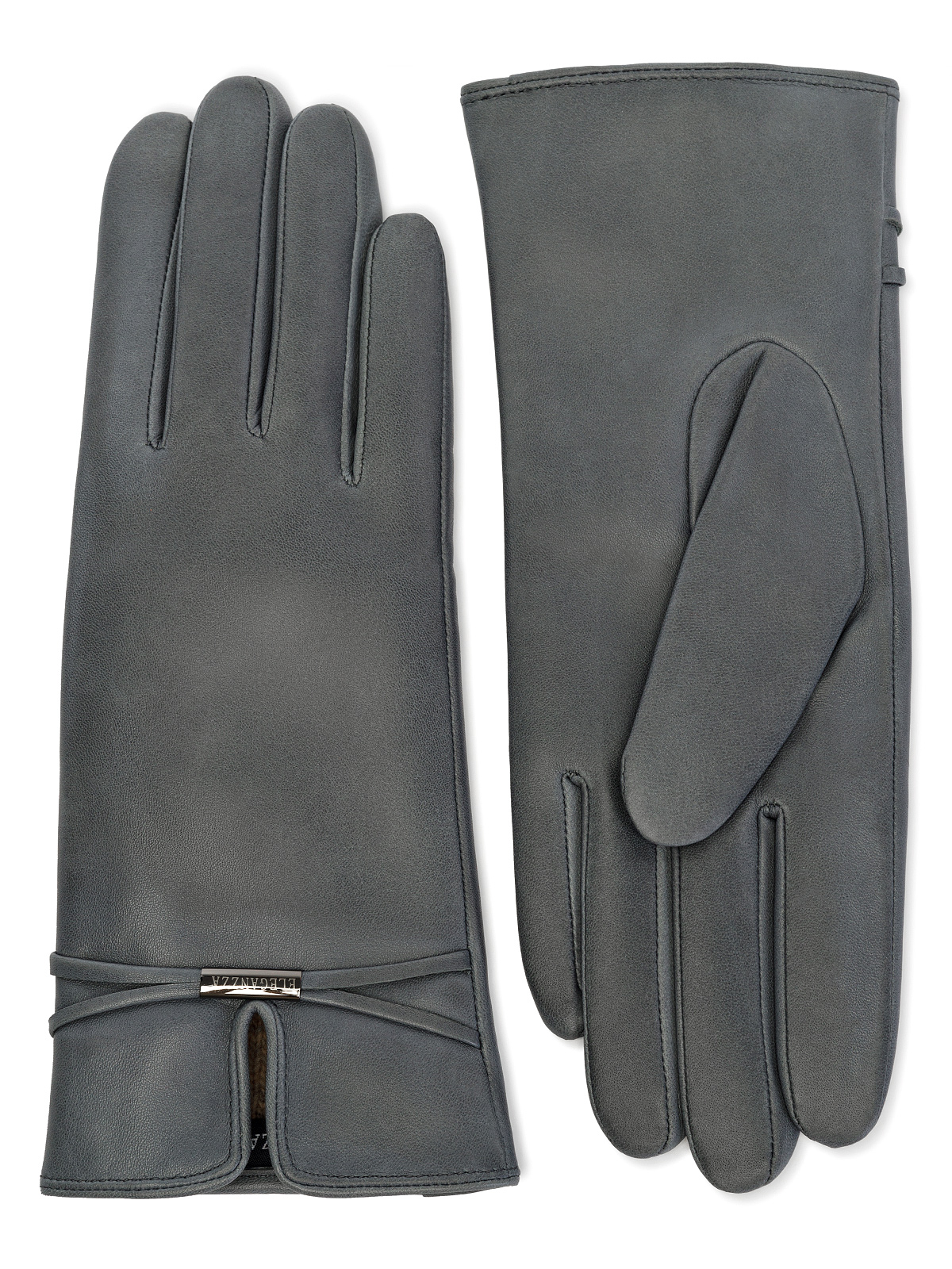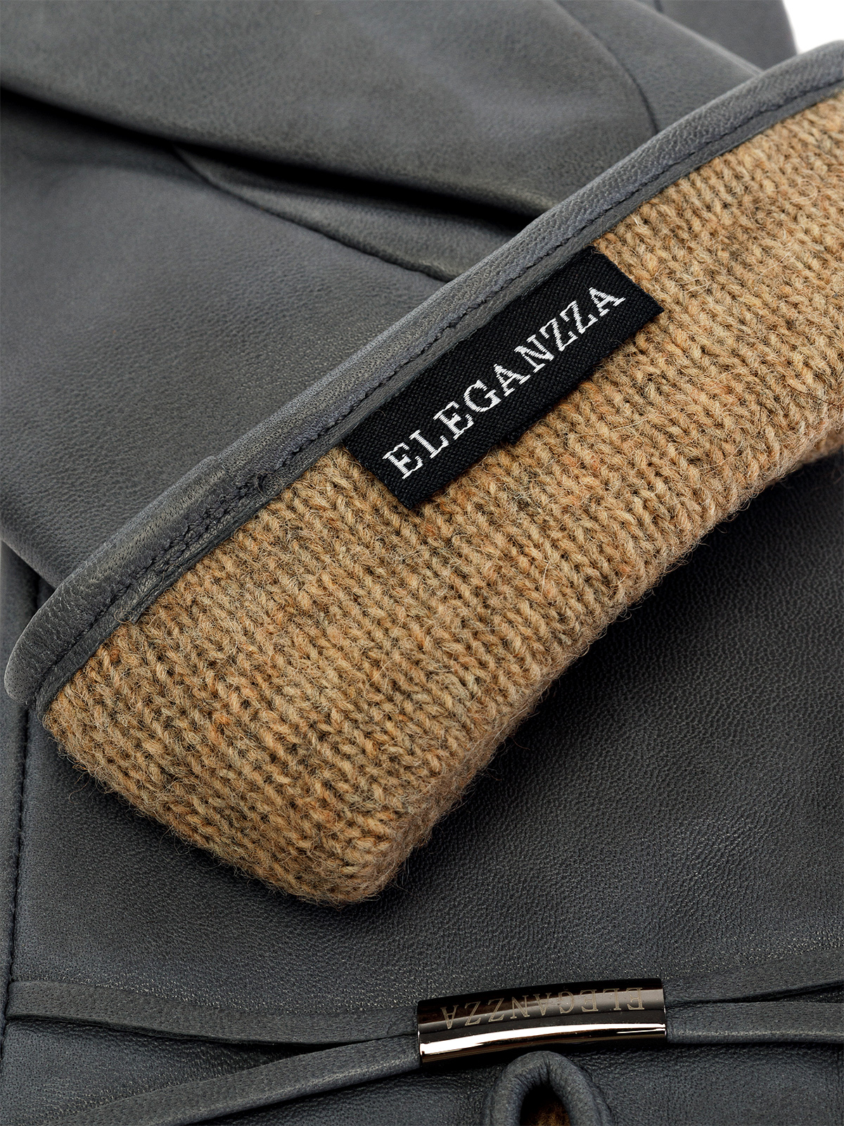 Перчатки торговой марки ELEGANZZA производства Китай выполнены из кожи ягнёнка чёрного цвета. Подкладка: 100% шерсть. Декоративные элементы - фирменная фурнитура на узких кожаных ремнях. Нижний край перчатки и разрез на лицевой стороне окантованы. Длина манжеты от нижней точки большого пальца до края перчаток - 6 см.