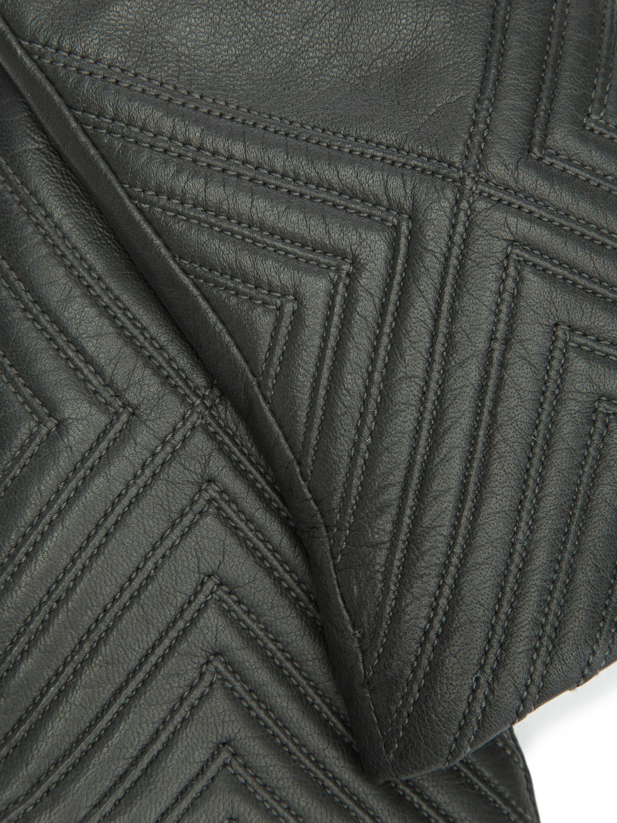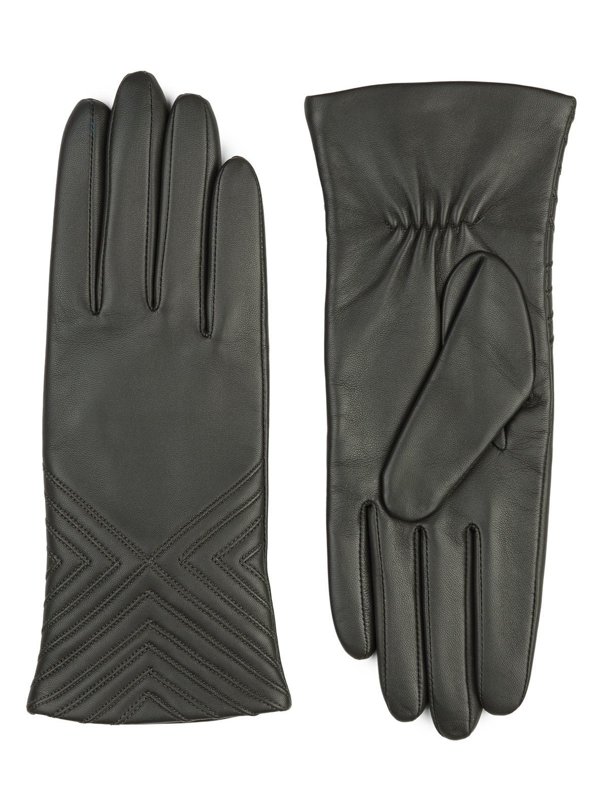 Перчатки женские торговой марки ELEGANZZA производства Китай. Выполнены из натуральной кожи ягненка. Подкладка - 100% шерсть. Отделка - геометрические декоративные строчки по лицевой части перчатки. Длина манжеты от нижней точки большого пальца до края перчаток - 6 см. Длина пальцев - средняя.