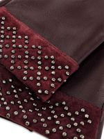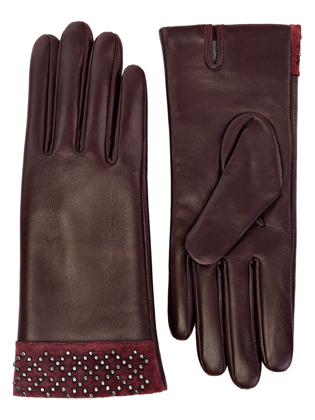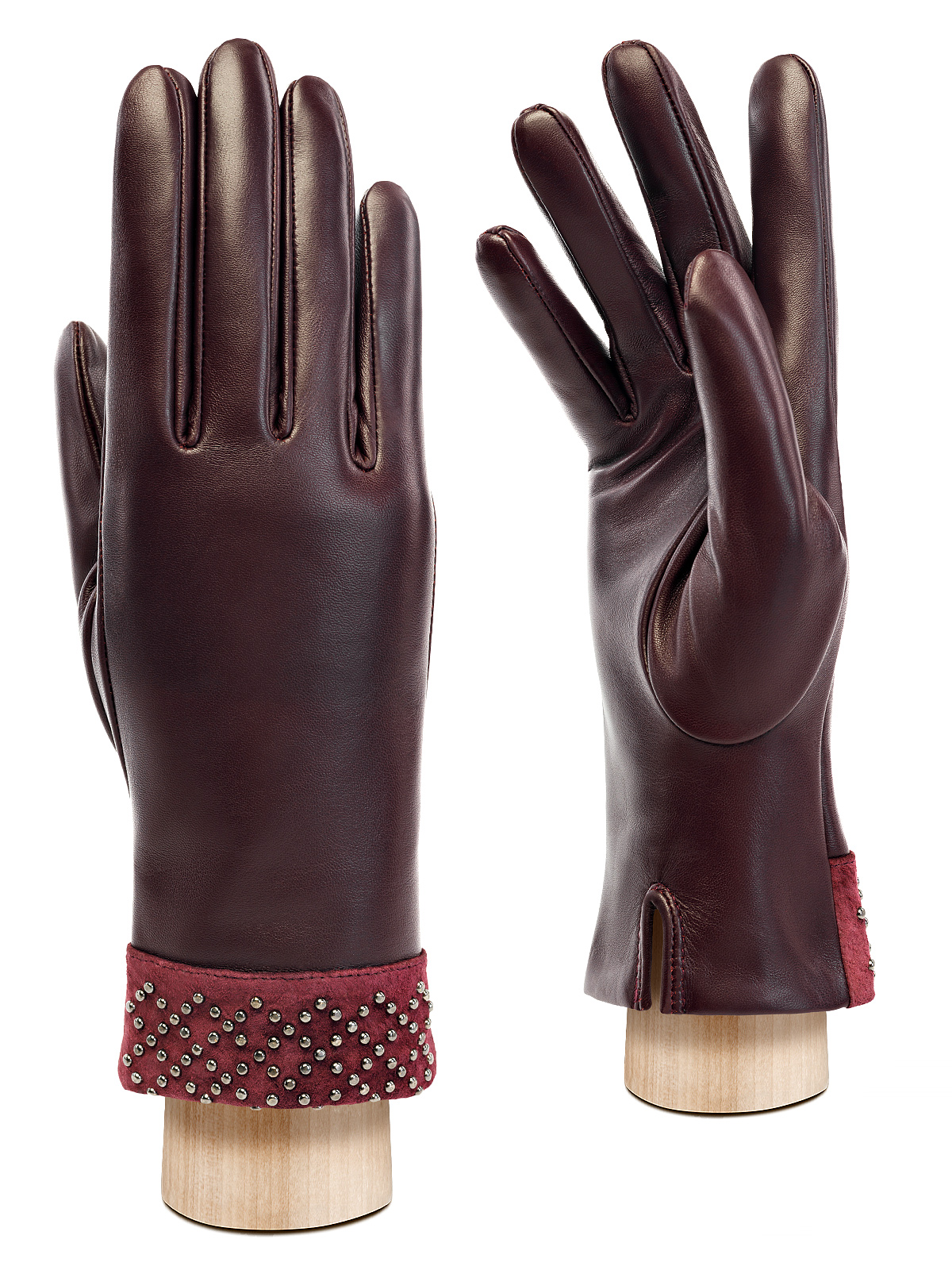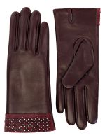 Перчатки женские торговой марки ELEGANZZA из натуральной кожи ягненка. Производство Китай. Подкладка: 100% шерсть. Отделка - манжет из натурального велюра в тон украшенного раскладкой из хольнитенов с имитацией браслета. Разрез на ладонной части. Длина манжеты от нижней точки большого пальца до края перчаток - 6 см. Длина пальцев - средняя.