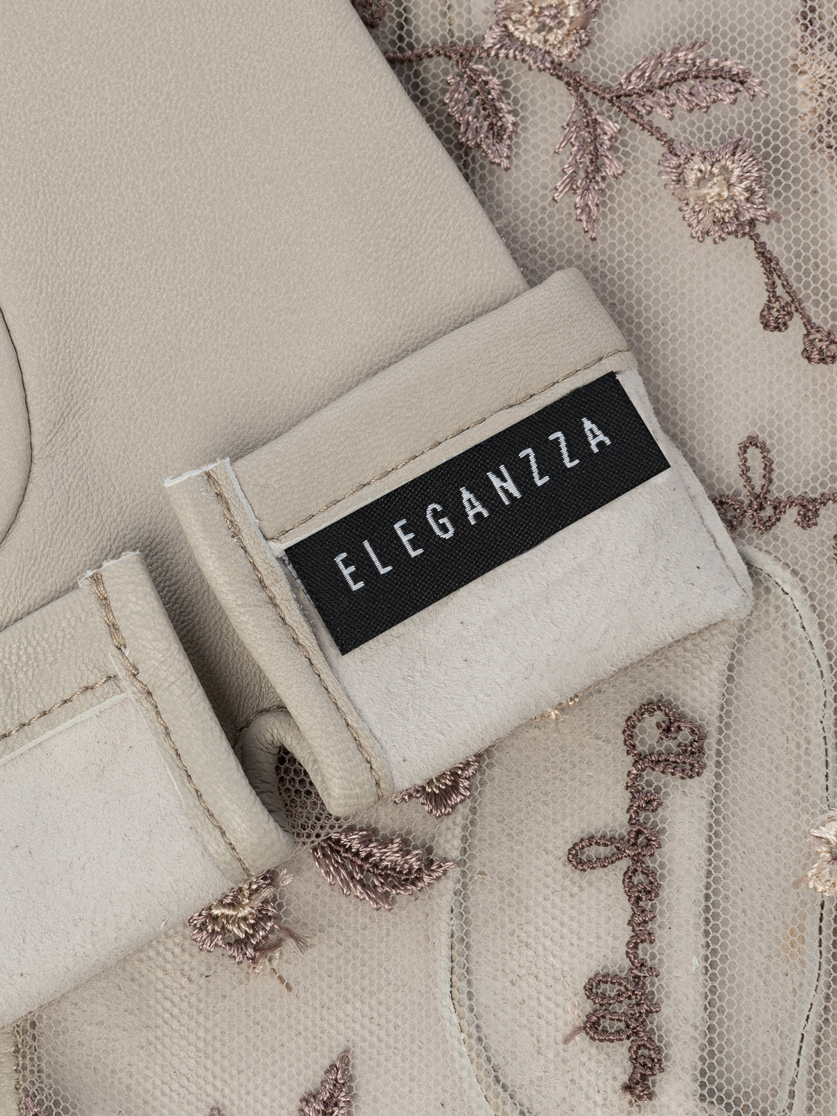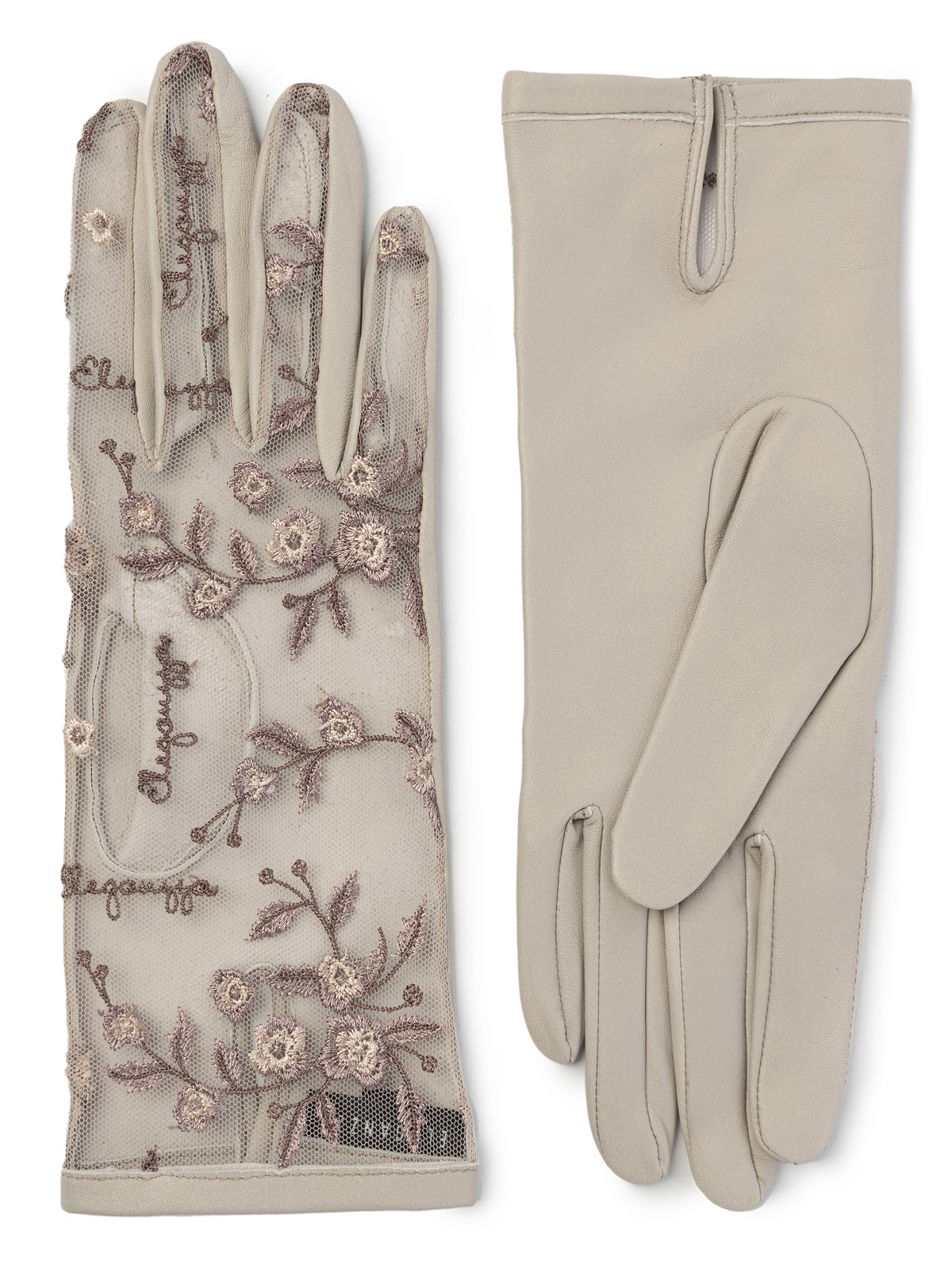 Перчатки женские торговой марки ELEGANZZA из натуральной кожи ягненка производства Италия. Подкладка: без подкладки. Лицевая сторона модели выполнена из дизайнерского брендированного гипюра на ладонной части разрез. Длина манжеты от нижней точки большого пальца до края перчаток - 6.5 см. Длина пальцев - средняя.