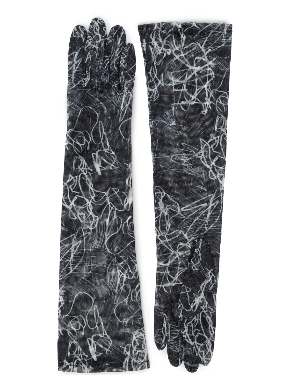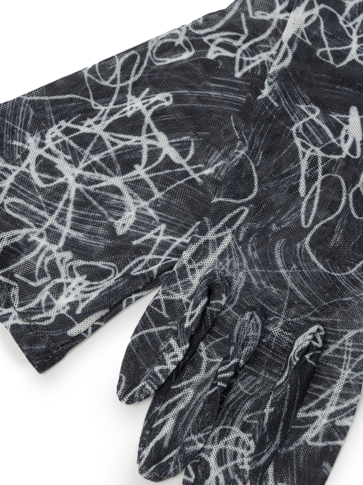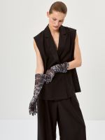 Текстильные полупрозрачные женские перчатки торговой марки ELEGANZZA в черном цвете. Декоративная отделка - принт соответствующий стилистике коллекциии текущего сезона. Длина манжета от нижней точки большого пальца до края перчаток составляет 26 см. Длина пальцев - средняя.