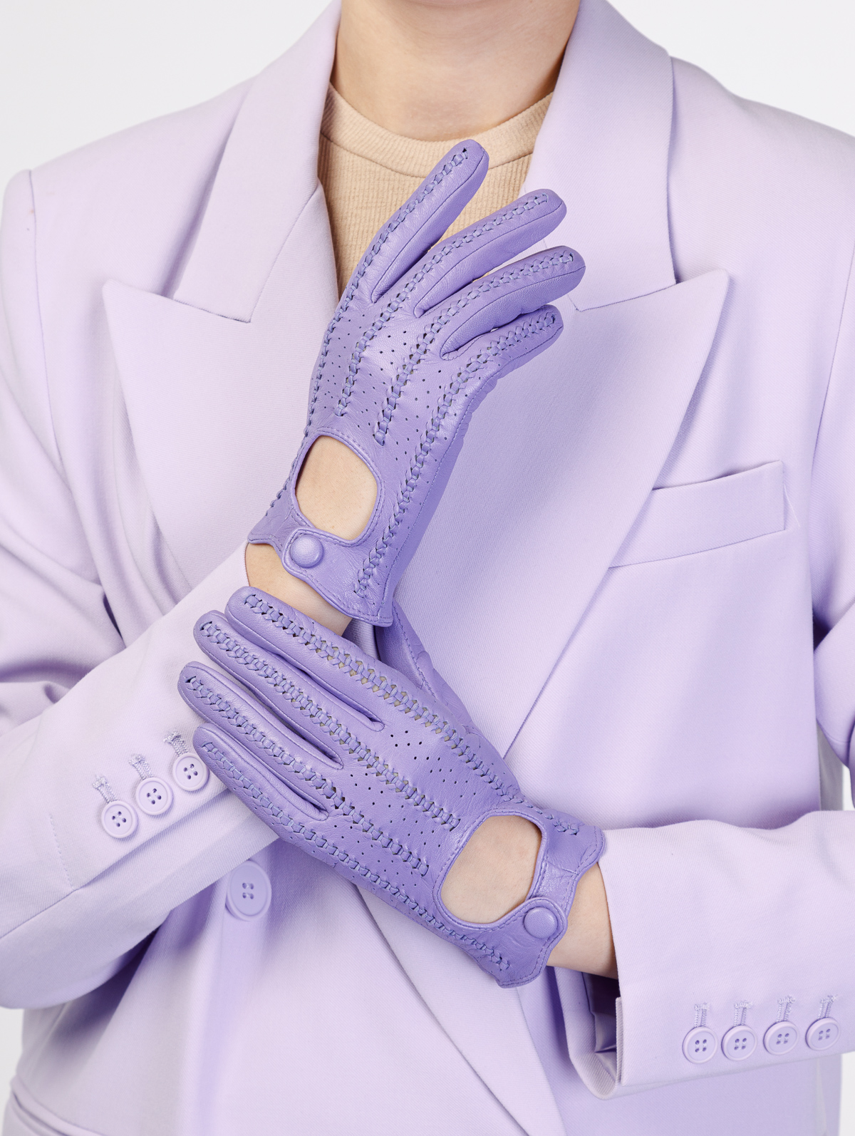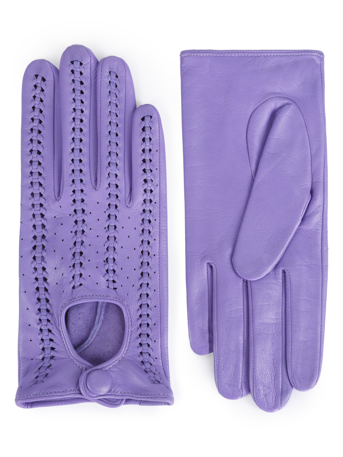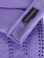 Перчатки торговой марки ELEGANZZA производства Китай выполнены из натуральной кожи ягнёнка. Без подкладки. Декоративные элементы - плетение тонким кожаным шнурком выполненное в ручную на лицевой стороне вырез и кнопка обтянутая кожей. Длина манжеты от нижней точки большого пальца до края перчаток - 3 см. Длина пальцев - средняя.