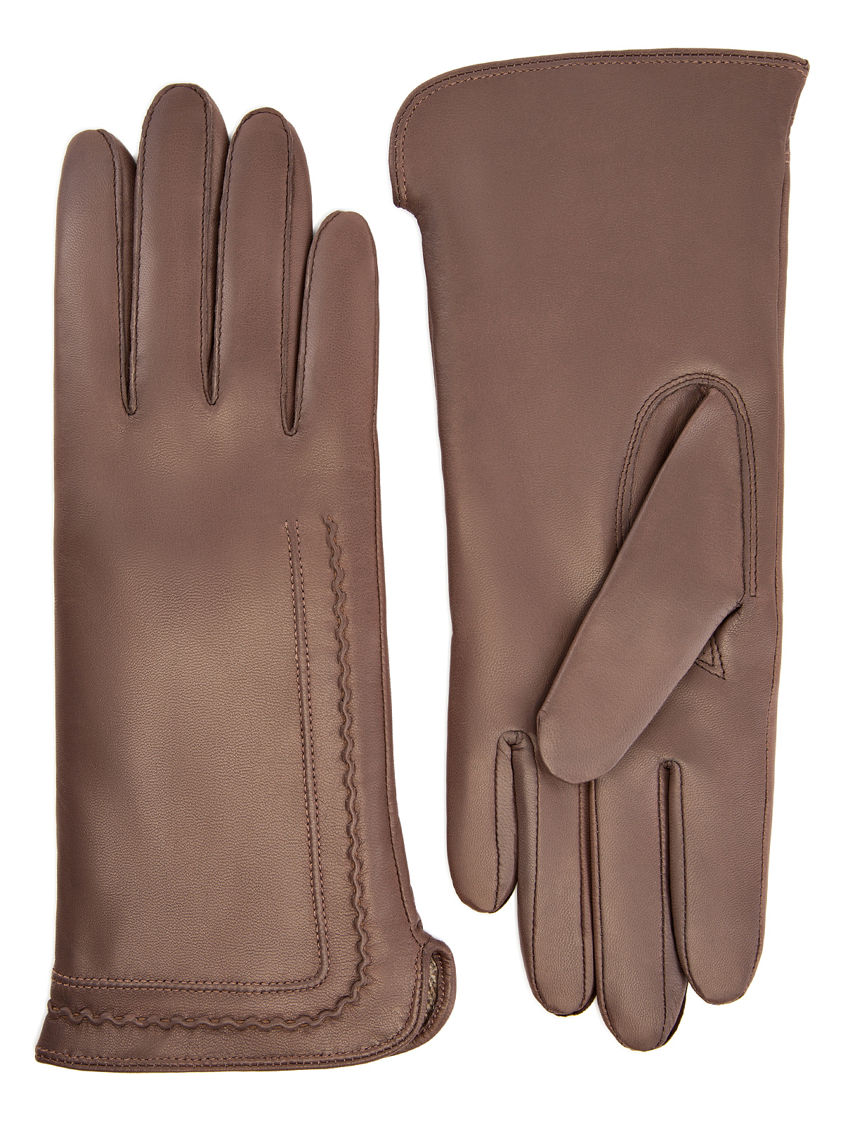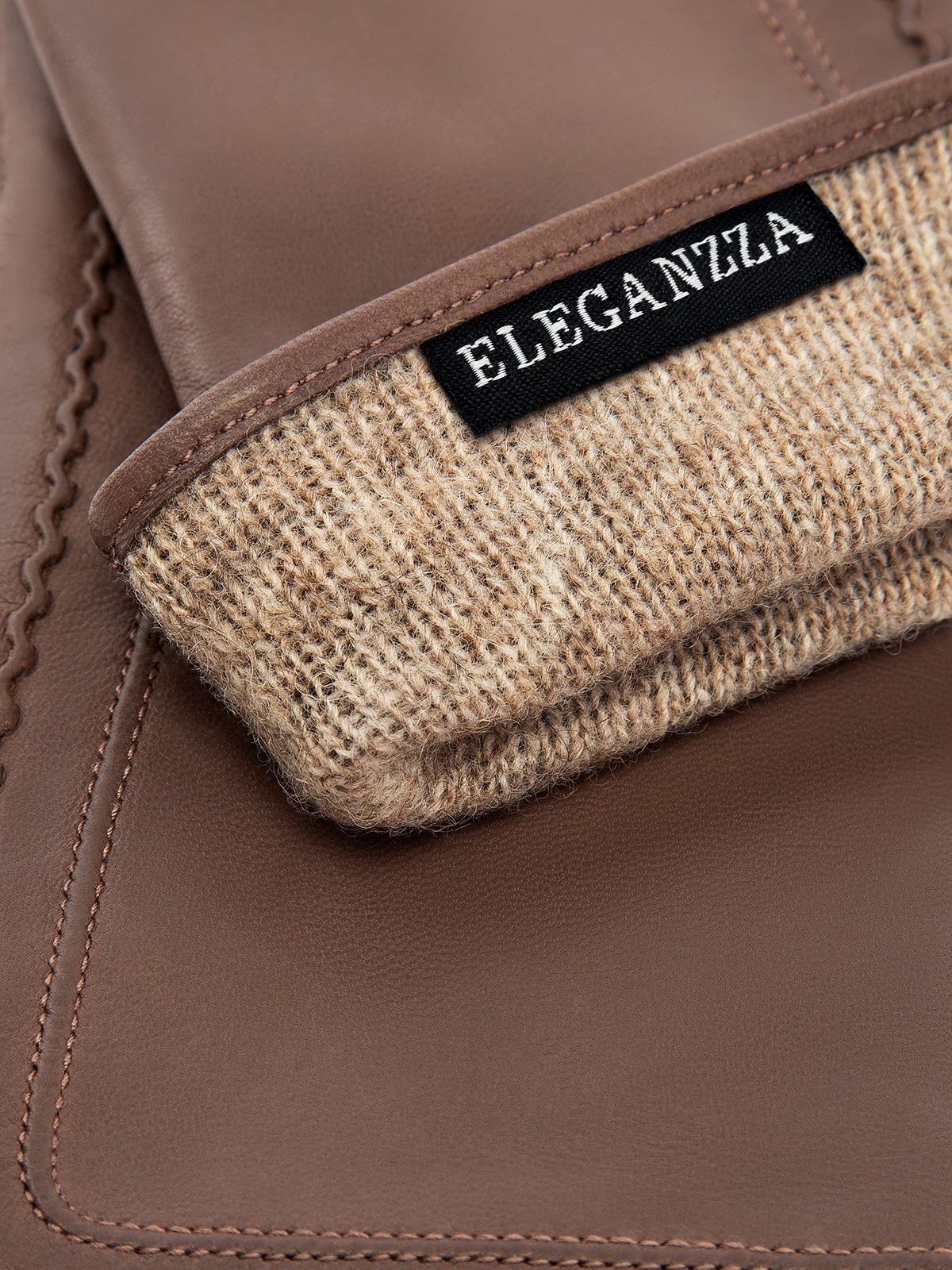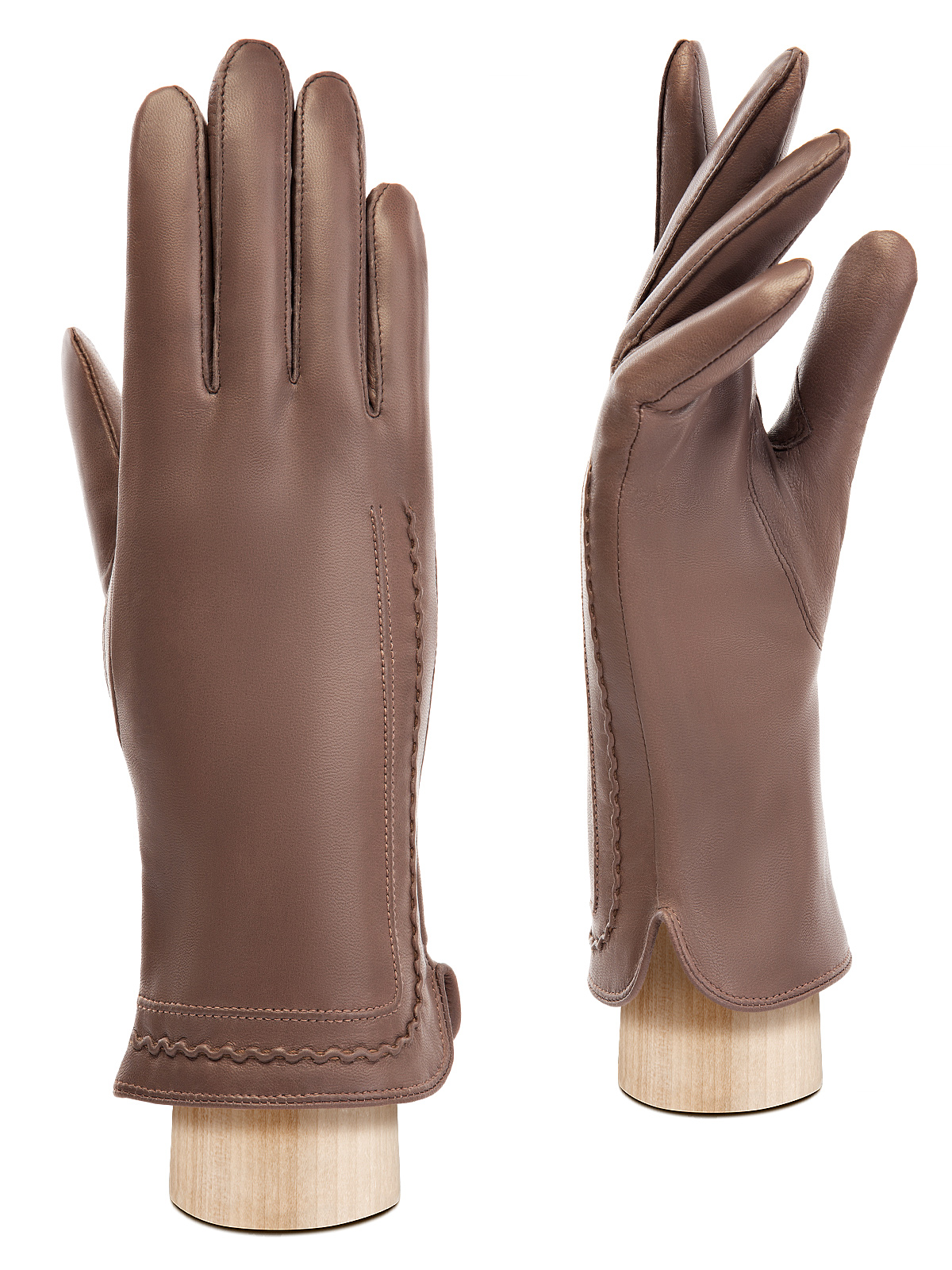 Перчатки торговой марки ELEGANZZA выполнены из натуральной кожи ягненка производства Италии. Подкладка 85% шерсть 15%кашемир. Низ - фигурная манжета отделка - декоративный машинный шов. Длина манжеты от нижней точки большого пальца до края перчаток - 7 см. Длина пальцев - укороченные.