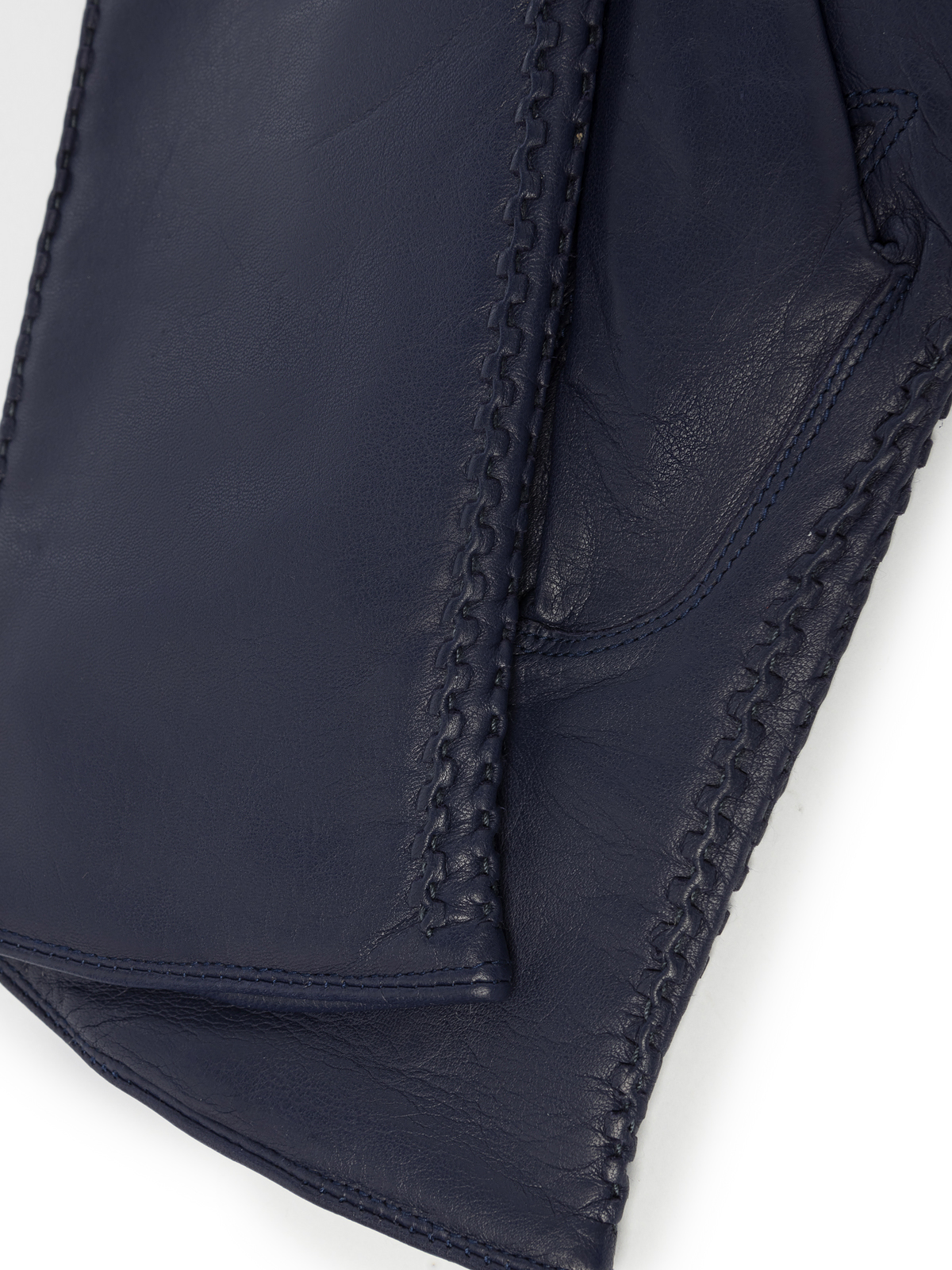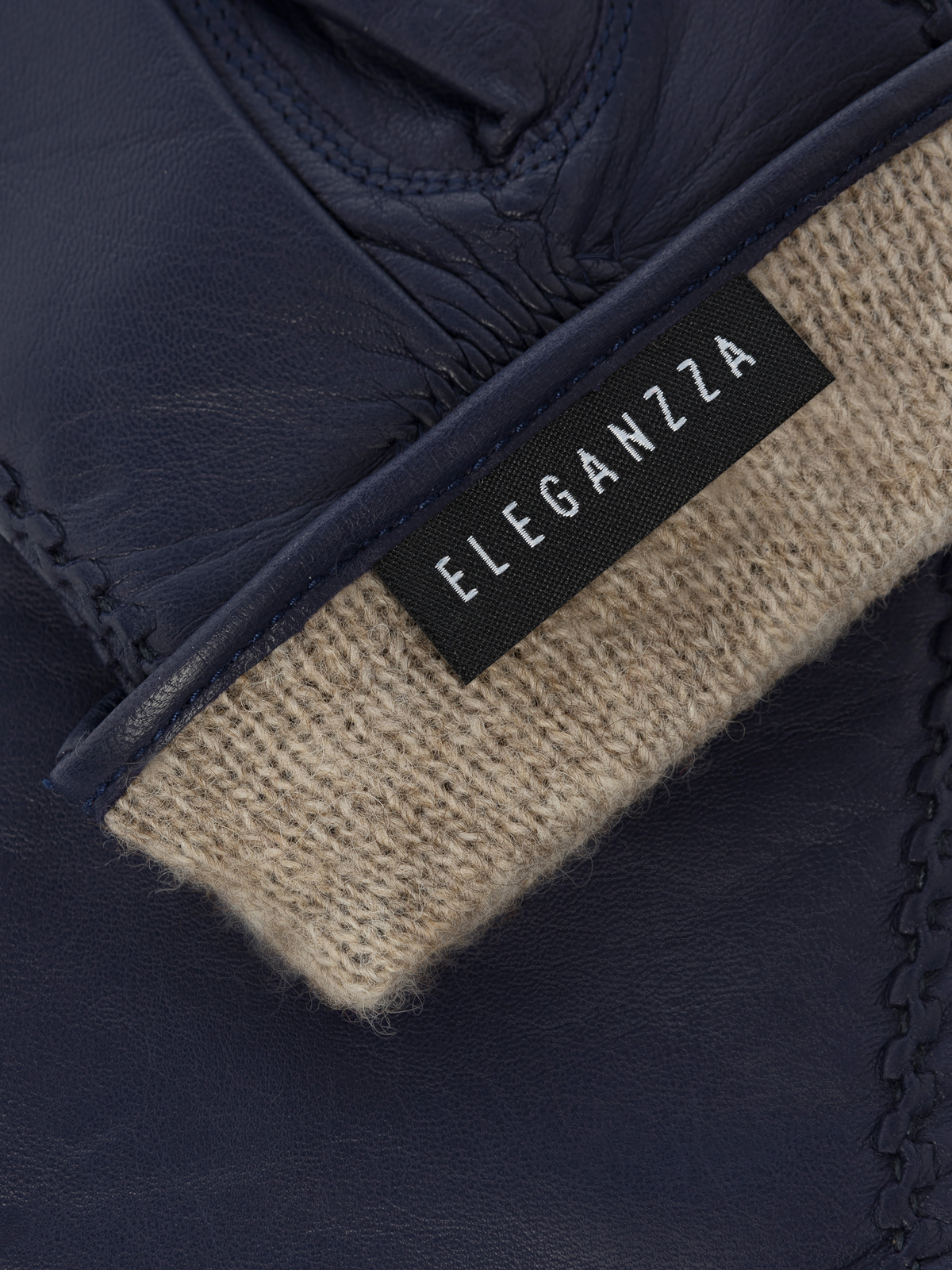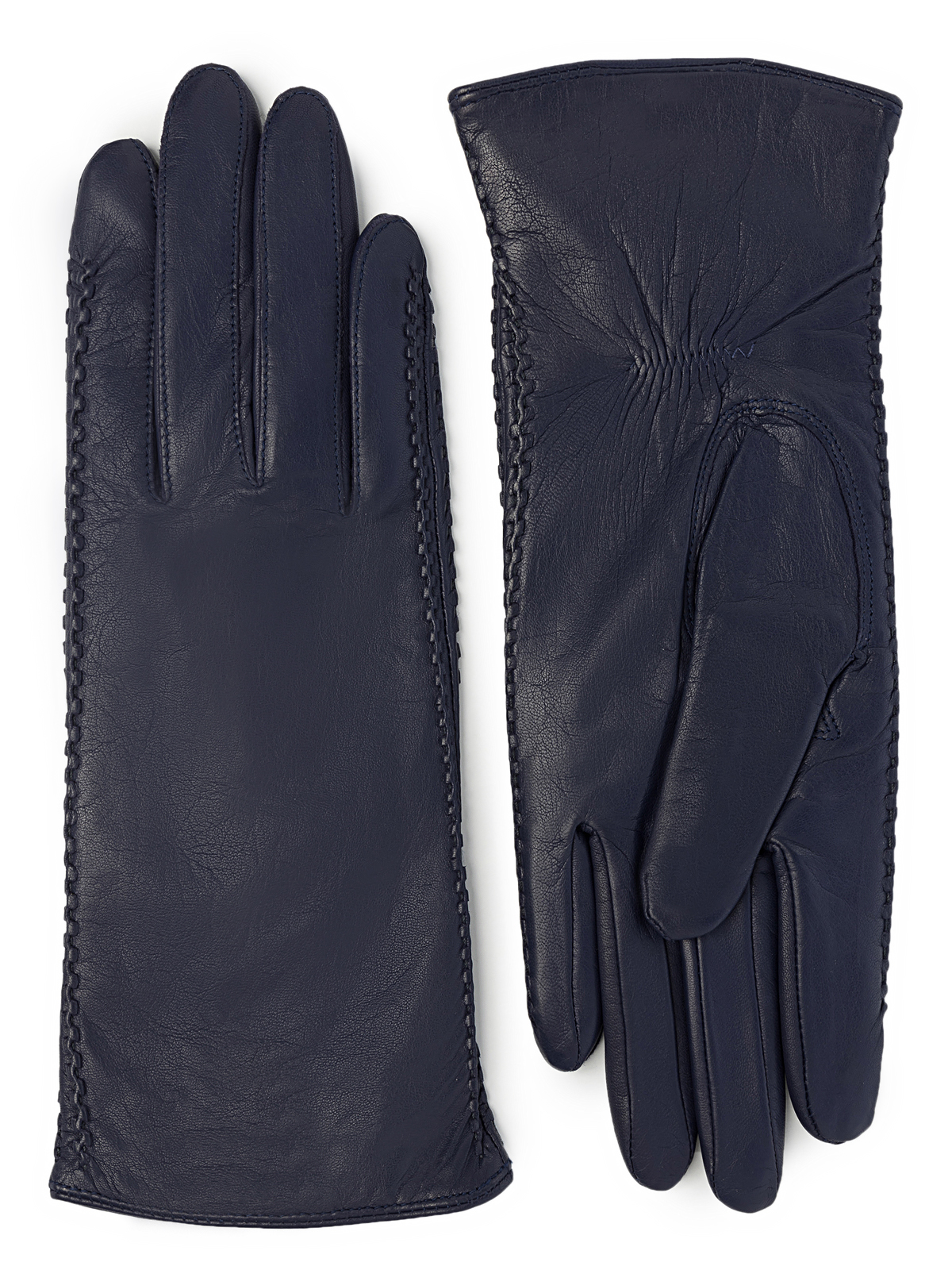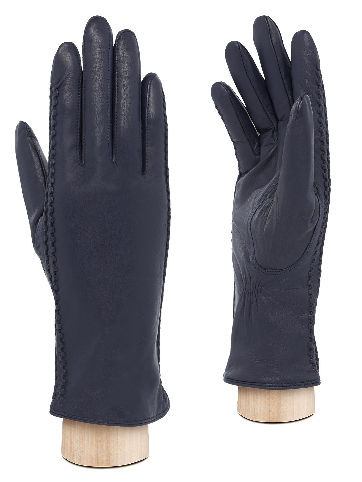 Перчатки женские торговой марки ELEGANZZA из натуральной кожи ягнёнка производства Италия. Подкладка: 85% шерсть + 15% кашемир. Отделка - два декоративных шва метеор": вдоль указательного пальца и мизинца. Нижний край перчатки окантован. Длина манжеты от нижней точки большого пальца до края перчаток - 75 см. Длина пальцев - средняя."