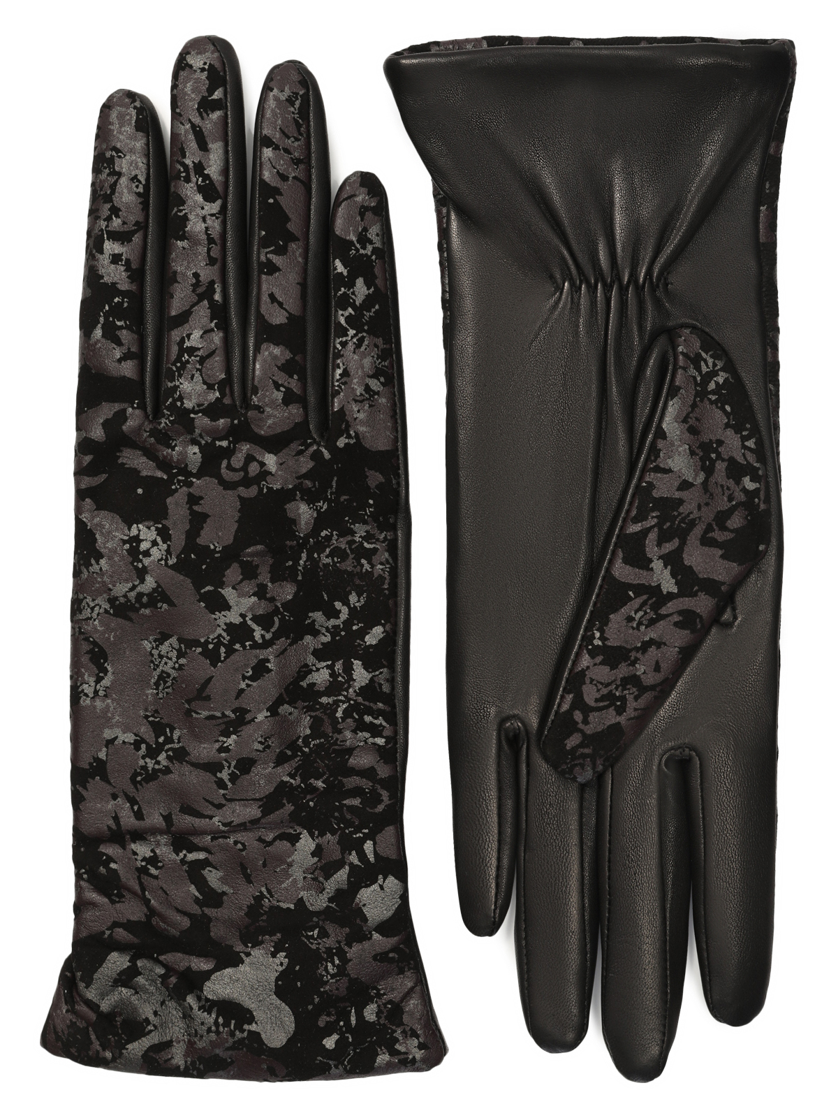 Перчатки женские торговой марки ELEGANZZA из натуральной кожи ягненка. Производство Италия. Подкладка: 85% шерсть 15% кашемир. Лицевая сторона перчатки выполнена из натурального велюра с дизайнерским принтом ладонная часть из натуральной кожи ягненка. Длина манжеты от нижней точки большого пальца до края перчаток - 7 см. Длина пальцев - средняя.