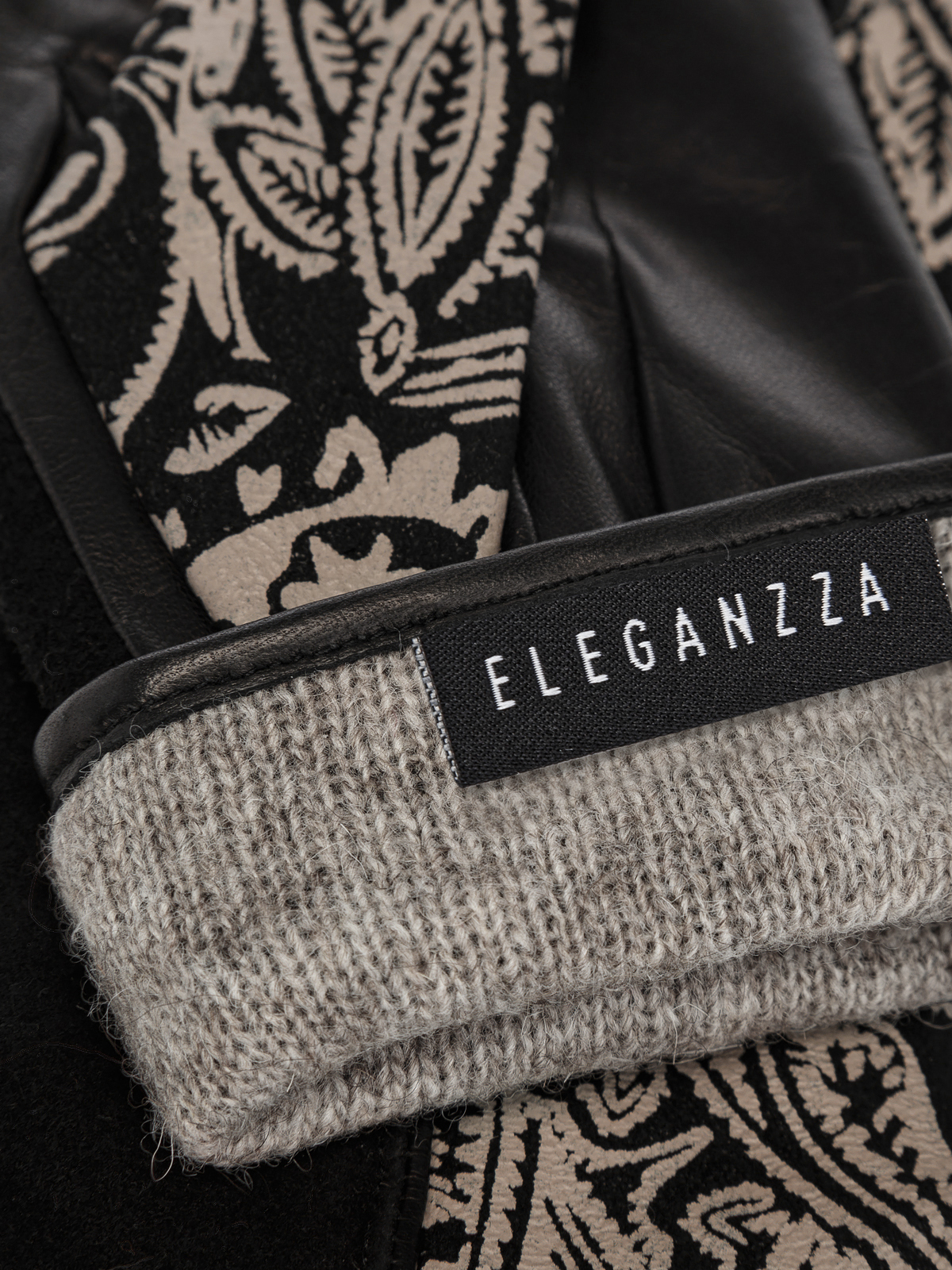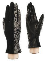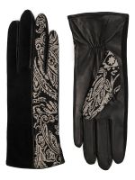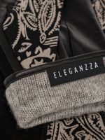 Перчатки женские торговой марки ELEGANZZA из натуральной кожи ягненка. Подкладка: 85% шерсть 15% кашемир. Лицевая сторона перчатки комбинирована половина выполнена из натурального велюра основного цвета вторая половина из натурального велюра с дизайнерским принтом PAISLEY". Ладонная часть - натуральная кожа ягненка. Длина манжеты от нижней точки большого пальца до края перчаток - 65 см. Длина пальцев - средняя."