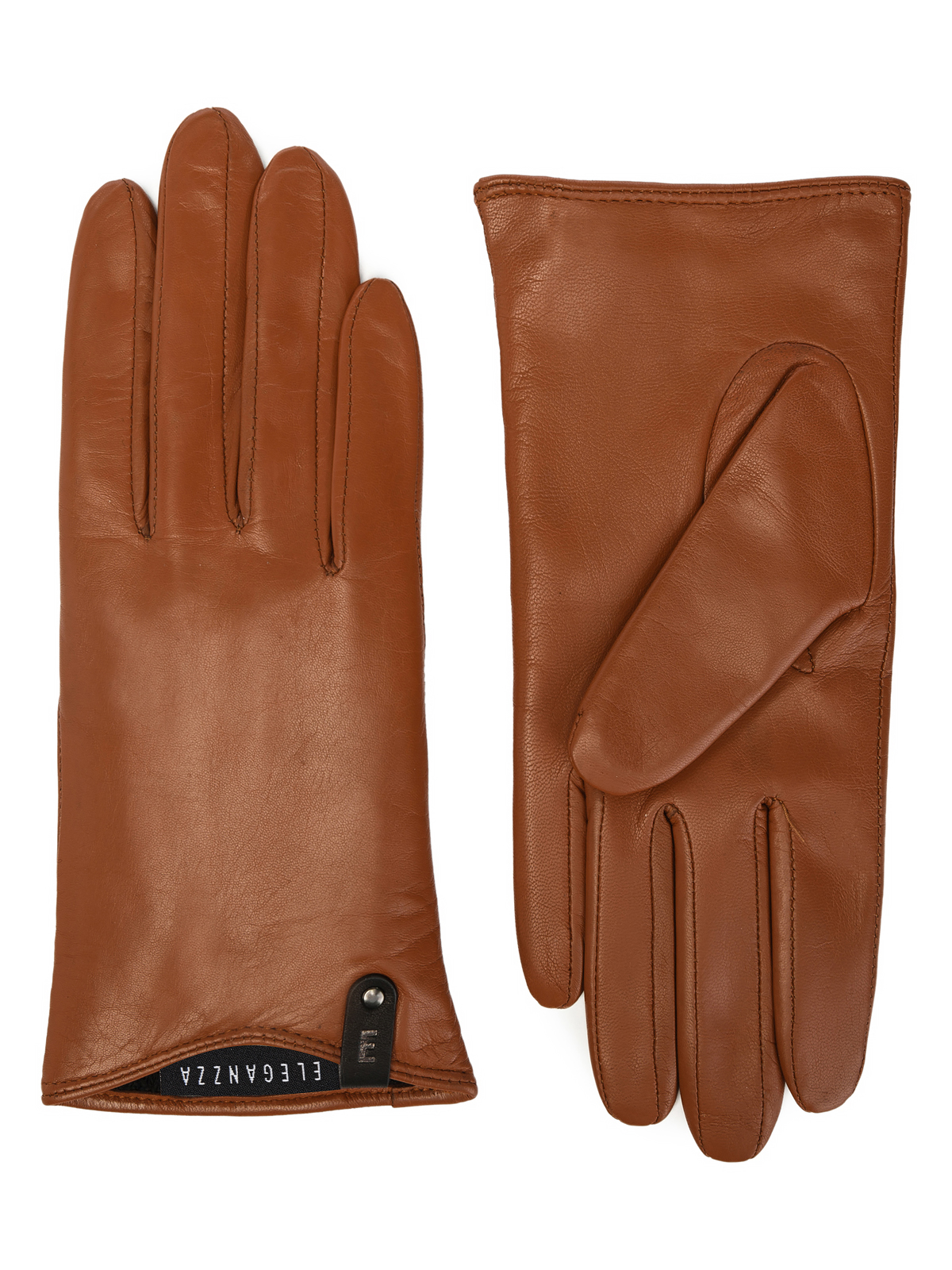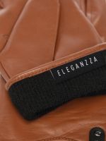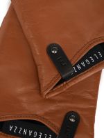 Перчатки женские торговой марки ELEGANZZA из натуральной кожи ягненка. Подкладка черного цвета 85% шерсть 15% кашемир. Декоративная отделка - кожаная петелька с фирменным штампом из плотной кожи закрепленная черным матовым хольнитеном. Длина манжеты от нижней точки большого пальца до края перчаток - 3 см. Длина пальцев - средняя.