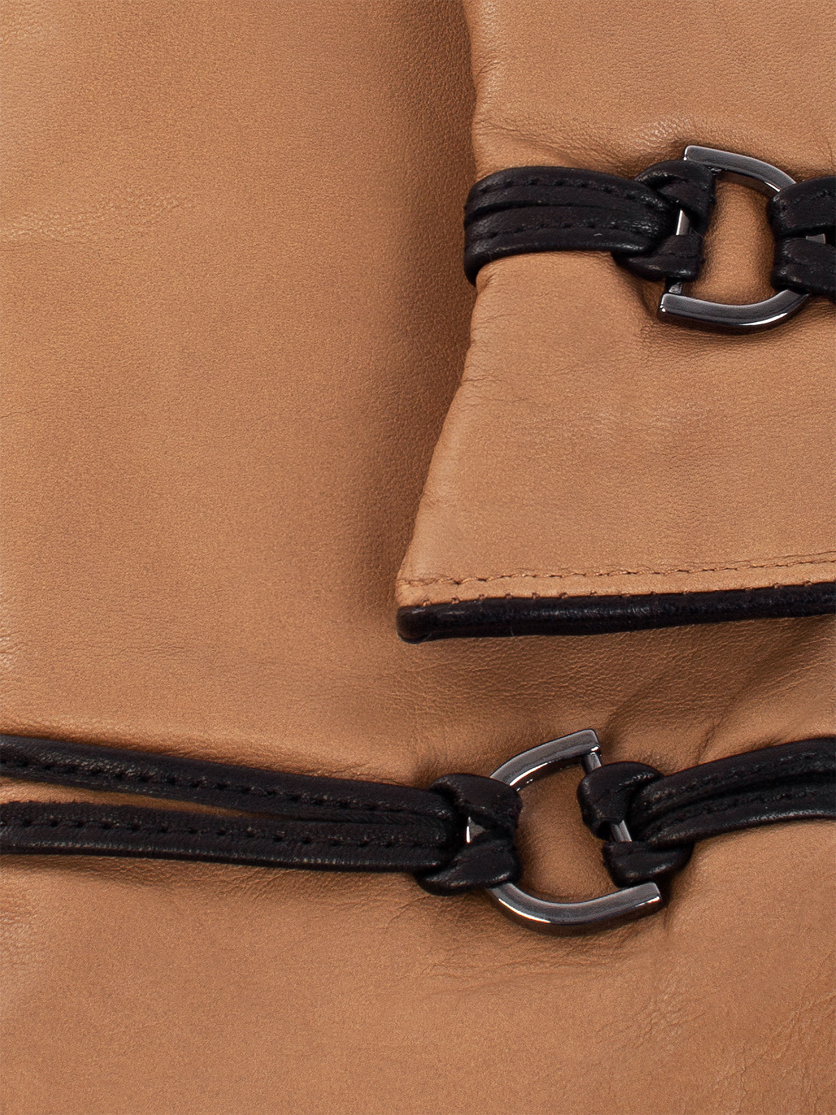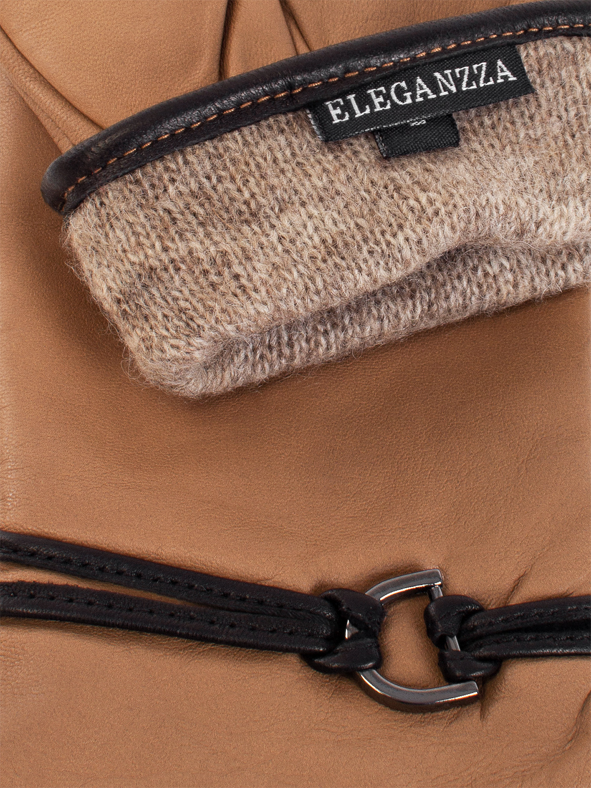 Перчатки торговой марки ELEGANZZA выполнены из натуральной кожи ягненка производства Италии. Подкладка: 85% шерсть 15% кашемир. Отделка тонкими кожаными шнурками закрепленными в шов и фурнитуру цвета никель. Длина манжеты от нижней точки большого пальца до края перчаток - 6 см. Длина пальцев - средняя.