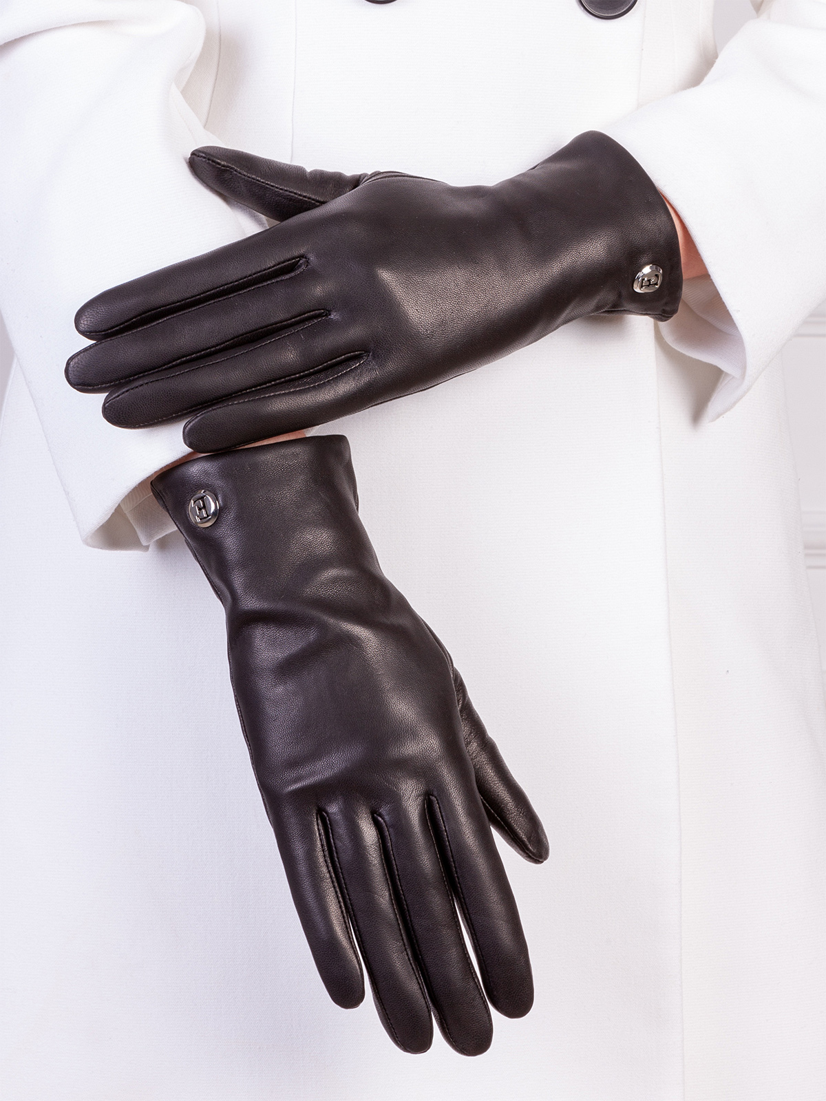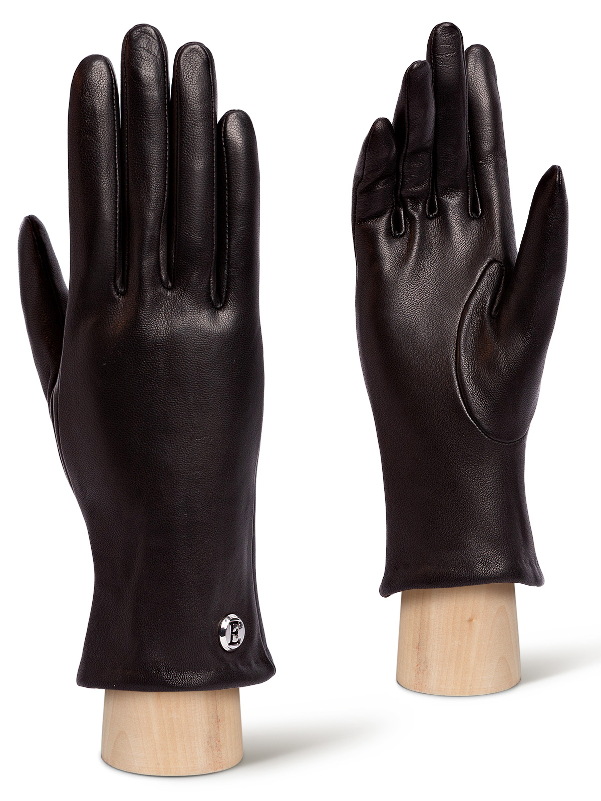 Перчатки женские торговой марки ELEGANZZA. Выполнены из эксклюзивной итальянской кожи ягнёнка на подкладе из шерстяной пряжи с добавлением кашемира. Манжеты украшены небольшой металлической эмблемой. Модель с удлиненными пальцами длина манжеты от нижней точки большого пальца до края перчаток - 6 см.